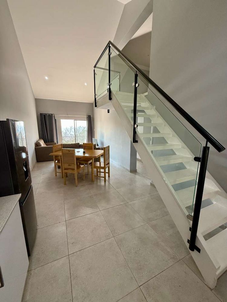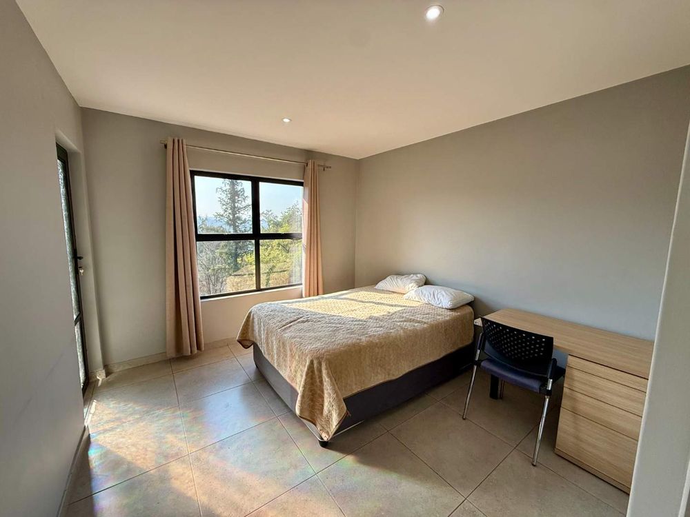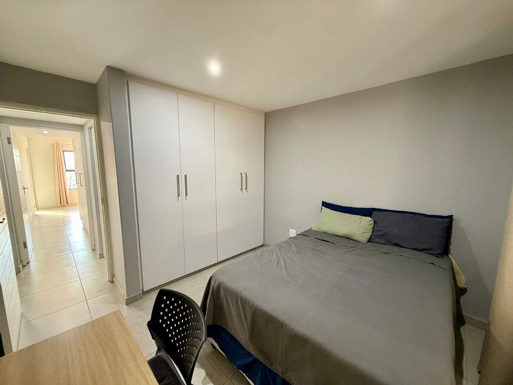 Inspired by Pietermaritzburg’s signature redbrick architecture, the apartment features clean lines and a minimalist aesthetic. The open-plan living area includes a sleek kitchen and a lounge, with tiled flooring throughout for a fresh and low-maintenance finish. Glass sliding doors lead to a private, elevated balcony, perfect for relaxed mornings or unwinding after work.