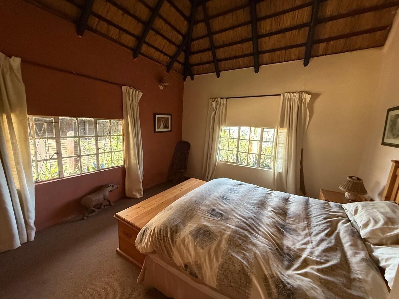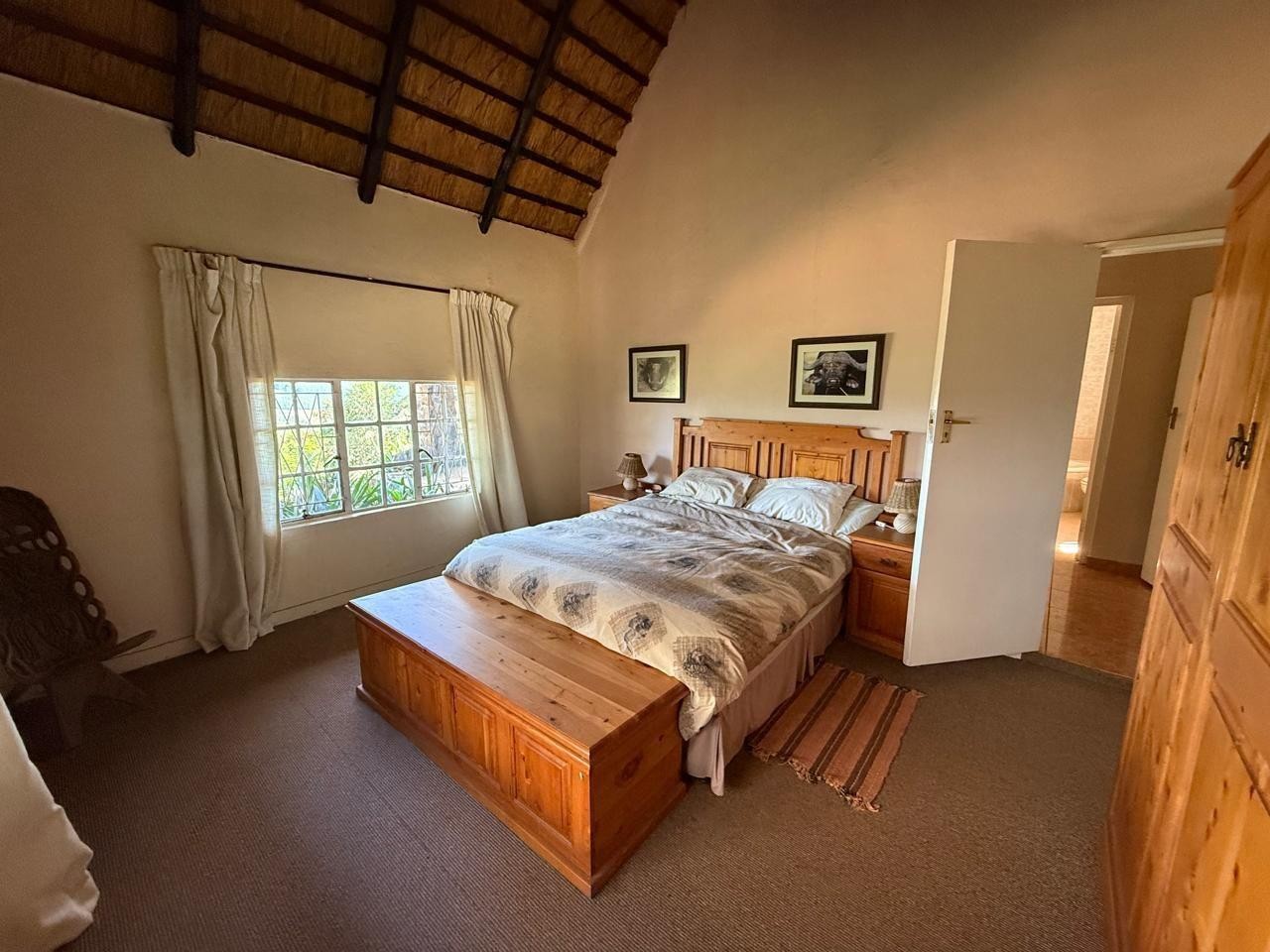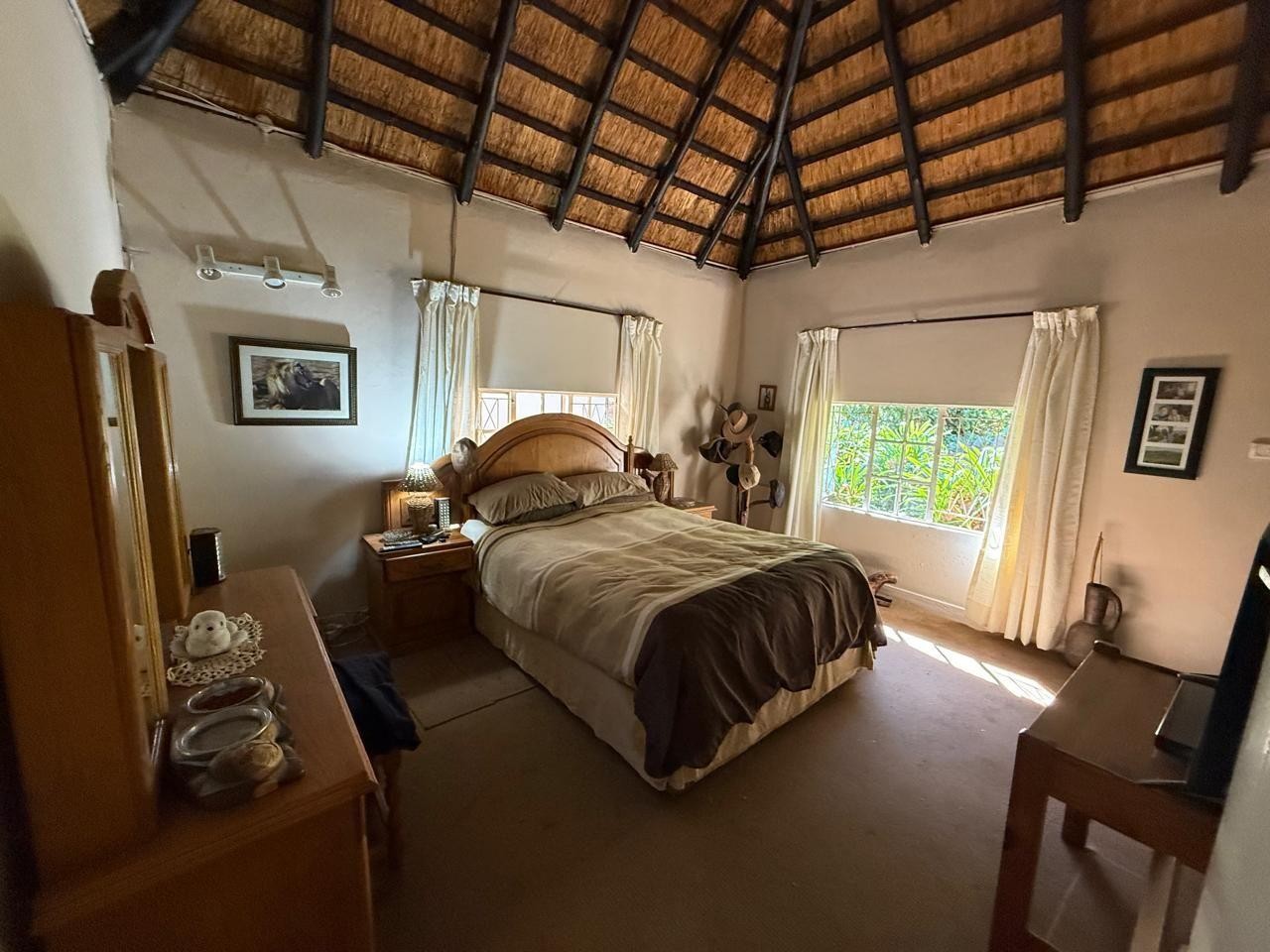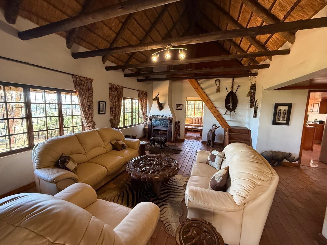 Open-Plan Living & Dining - High ceilings under a characterful gum pole and thatch roof create a warm, inviting atmosphere