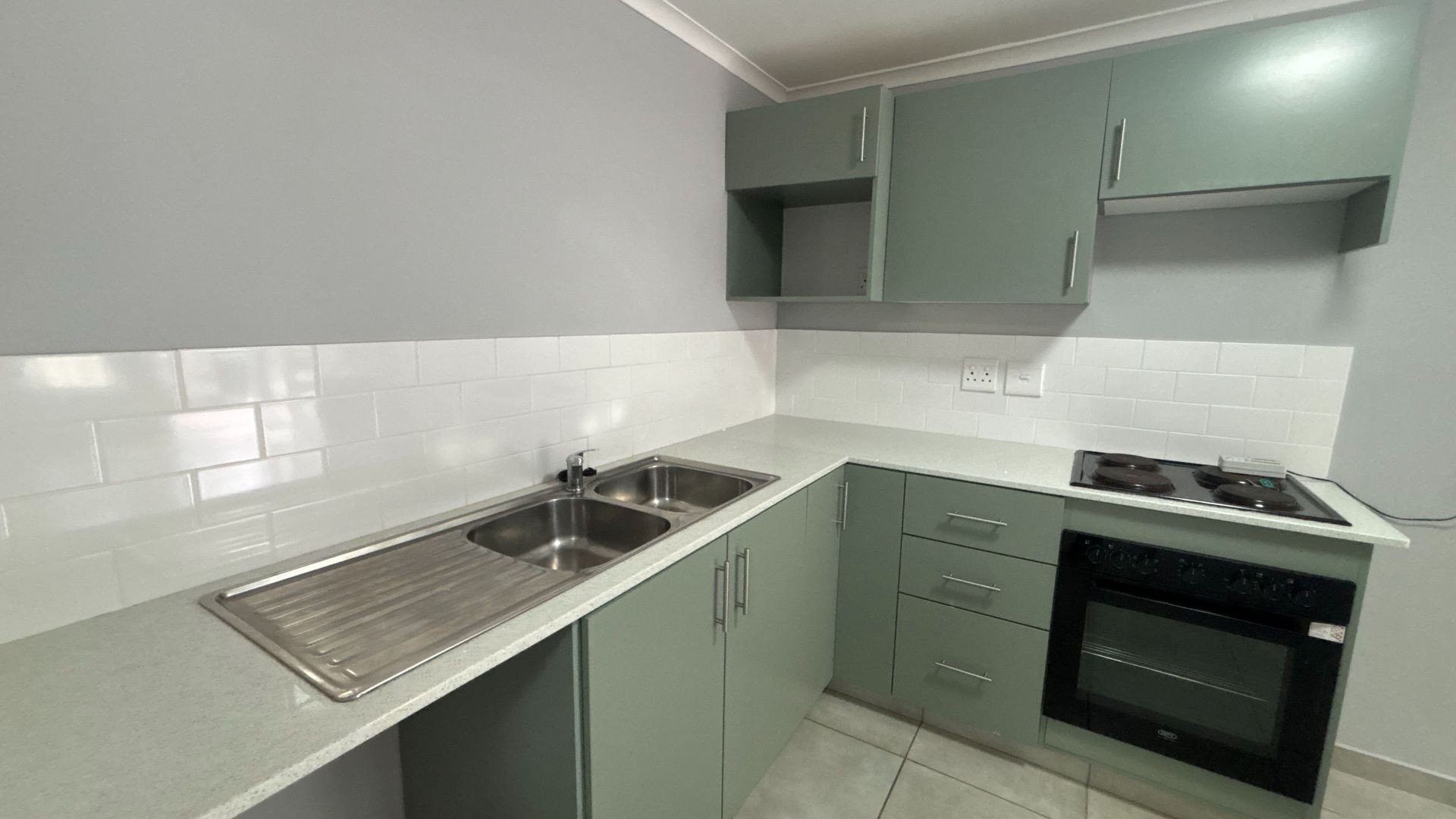 Kitchen: Integrated electric oven and stove.