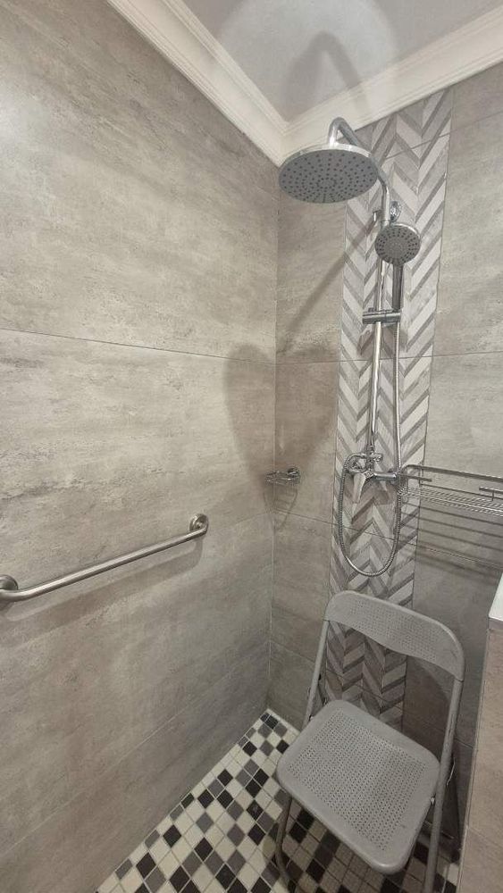 Step into a bright, open-plan space that cleverly separates your tiled lounge and bedroom area, giving you a cosy living zone while still feeling open and airy. The bathroom features a spacious walk-in shower, complete with a sliding handheld shower head and a support rail for added safety.