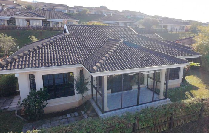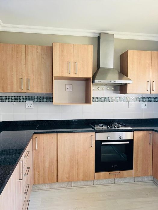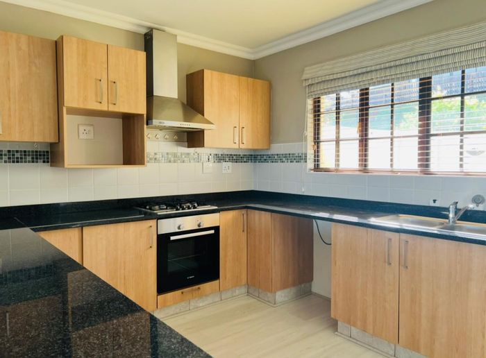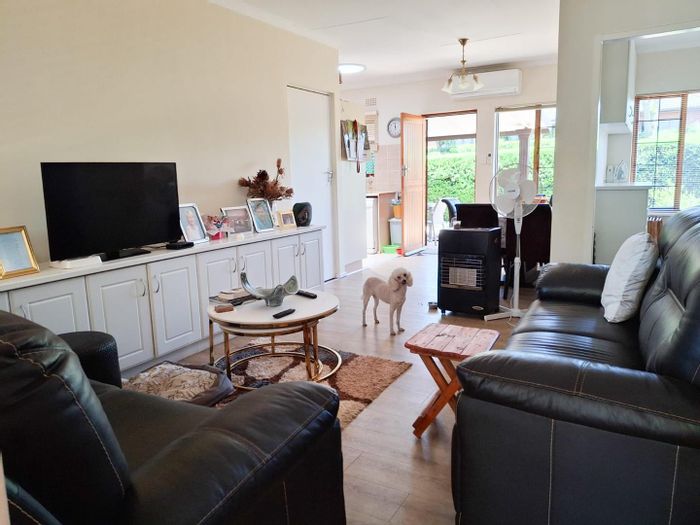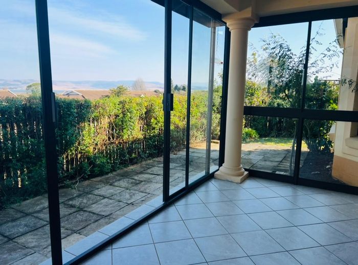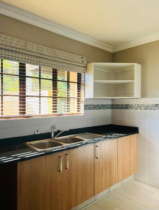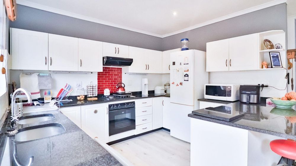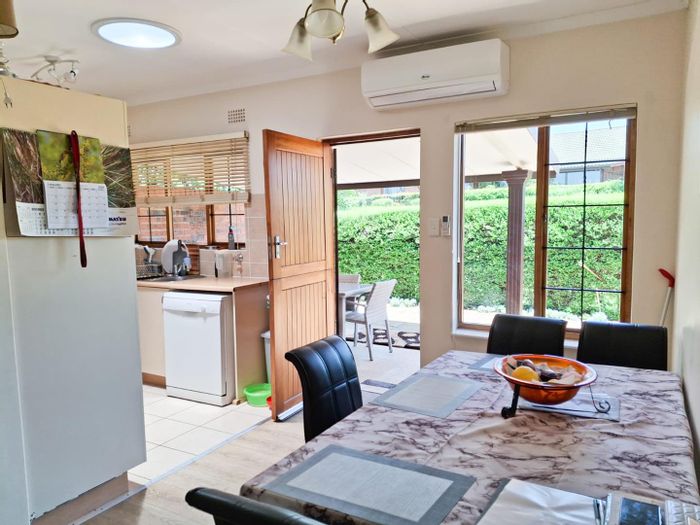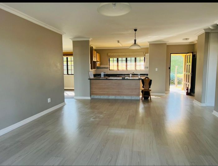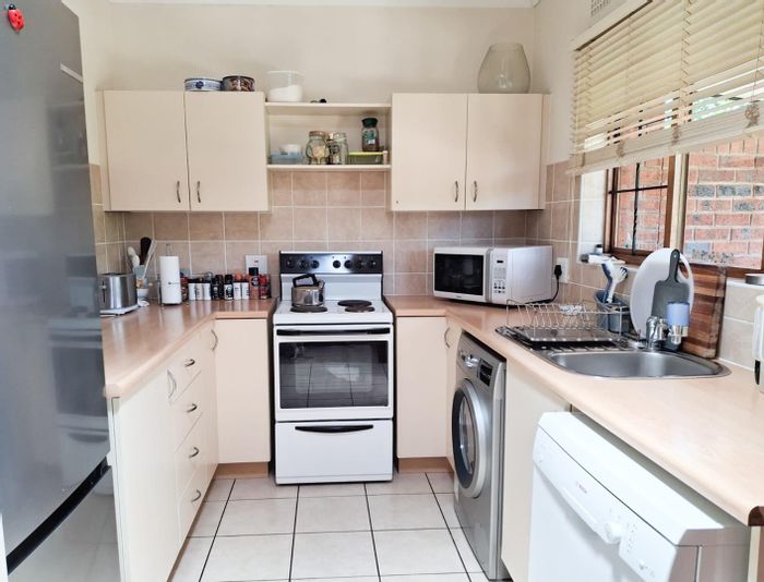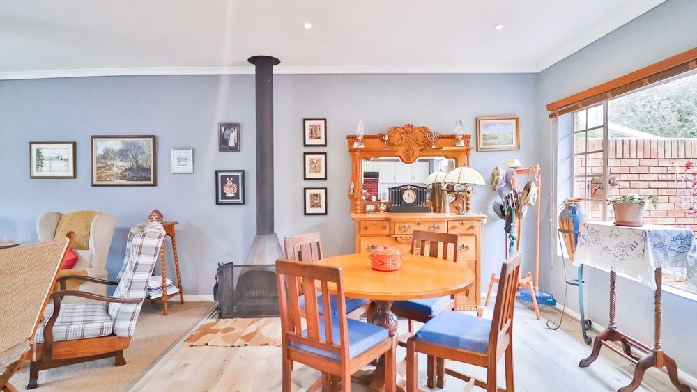 Step through a side arch onto a walkway in a small, private garden and into the enclosed patio through a sliding glass door. This is where you will spend a lot of your time, admiring the abundant birdlife, which includes malachite sunbirds, red-chested sunbirds, kingfishers and even fish eagles. The open-plan living area, where a freestanding fireplace stands between the carpeted lounge and dining space, adds warmth in the winter months. The adjoining kitchen and dining area are finished with laminate flooring. The kitchen boasts marble countertops, a breakfast counter, fitted oven, hob and extractor, a double sink, and space for one appliance.