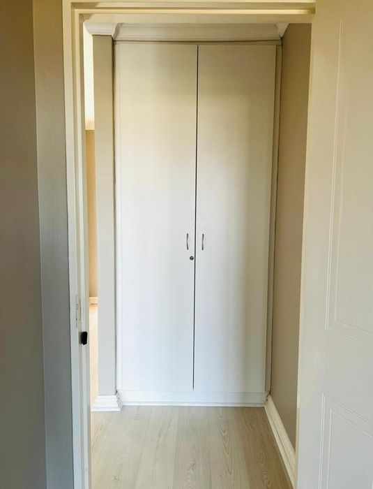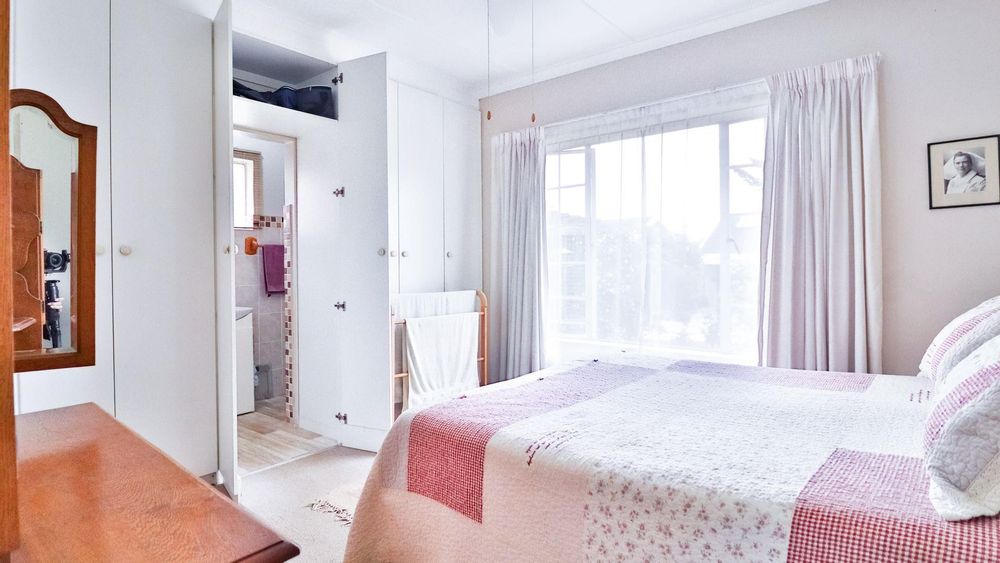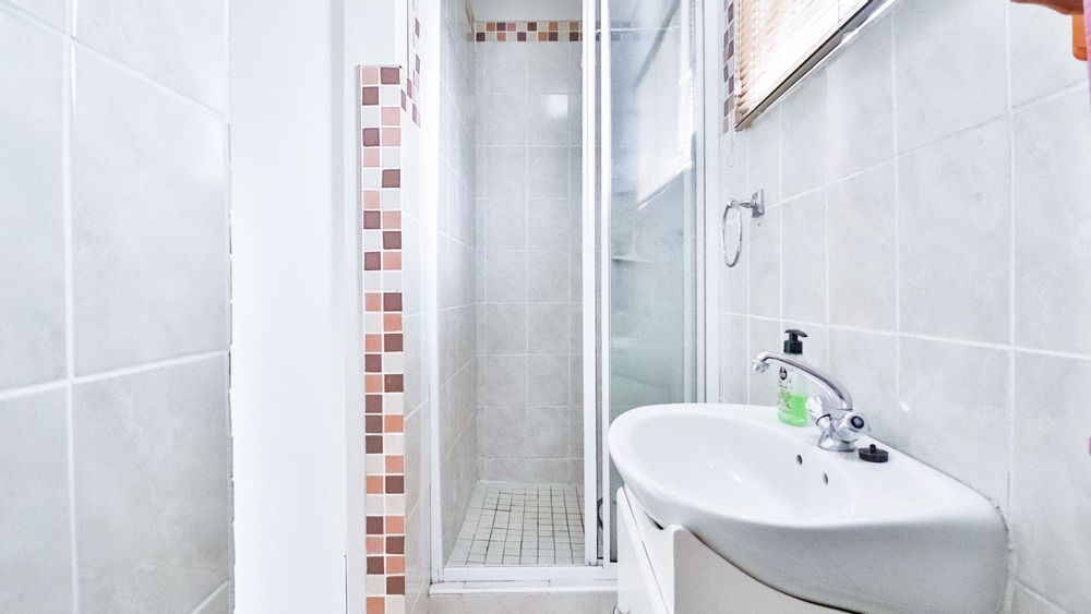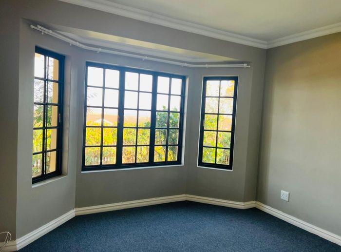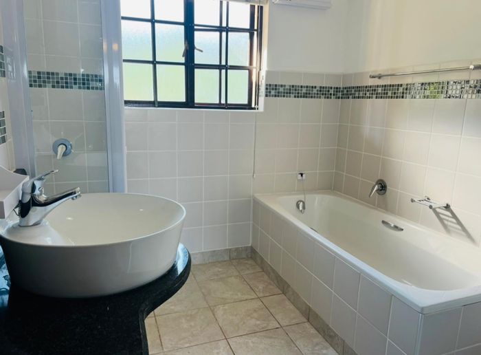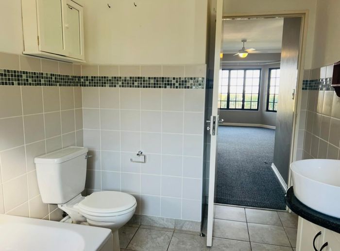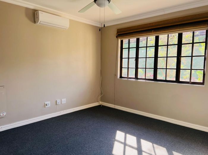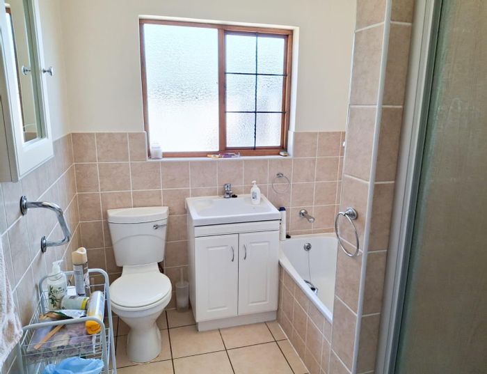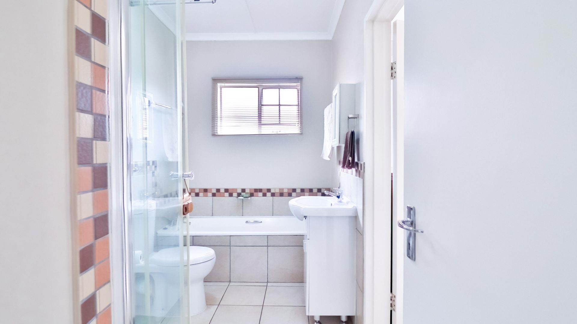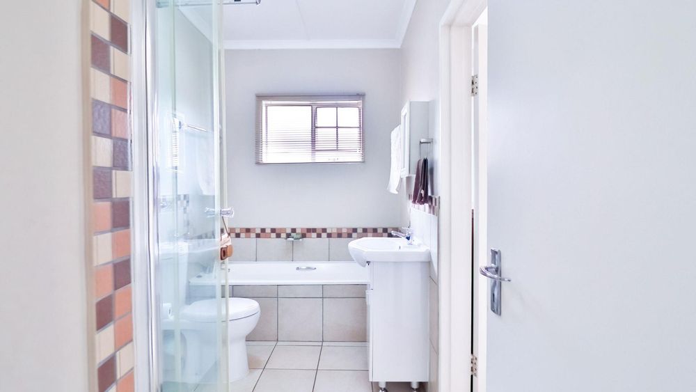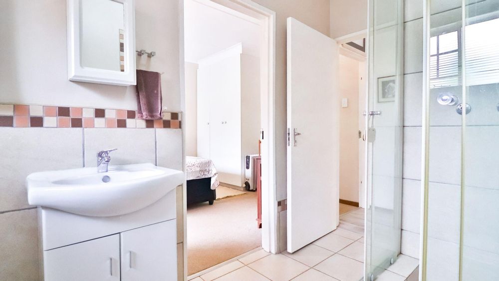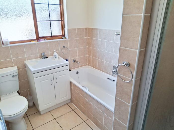 The home offers three carpeted bedrooms with built-in cupboards. Two of the bedrooms are ensuite: the first bathroom is fitted with both a bath and a shower, with access from the bedroom as well as the passage, serving as either an ensuite or a family bathroom. The second ensuite has a shower, and the bedroom has a ceiling fan.