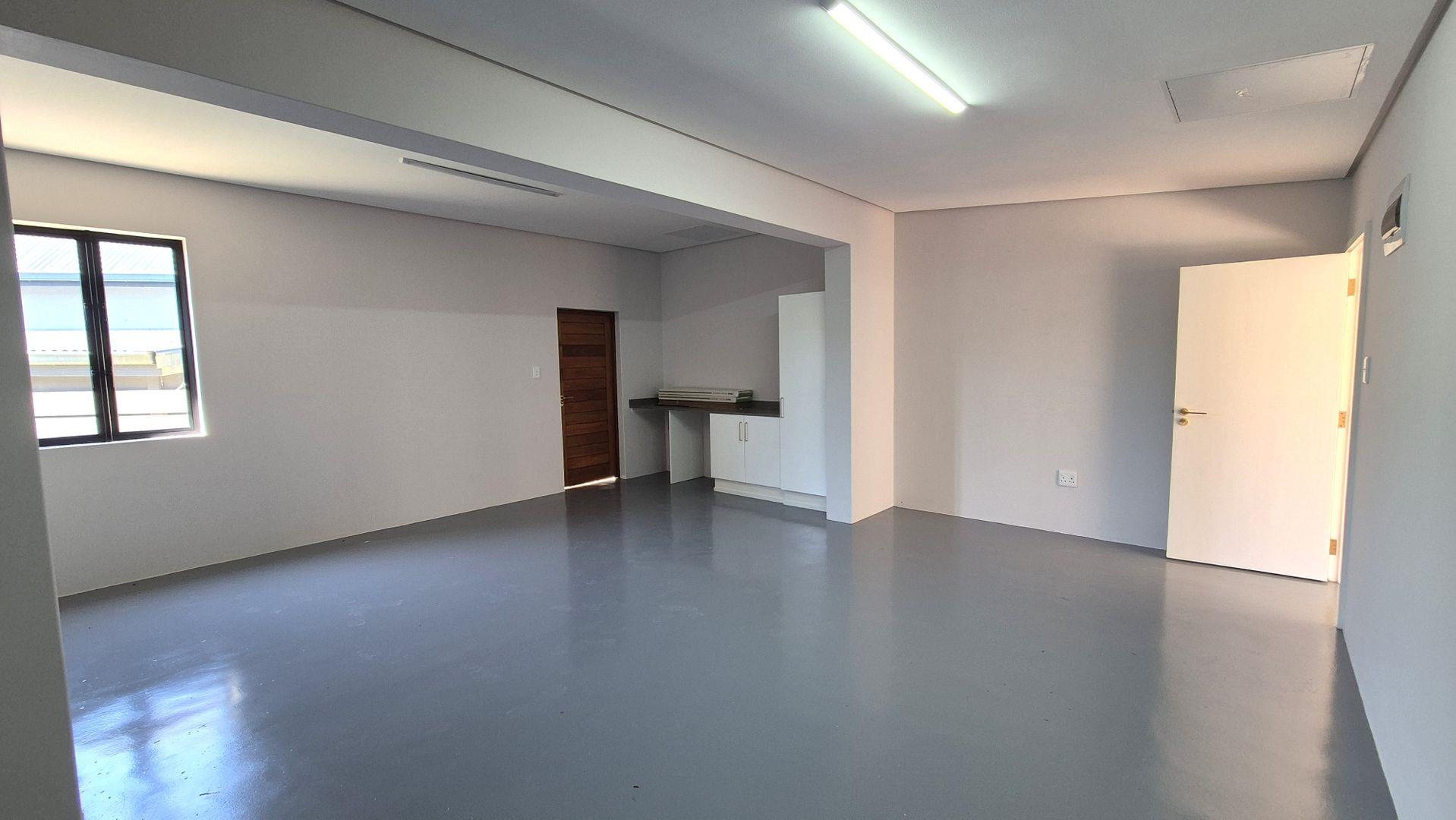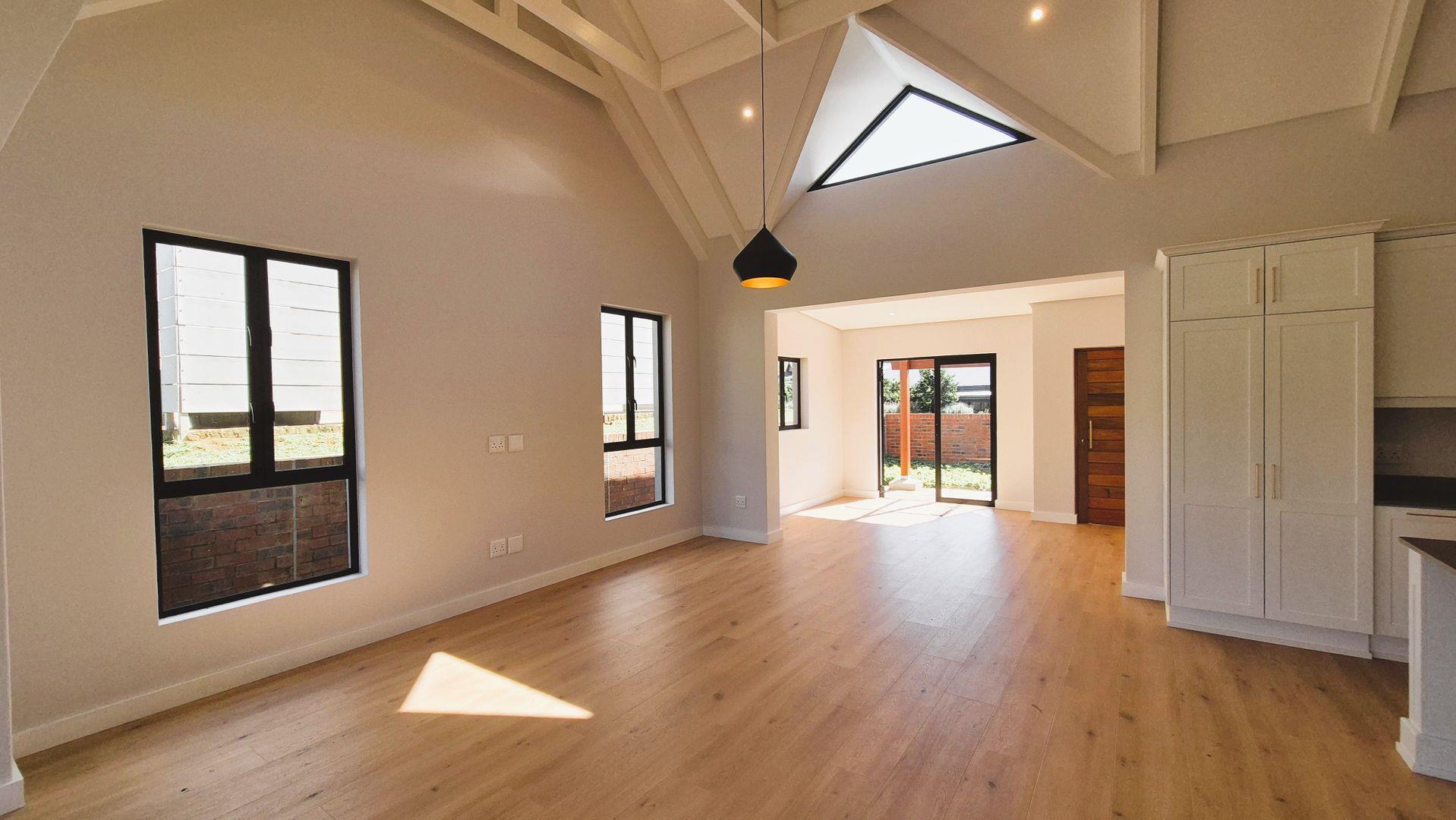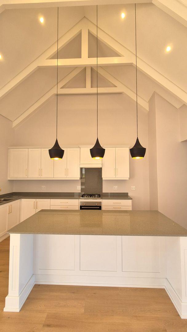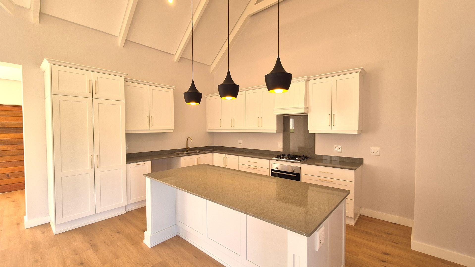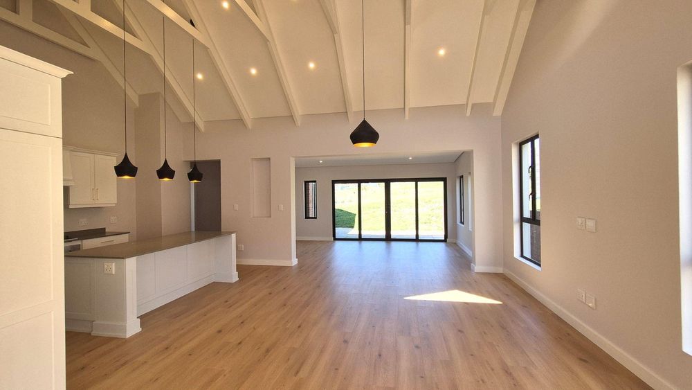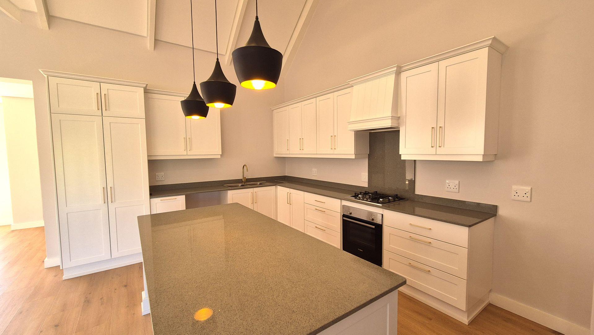 The heart of the home embraces a spacious open-plan lounge, dining room, and kitchen, boasting laminate flooring, soaring ceilings adorned with exposed beams, and an abundance of natural light pouring in through expansive aluminum windows. The kitchen is a culinary haven, featuring sleek quartz countertops, an inviting island, a double sink, an undercounter oven, gas hob and extractor fan, and space for one of your undercounter appliances.