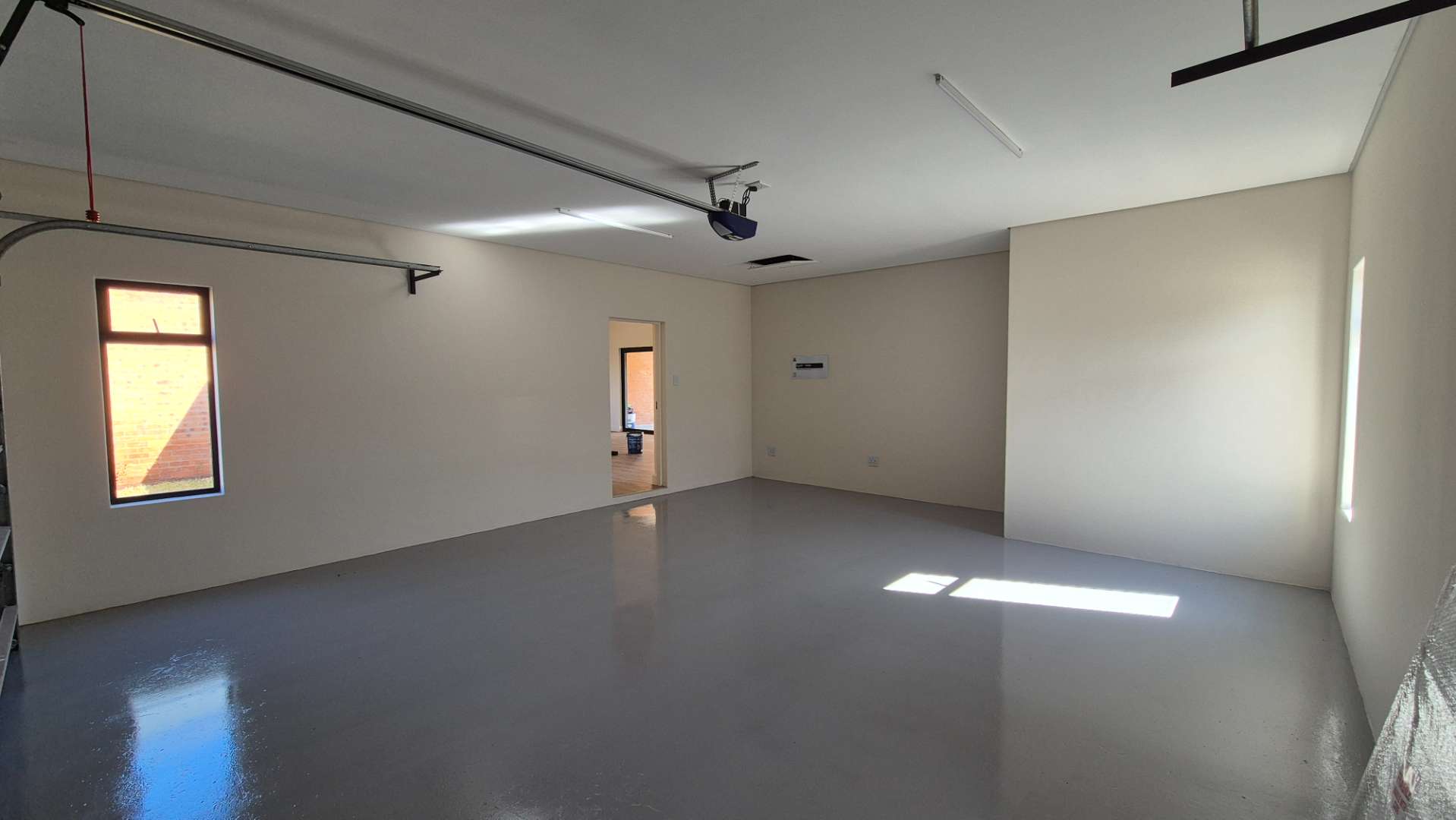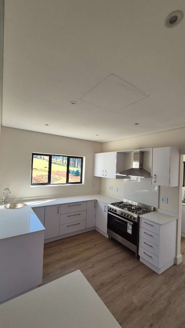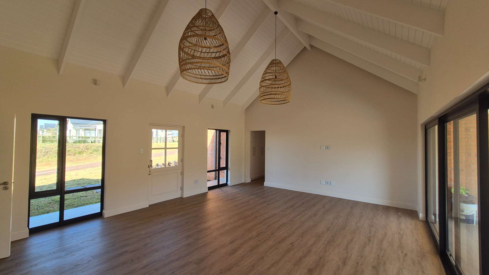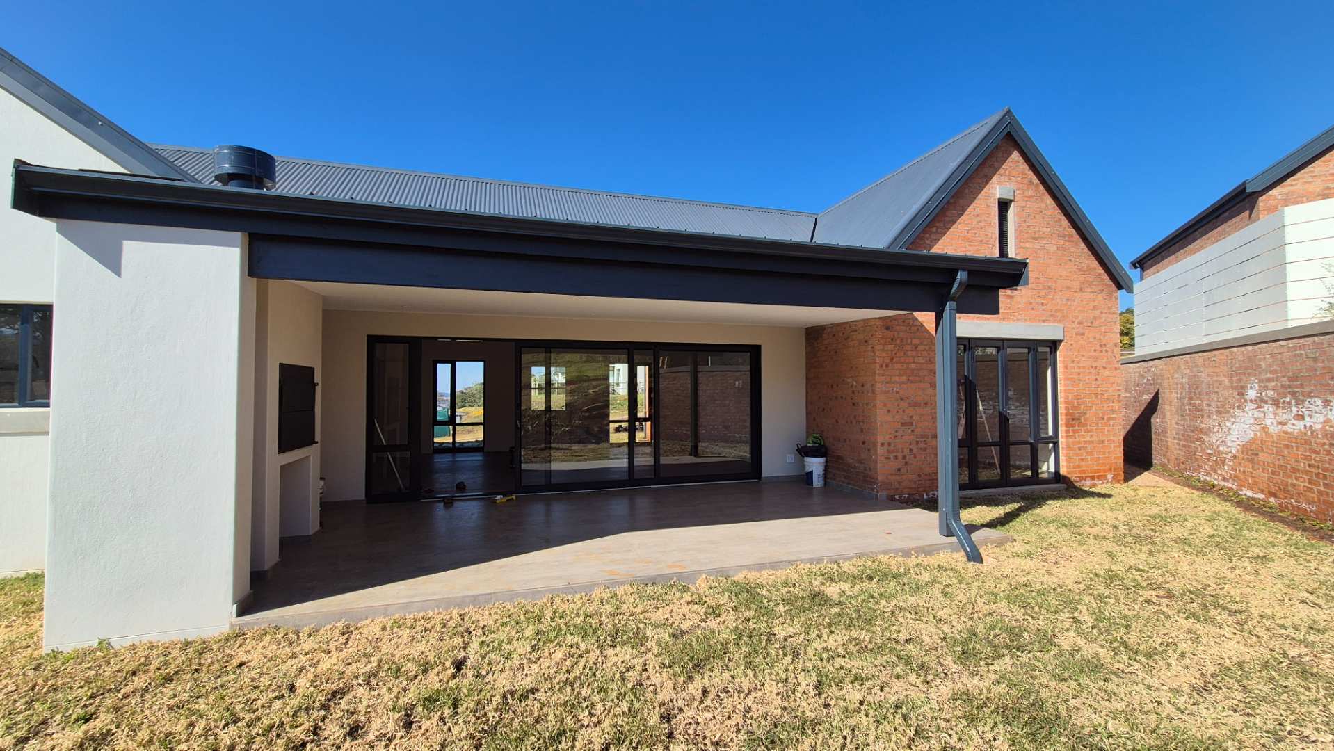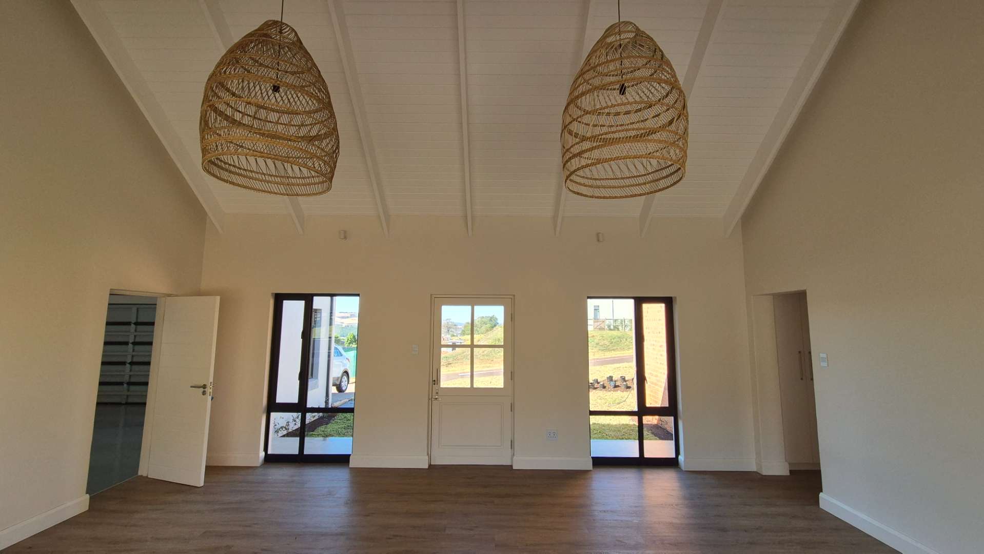 The lounge boasts extra-high ceilings with exposed beams and opens out through large sliding doors to a generous semi-enclosed patio with a built-in braai – ideal for year-round entertaining. The landscaped garden is newly established and easy to maintain.