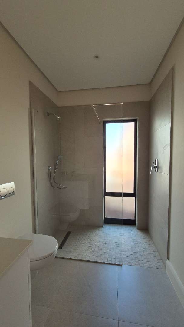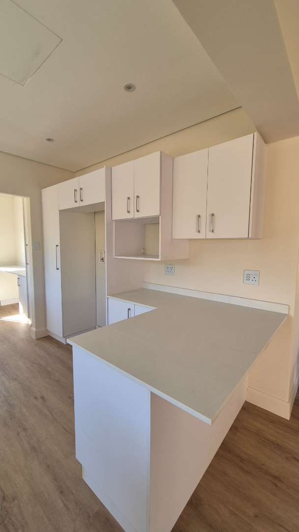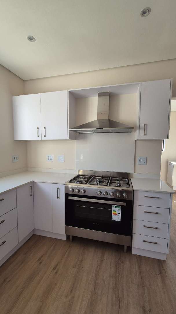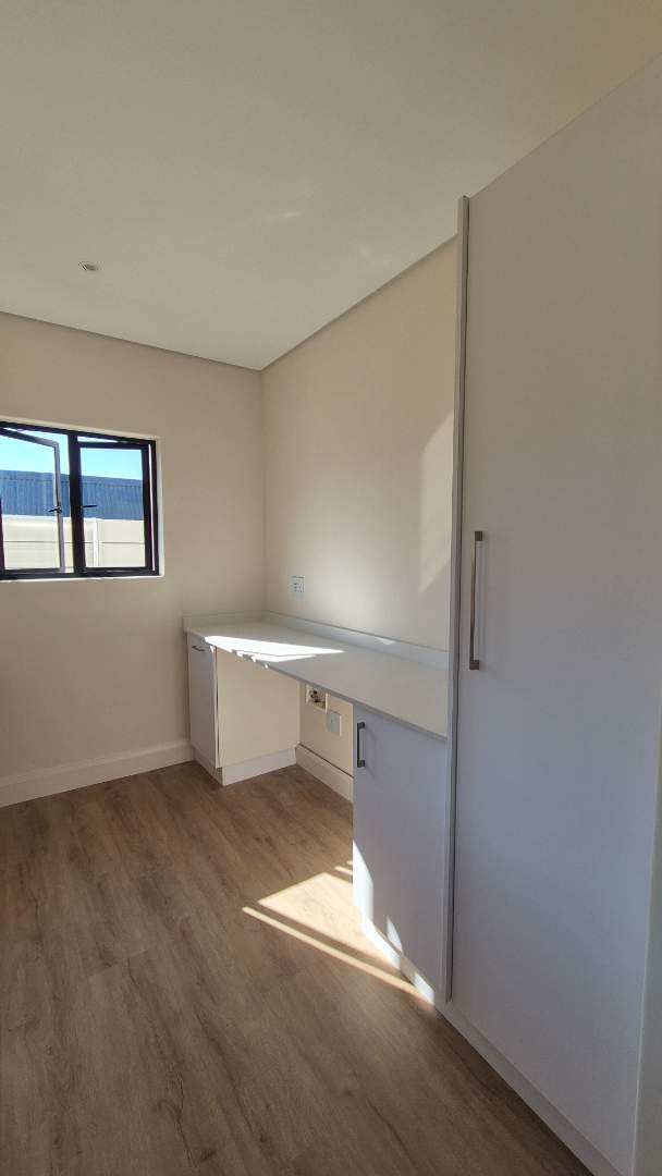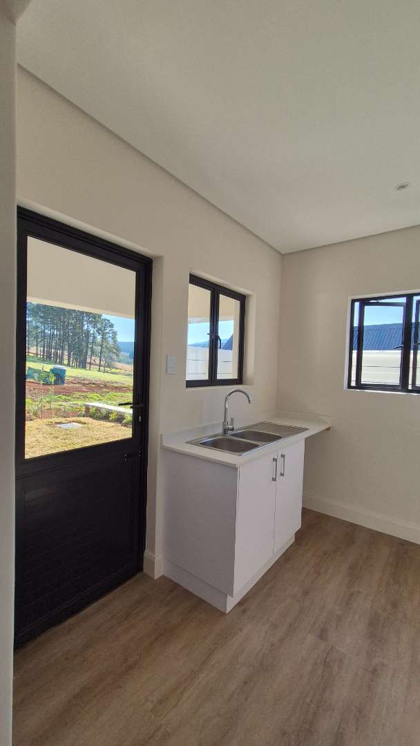 The heart of the home is a spacious open-plan lounge, dining, and kitchen area, all laid with stylish vinyl flooring. The kitchen is both functional and elegant, featuring a breakfast bar, ample cabinetry, an undercounter oven, hob, extractor fan, prep bowl, and a separate scullery with a double sink and a back door leading to a small patio. Just around the corner, you’ll find an elongated service courtyard complete with an additional outdoor sink.