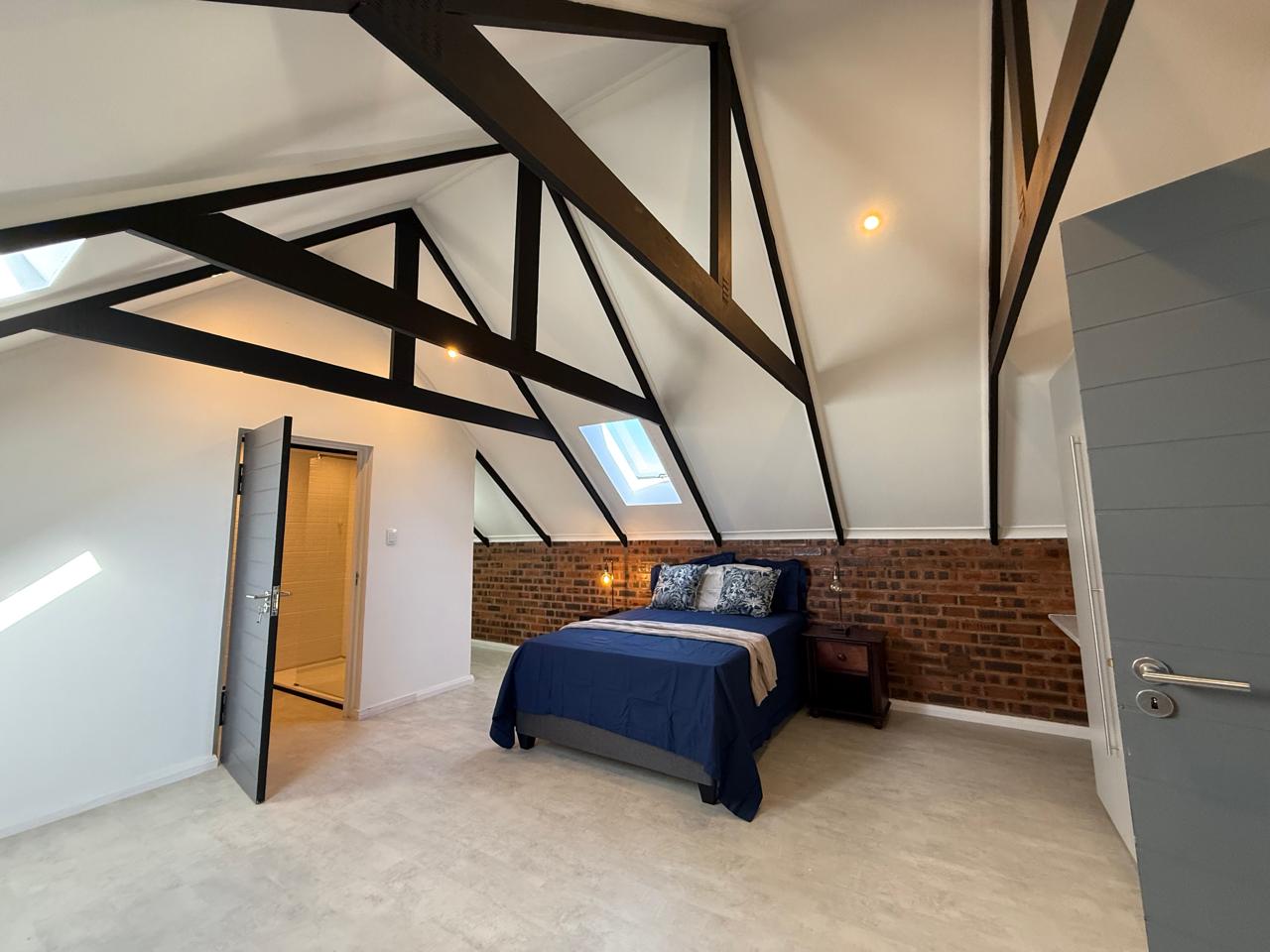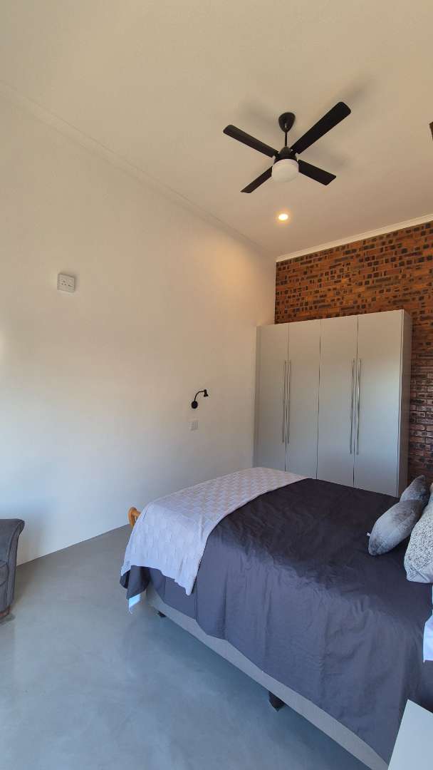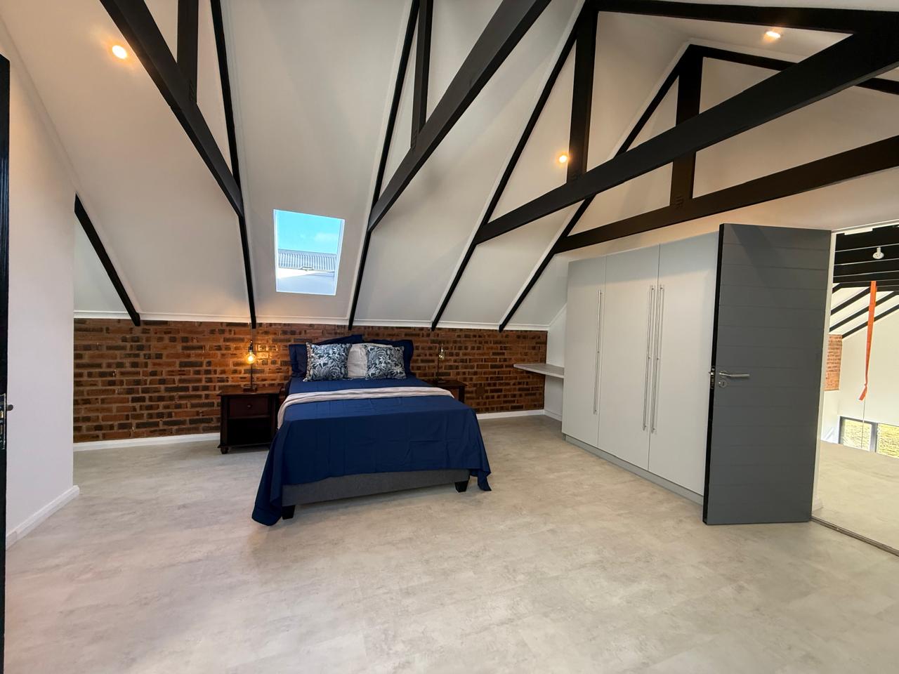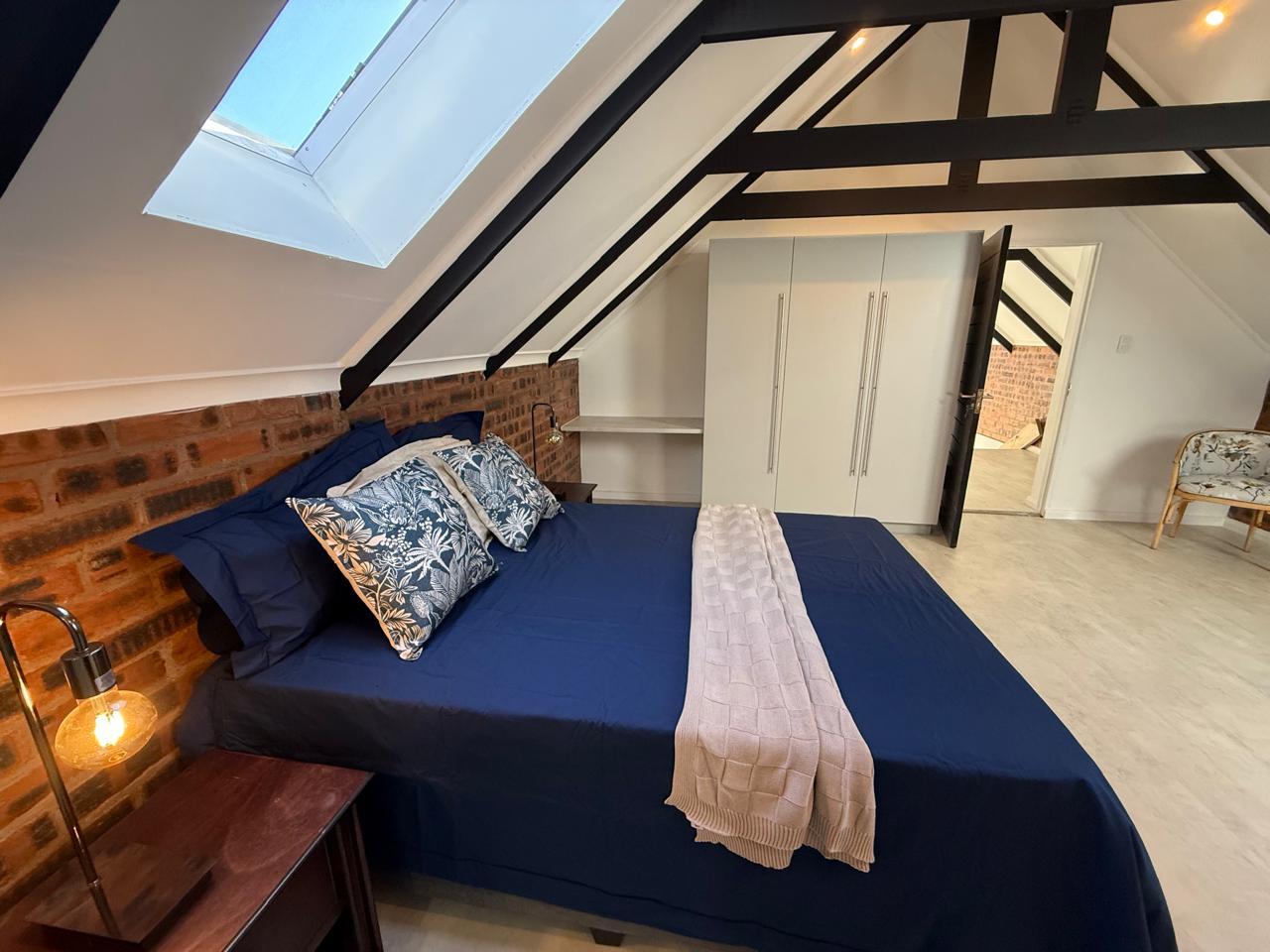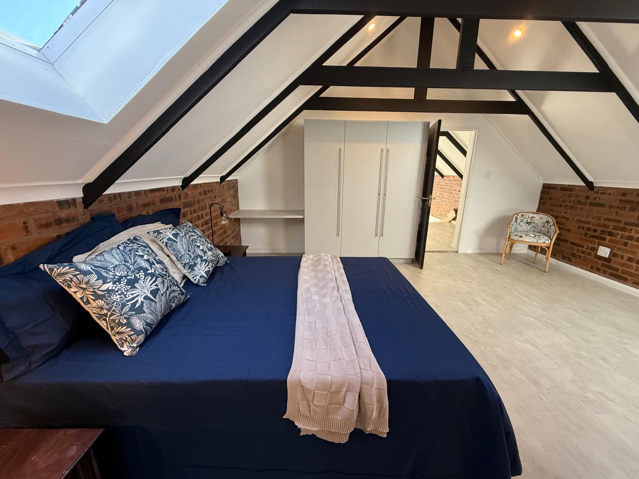 A wooden staircase takes you up to a mezzanine loft with its own balcony overlooking the lounge, ideal for a study or a small lounge for the guest suite. The bedroom upstairs is spacious and has an en-suite bathroom featuring a large shower. Downstairs, the passage, with handy sensor lighting and a linen cupboard, leads you to the other two bedrooms. The family bathroom has a large open shower. The main bedroom has a ceiling fan and enjoys access to the side garden. The ensuite bathroom has an open shower, as well as a double basin, and it enjoys access to the side garden. Both bedrooms are fitted with stylish overhead bedside lamps.