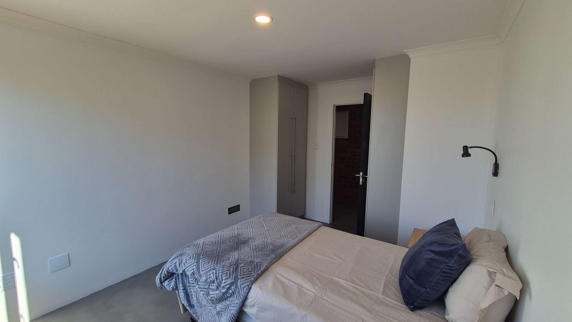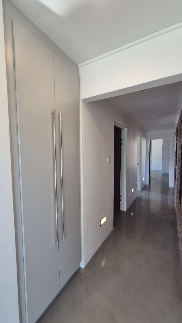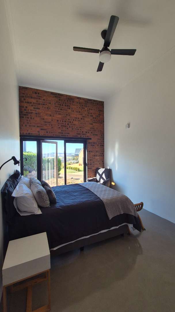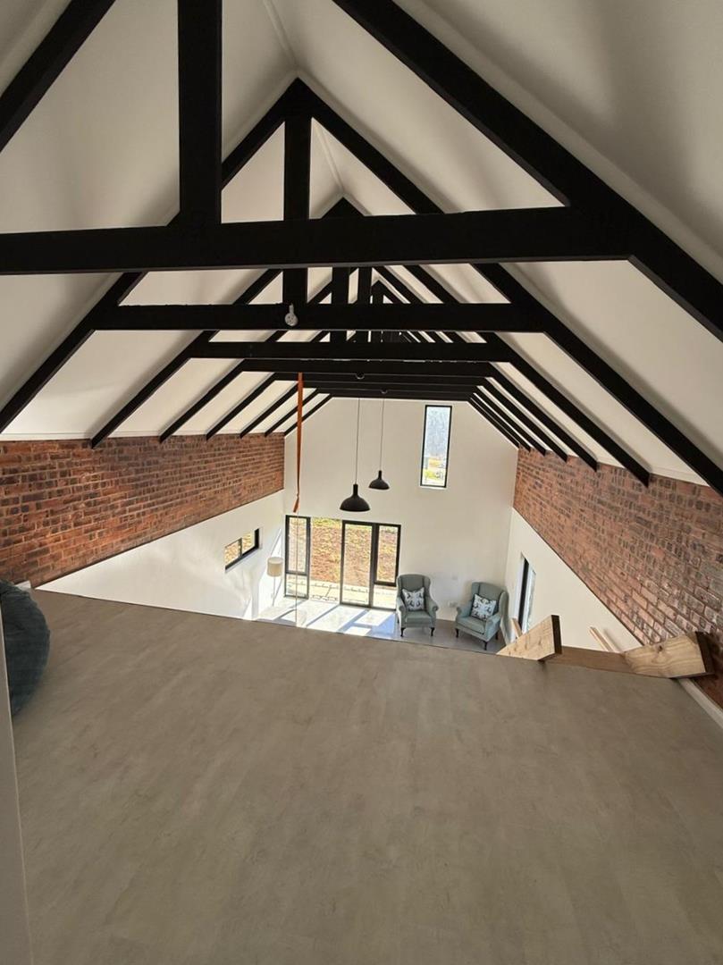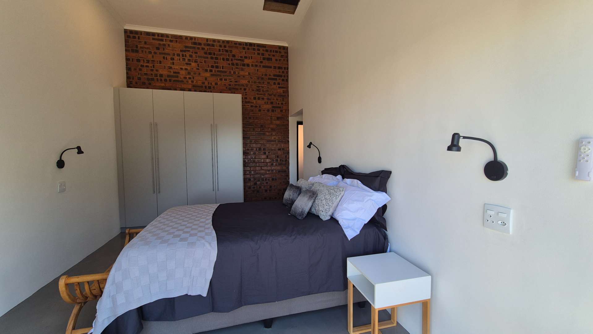 A wooden staircase takes you up to a mezzanine loft with its own balcony overlooking the lounge, ideal for a study or a small lounge for the guest suite. The bedroom upstairs is spacious and has an en-suite bathroom featuring a large shower. Downstairs, the passage, with handy sensor lighting and a linen cupboard, leads you to the other two bedrooms. The family bathroom has a large open shower. The main bedroom has a ceiling fan and enjoys access to the side garden. The ensuite bathroom has an open shower, as well as a double basin, and it enjoys access to the side garden. Both bedrooms are fitted with stylish overhead bedside lamps.