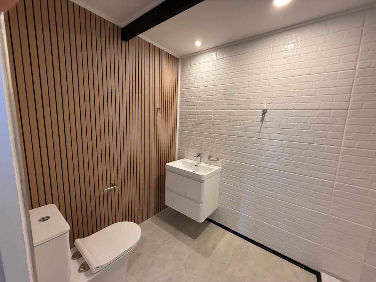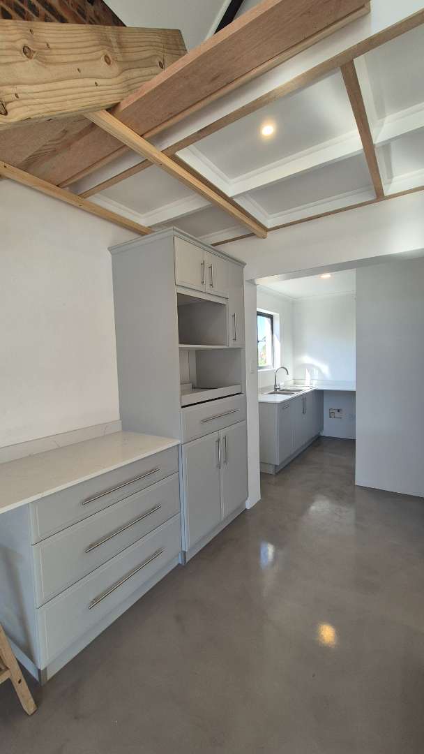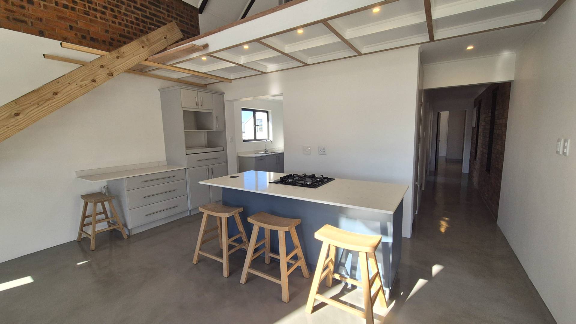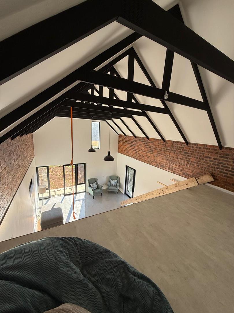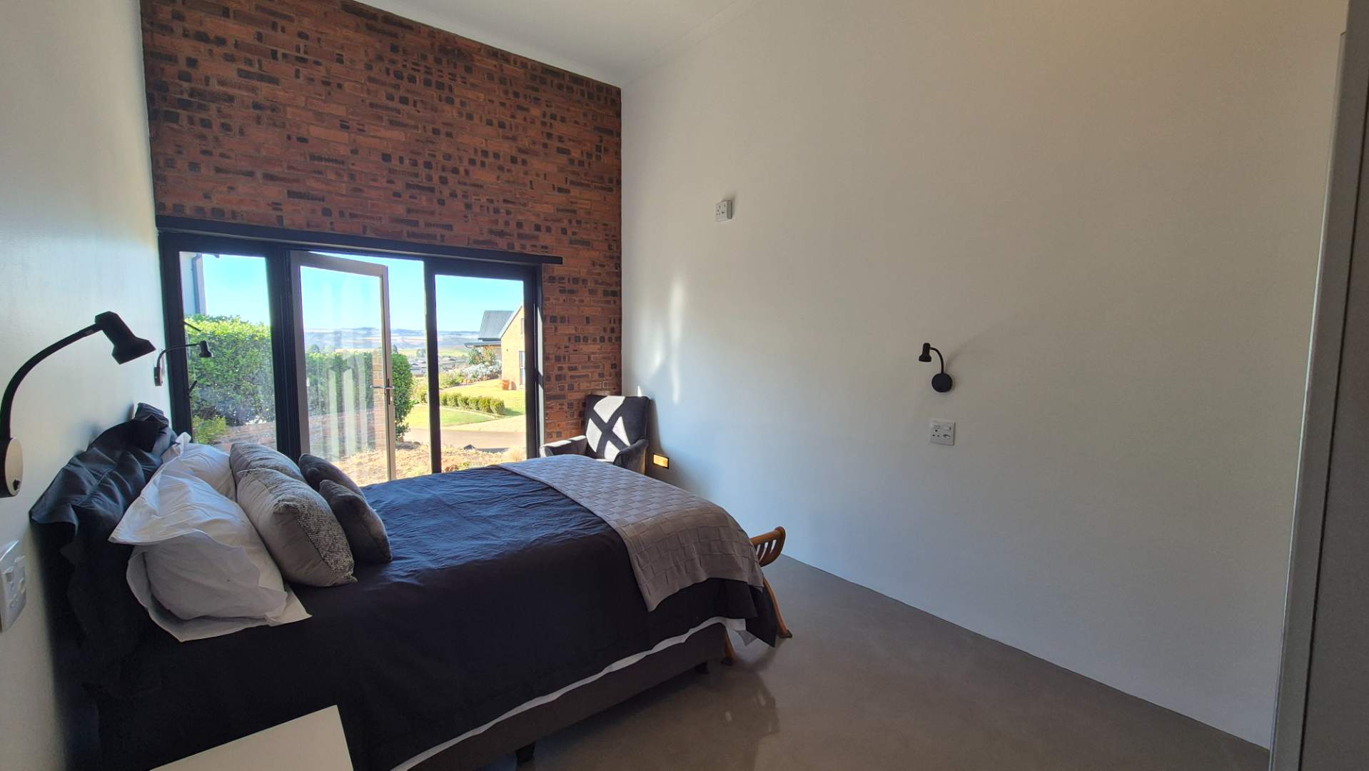 A wooden staircase takes you up to a mezzanine loft with its own balcony overlooking the lounge, ideal for a study or a small lounge for the guest suite. The bedroom upstairs is spacious and has an en-suite bathroom featuring a large shower. Downstairs, the passage, with handy sensor lighting and a linen cupboard, leads you to the other two bedrooms. The family bathroom has a large open shower. The main bedroom has a ceiling fan and enjoys access to the side garden. The ensuite bathroom has an open shower, as well as a double basin, and it enjoys access to the side garden. Both bedrooms are fitted with stylish overhead bedside lamps.