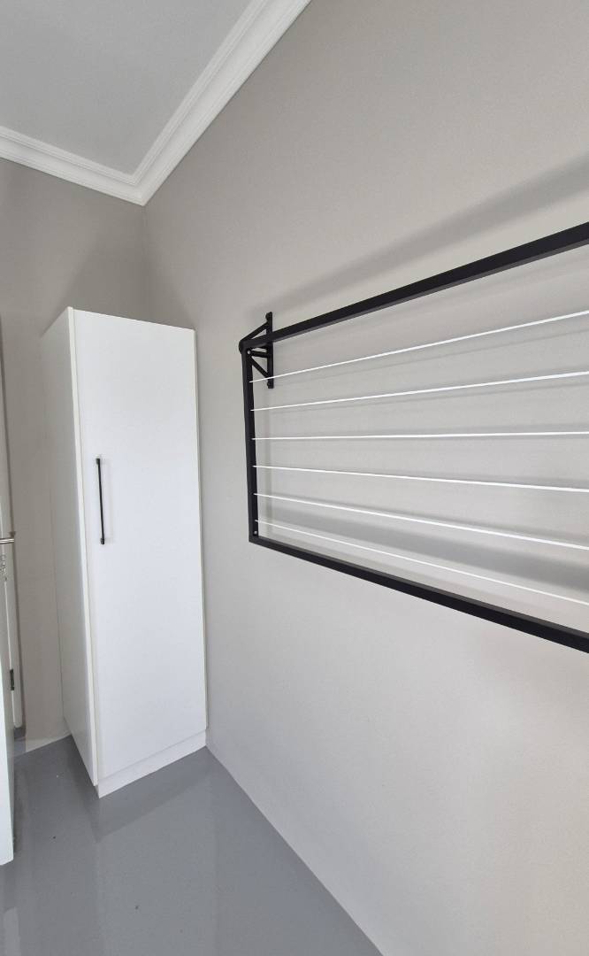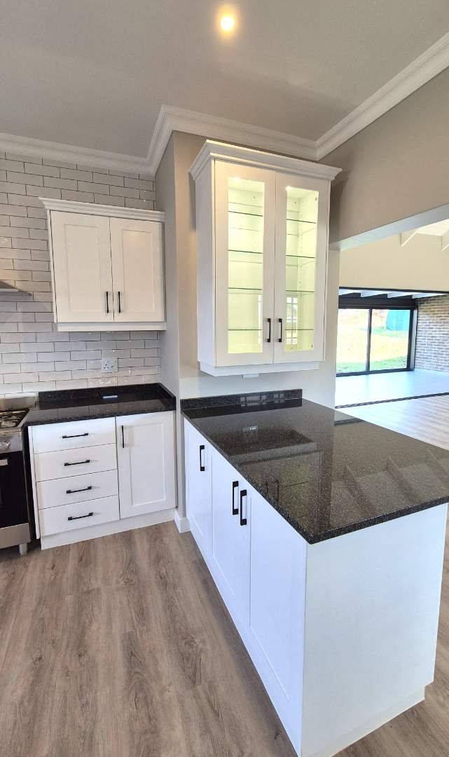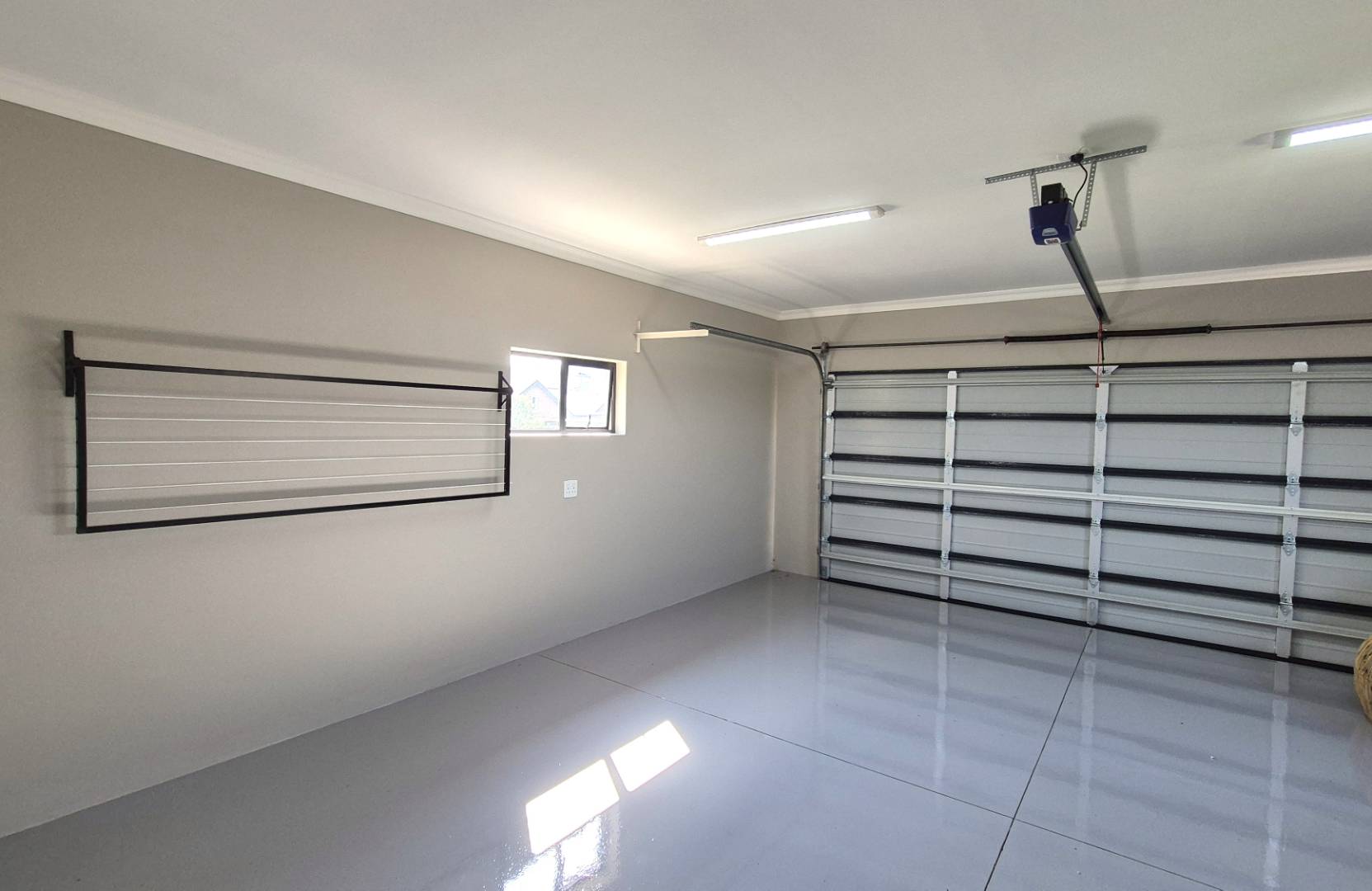 The modern kitchen is a true showpiece, featuring quartz countertops, a striking illuminated glass cupboard, space for three under-counter appliances, a five-plate gas stove, electric oven and extractor, and a separate scullery with a double sink. The scullery leads to an enclosed courtyard with a water tank, basin, and folding washline, blending practicality with style. A double garage with a sleek screeded floor, a tall cupboard, and an indoor washline adds further convenience.