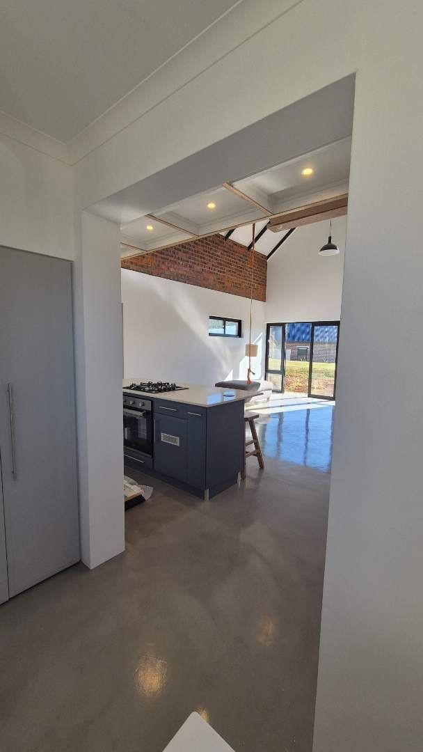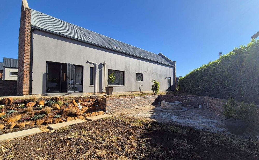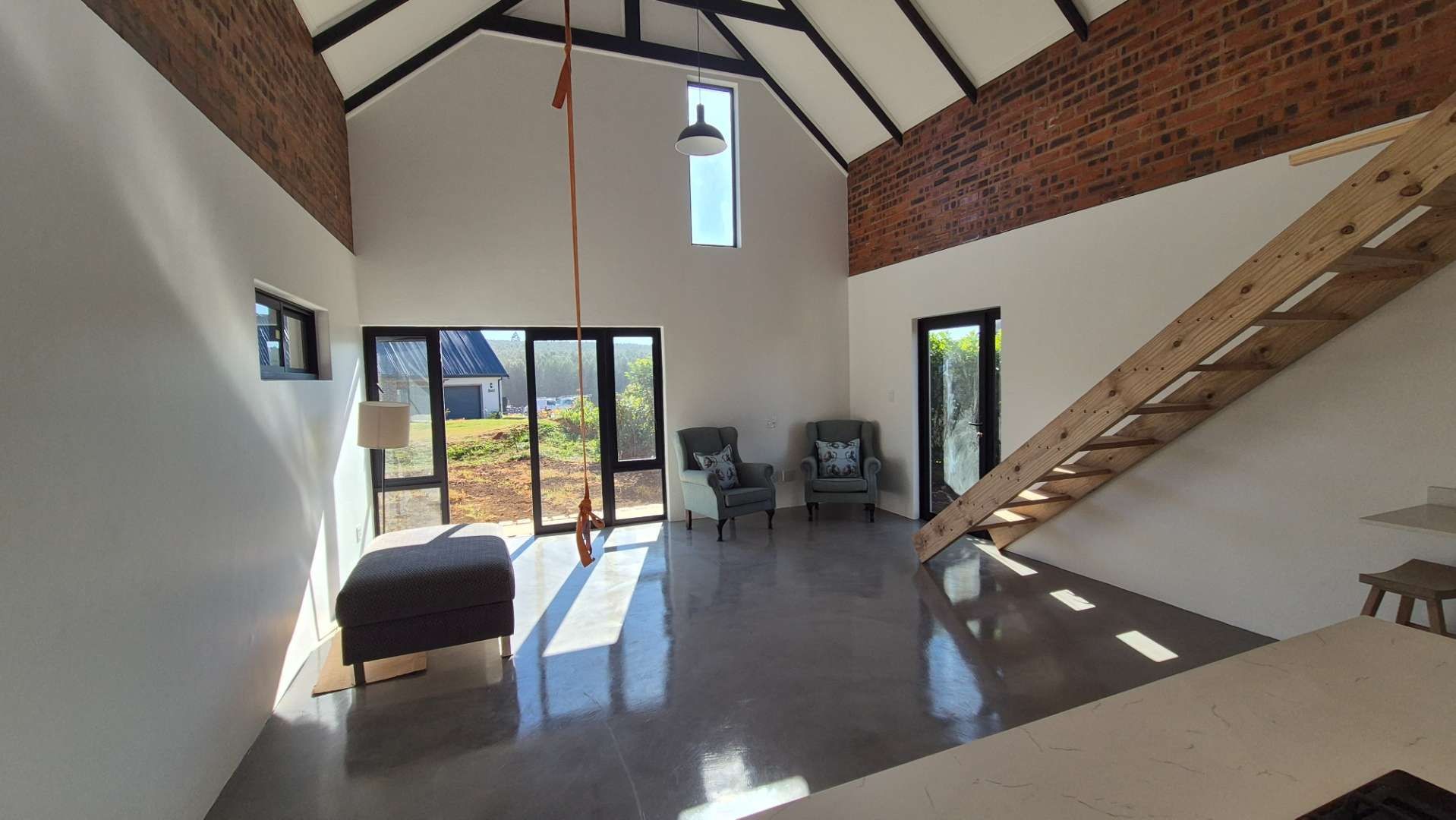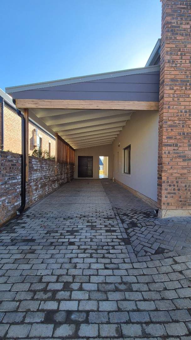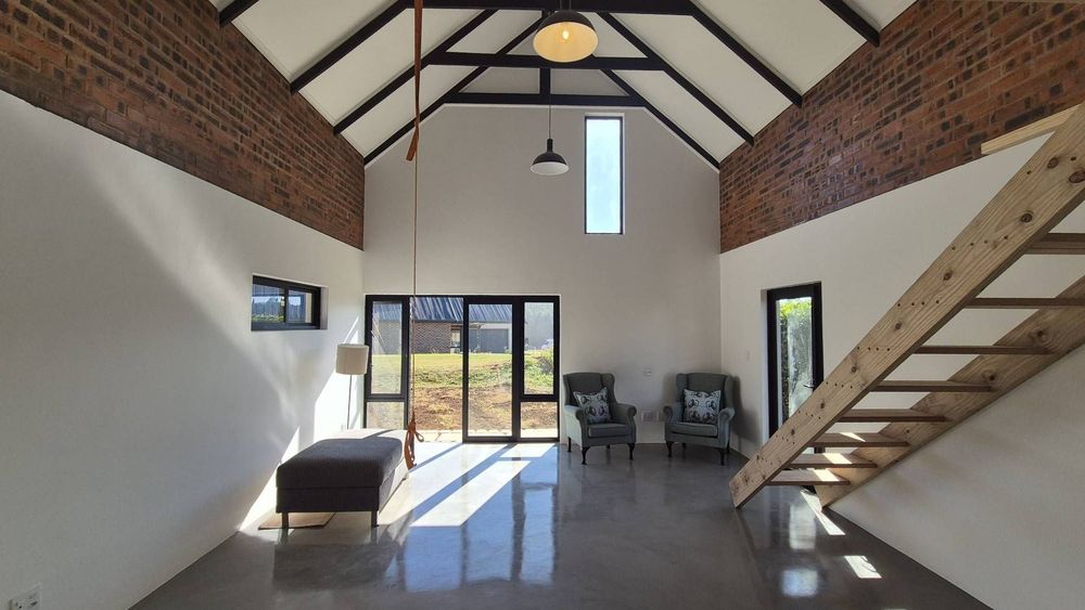 A wooden staircase takes you up to a mezzanine loft with its own balcony overlooking the lounge, ideal for a study or a small lounge for the guest suite. The bedroom upstairs is spacious and has an en-suite bathroom featuring a large shower. Downstairs, the passage, with handy sensor lighting and a linen cupboard, leads you to the other two bedrooms. The family bathroom has a large open shower. The main bedroom has a ceiling fan and enjoys access to the side garden. The ensuite bathroom has an open shower, as well as a double basin, and it enjoys access to the side garden. Both bedrooms are fitted with stylish overhead bedside lamps.