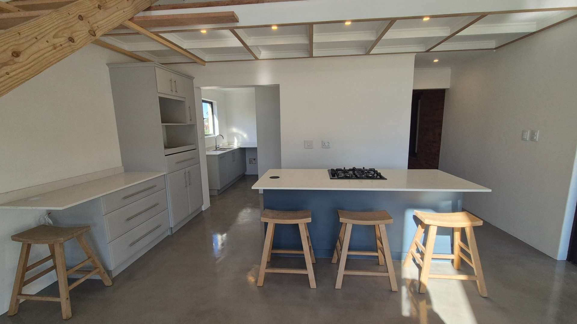 The open-plan kitchen, dining, and lounge areas flow beautifully together. The kitchen is fitted with a centre island that includes a gas hob and oven, a light-up walk-in cupboard, and a separate scullery with a double sink and space for two undercounter appliances.