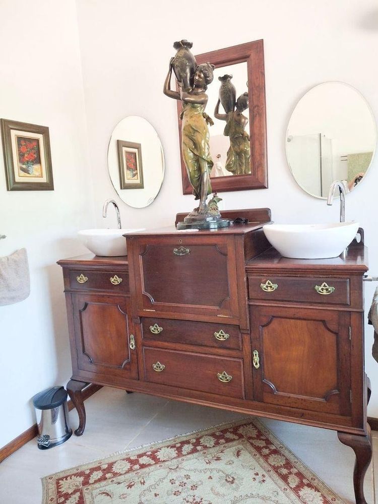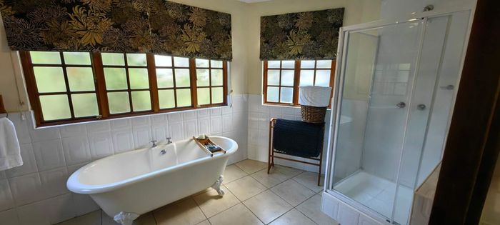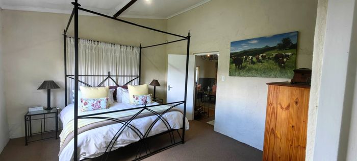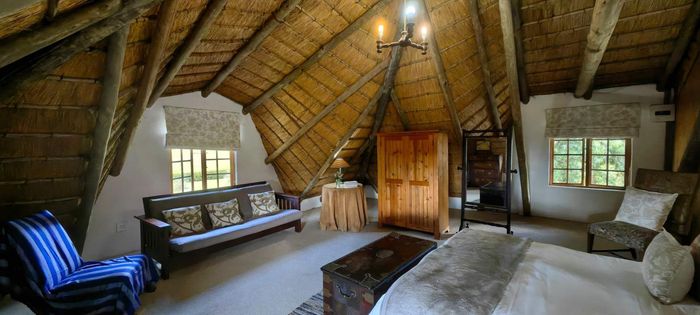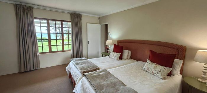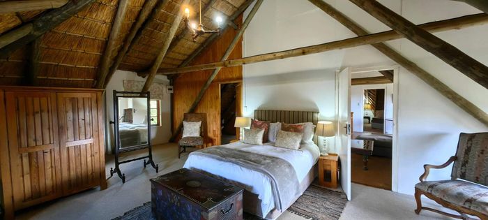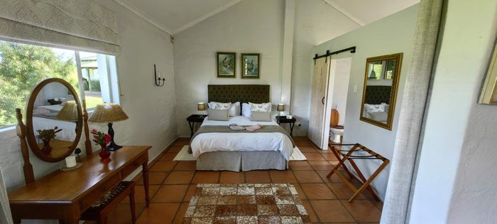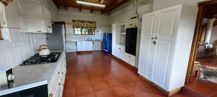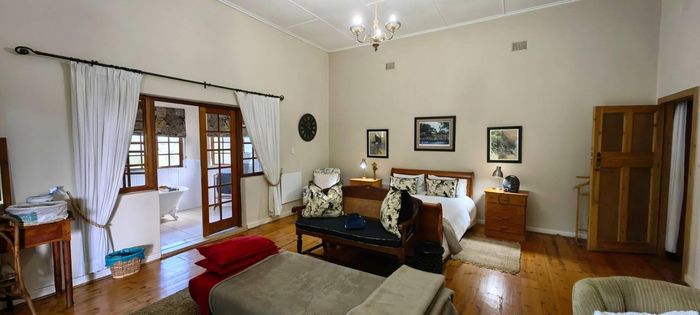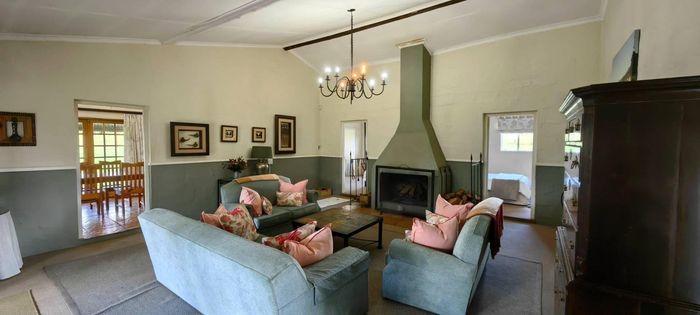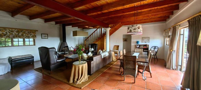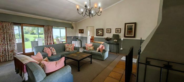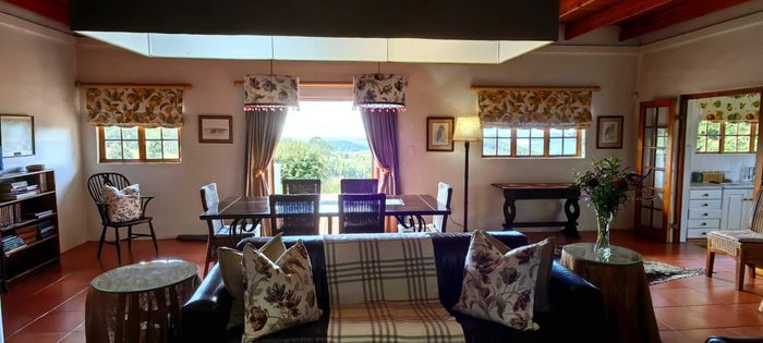 The home itself is thoughtfully designed with a practical, flowing layout. One wing features three spacious bedrooms and three modern bathrooms. The kitchen is well-appointed with a built-in oven and hob, plus a separate utility area. Stairs off the kitchen lead down to a private wine cellar. There is generous dining room, plus a spacious lounge that leads through to the sun-room. Openings lead out onto a lovely paved entertainment area overlooking a tranquil pond and stunning views. Fireplaces in the lounge, dining-room and kitchen ensure that you keep warm during winter.
