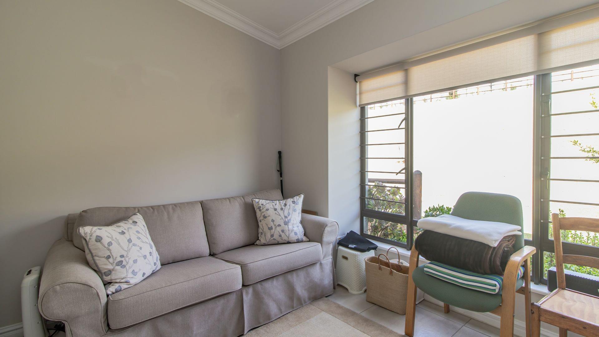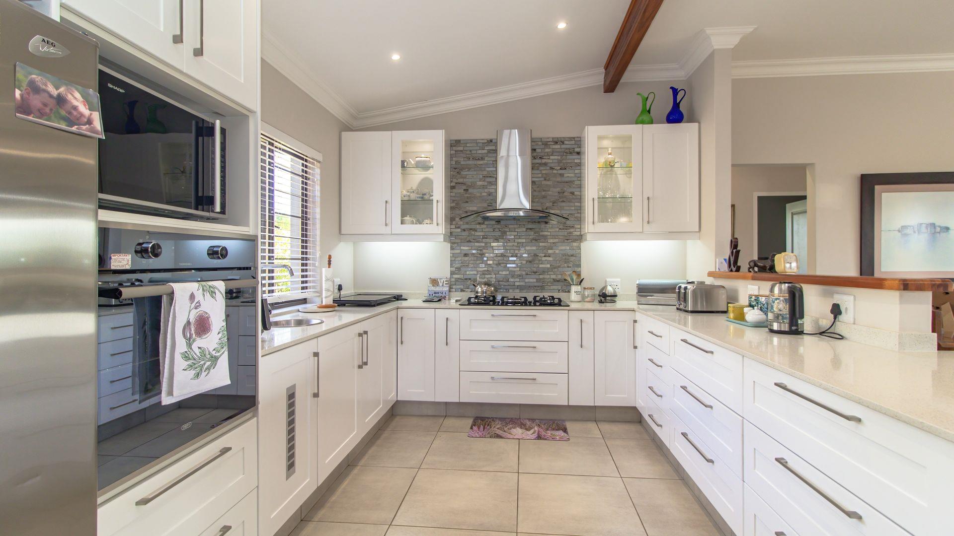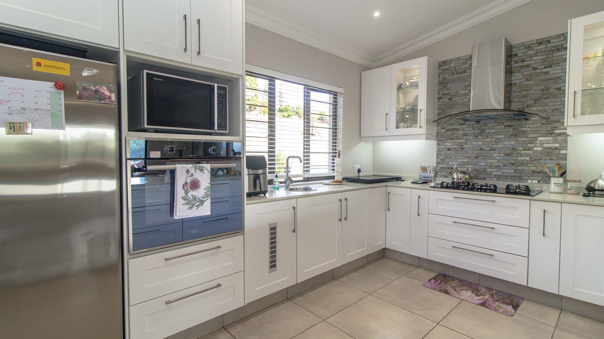 The kitchen is modern and beautifully appointed with quartz countertops, ample cupboards, a breakfast counter, prep bowl, and space for a double-door fridge. An eye-level oven and 5-plate gas hob with extractor make it a dream for home cooks, while the separate scullery offers additional storage, a double sink, and space for your appliances. A door from the scullery leads to a semi-enclosed courtyard that provides a practical laundry area.