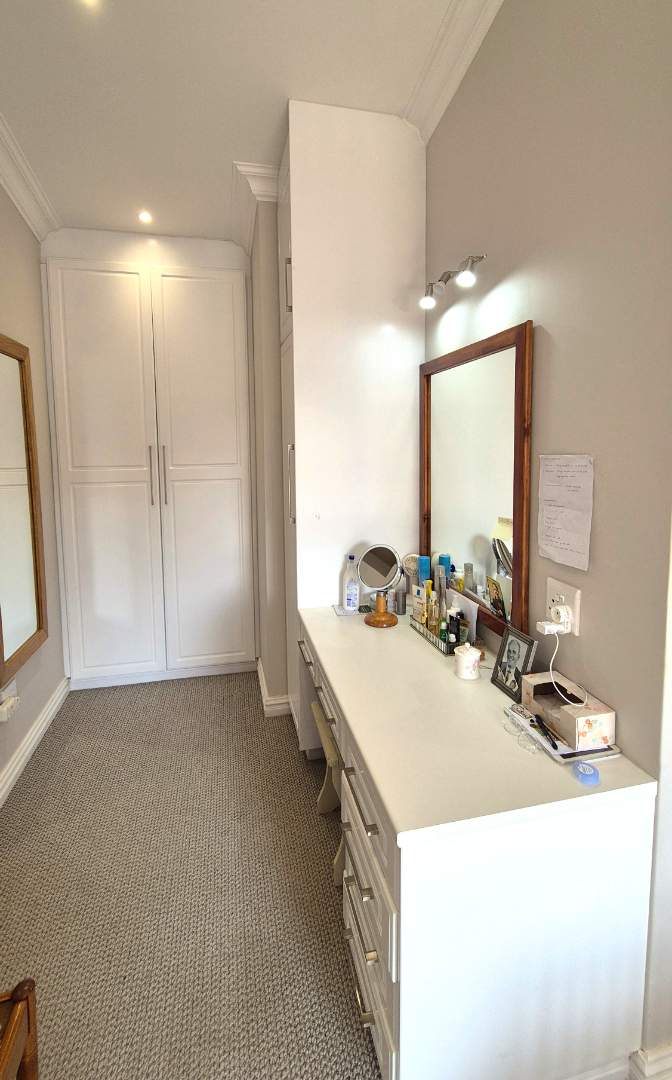The bedrooms are spacious, with two of them being fully carpeted, and all are fitted with built-in cupboards and ceiling fans. The third bedroom is tiled and currently being used as a study, with an added desk, drawers, and shelving, providing a quiet, well-organised workspace. Removing the desk etc will easily transform it back into a bedroom. The family bathroom includes both a bath and shower, while the main en-suite features a shower with a built-in bench and handheld showerhead and a built-in bench for added comfort.