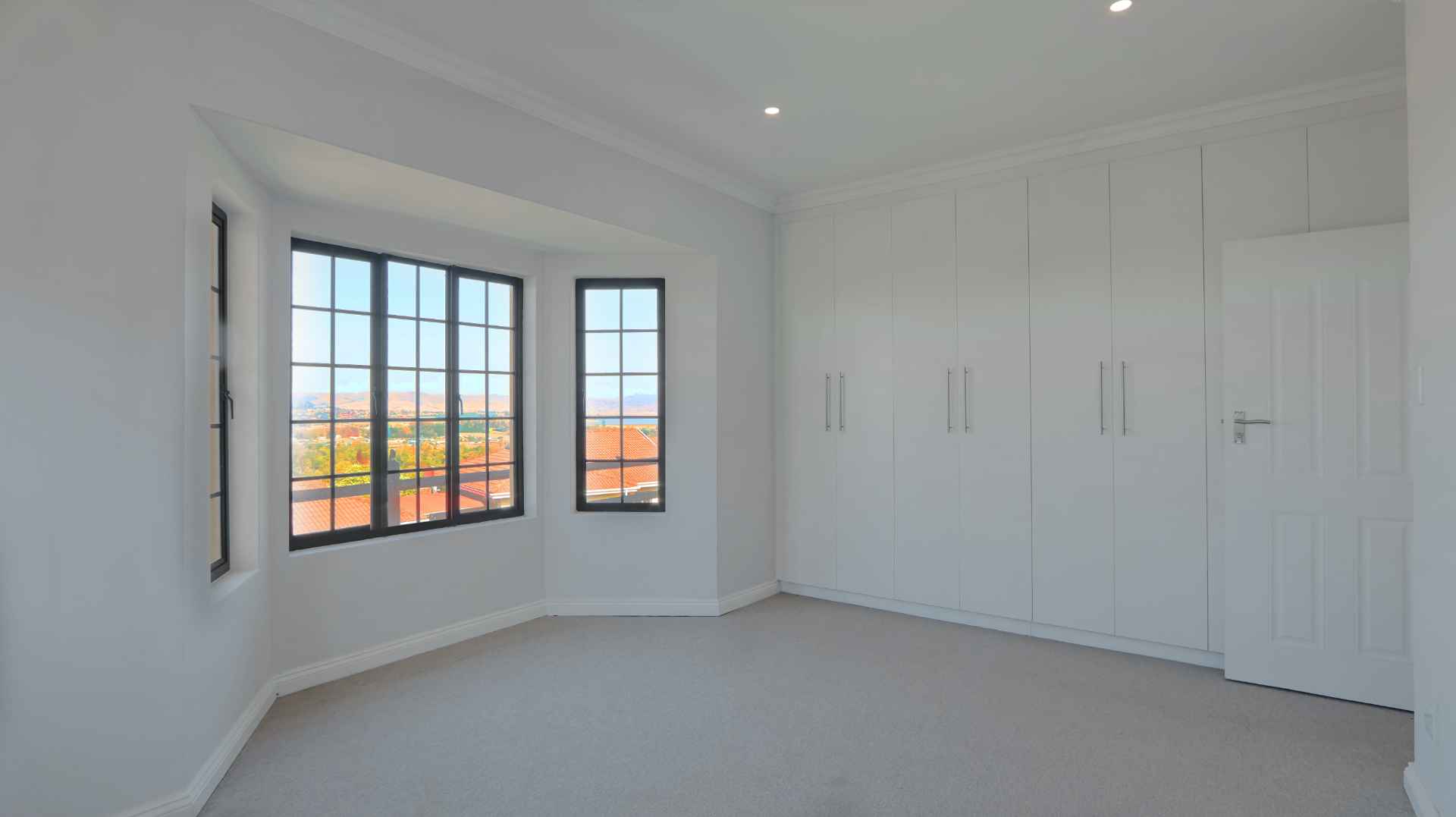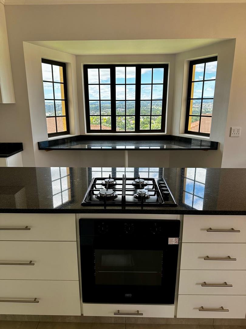 The modern kitchen is a chef’s delight, featuring granite countertops, a central island with gas hob, a discreet scullery, and charming bay windows that bring in natural light. The tiled floors throughout the living areas create a clean, easy-to-maintain space, while both bedrooms are carpeted, with built-in cupboards for comfort and storage.