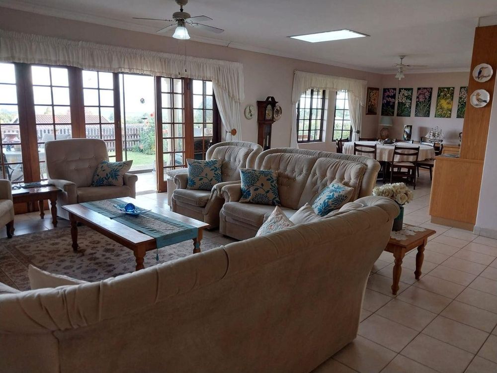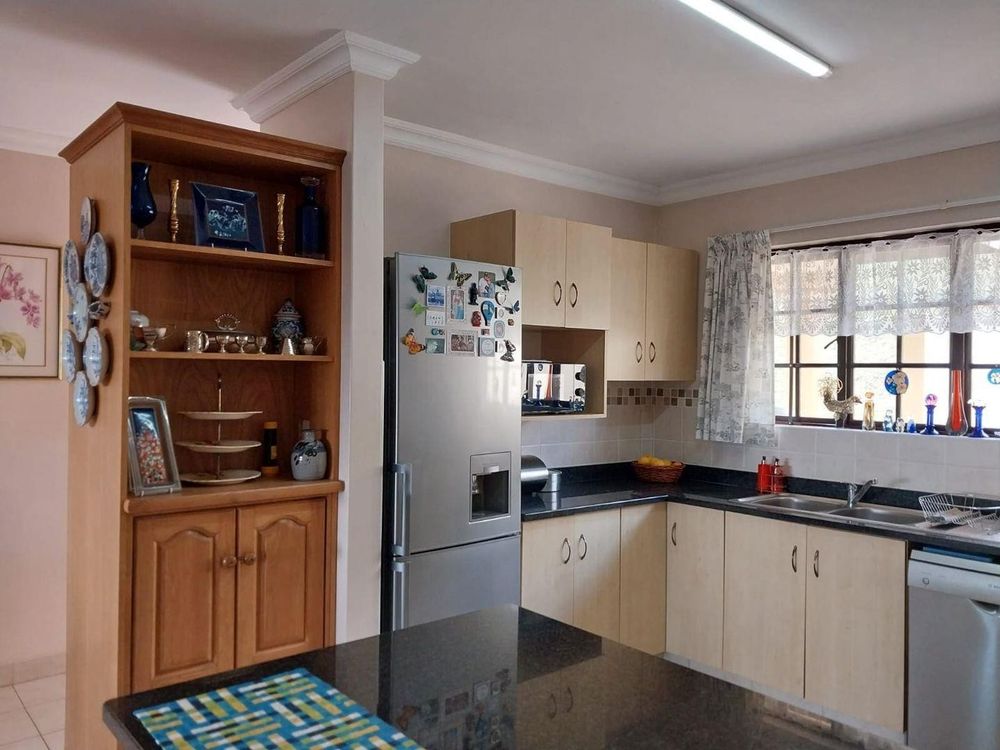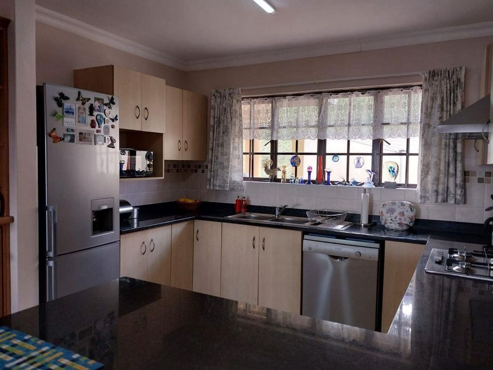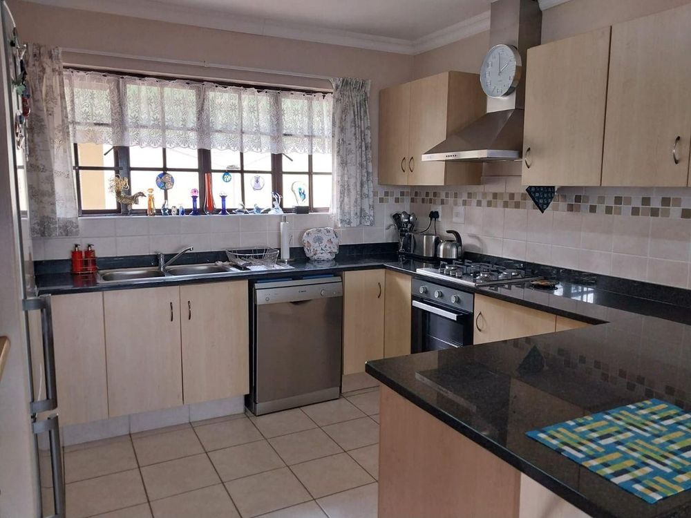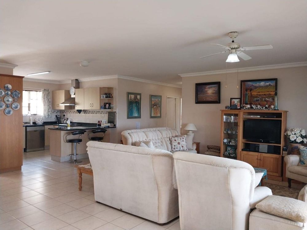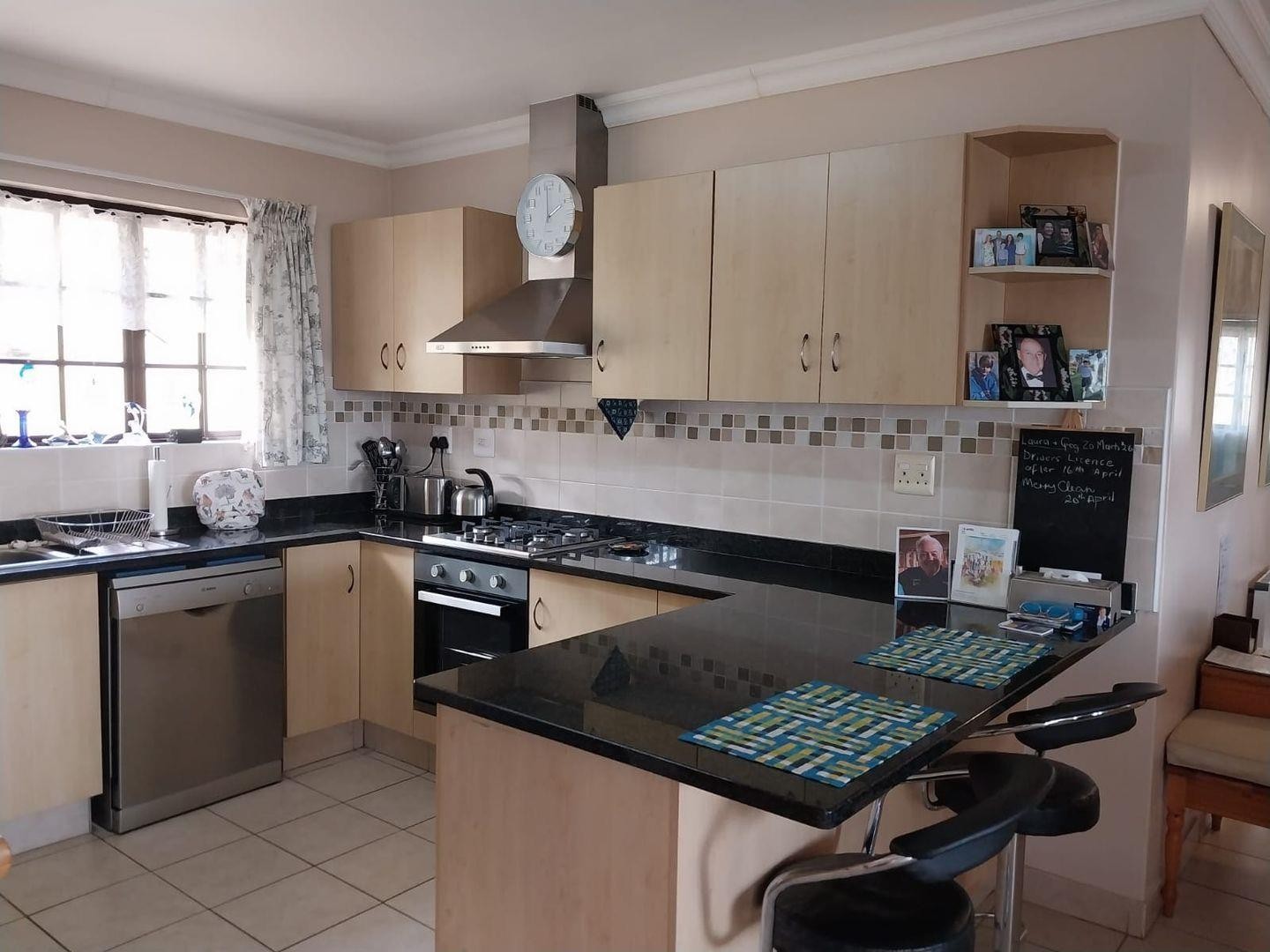 One enters into an extra-large open-plan lounge and dining room. This area flows seamlessly into a well-designed and modern kitchen which offers a breakfast counter, an under-counter electric oven, a gas hob, a connection for a dishwasher and plenty of cupboard space.