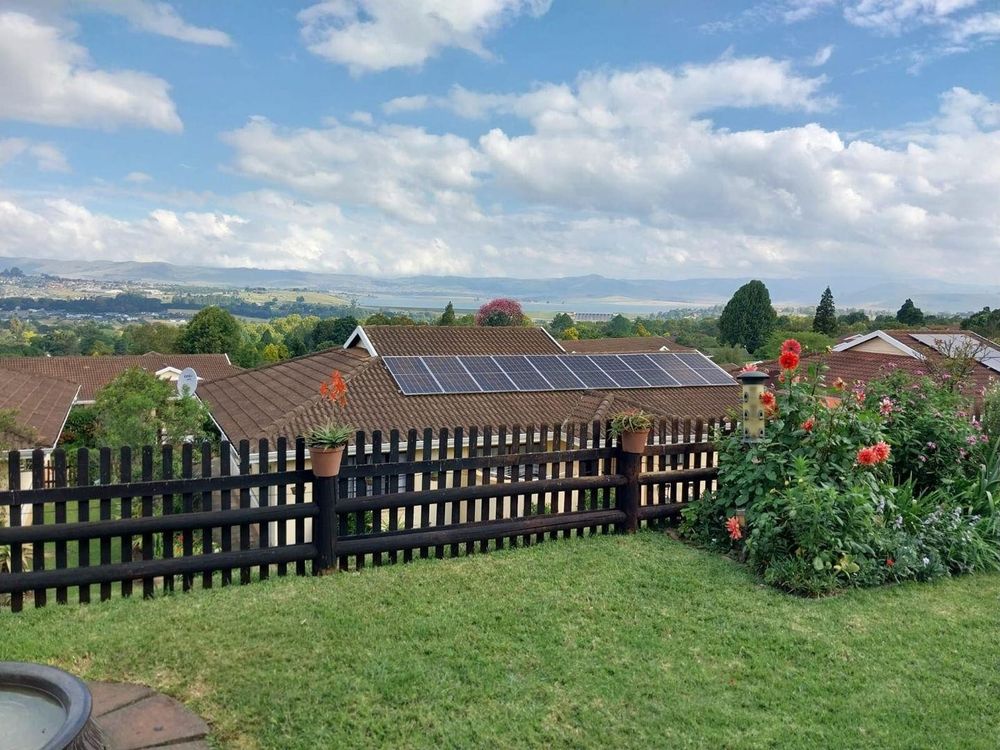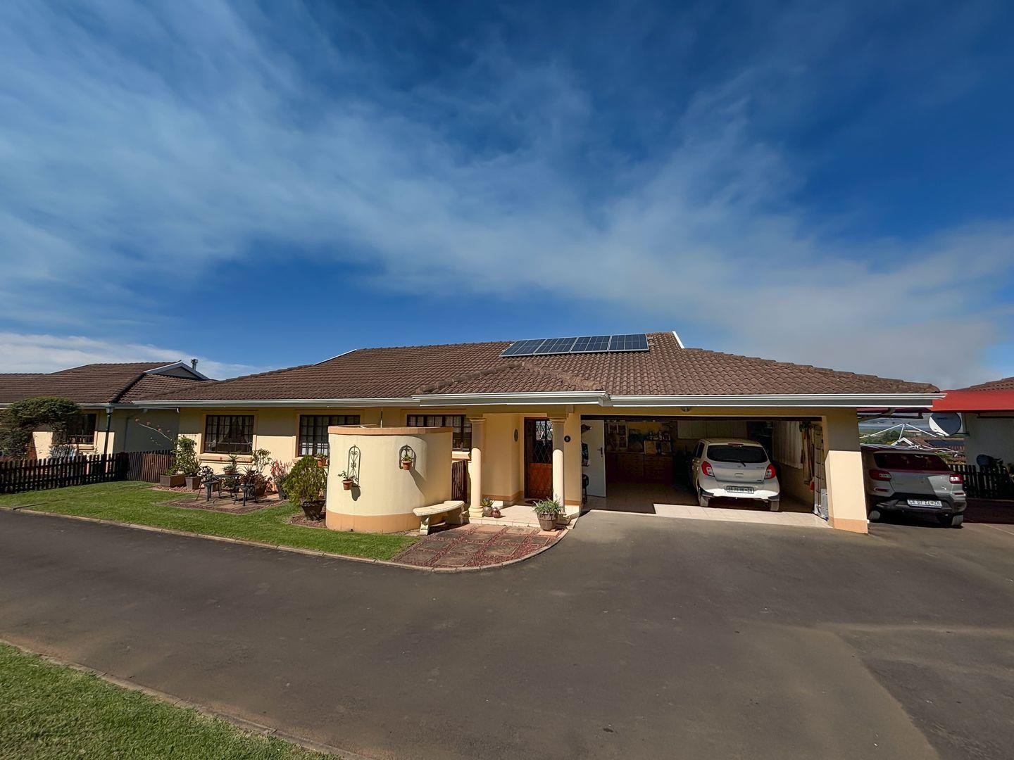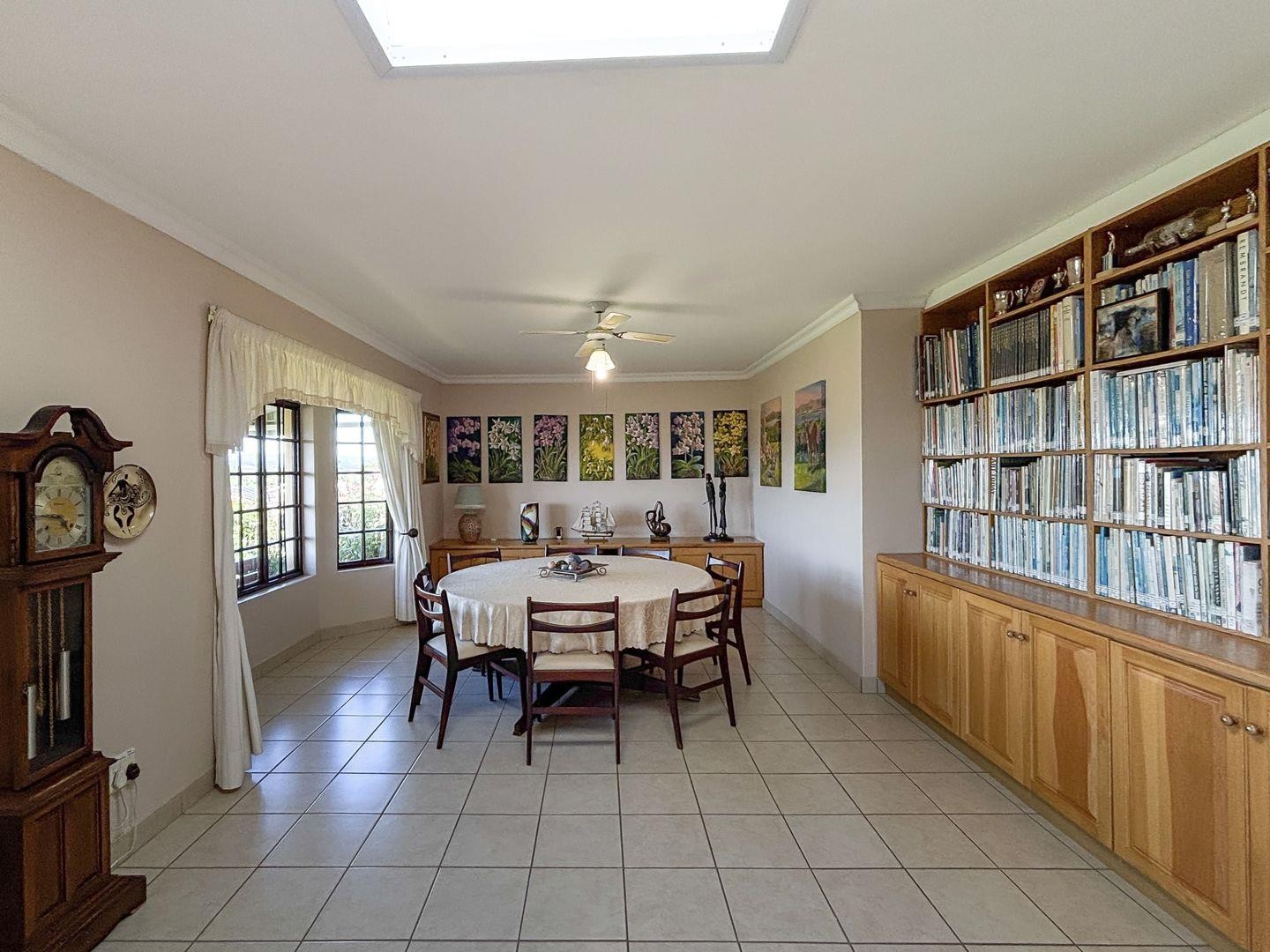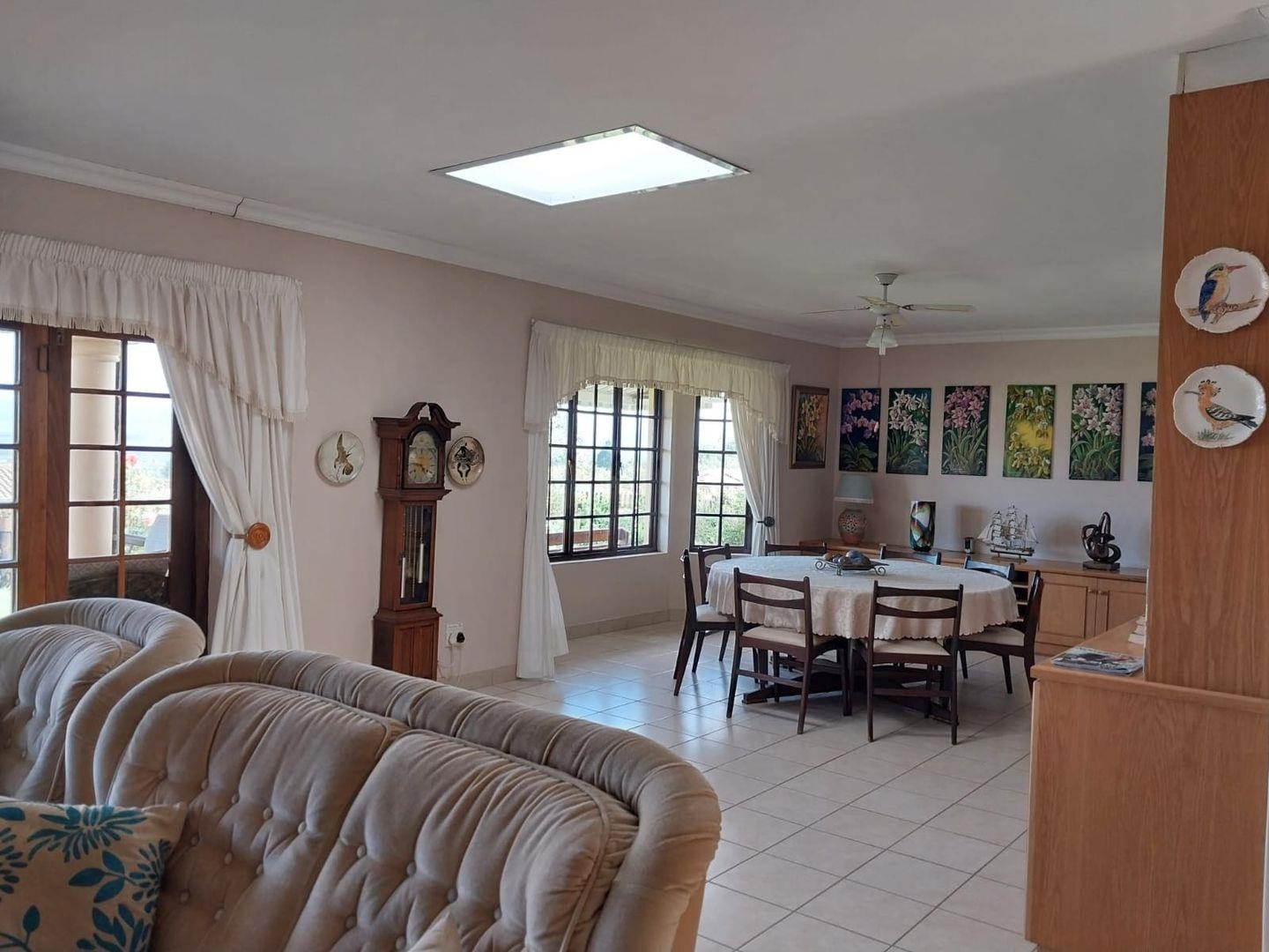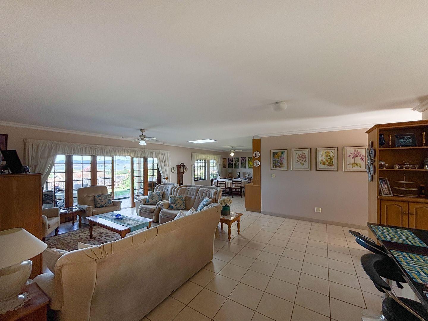 One enters into an extra-large open-plan lounge and dining room. This area flows seamlessly into a well-designed and modern kitchen which offers a breakfast counter, an under-counter electric oven, a gas hob, a connection for a dishwasher and plenty of cupboard space.
