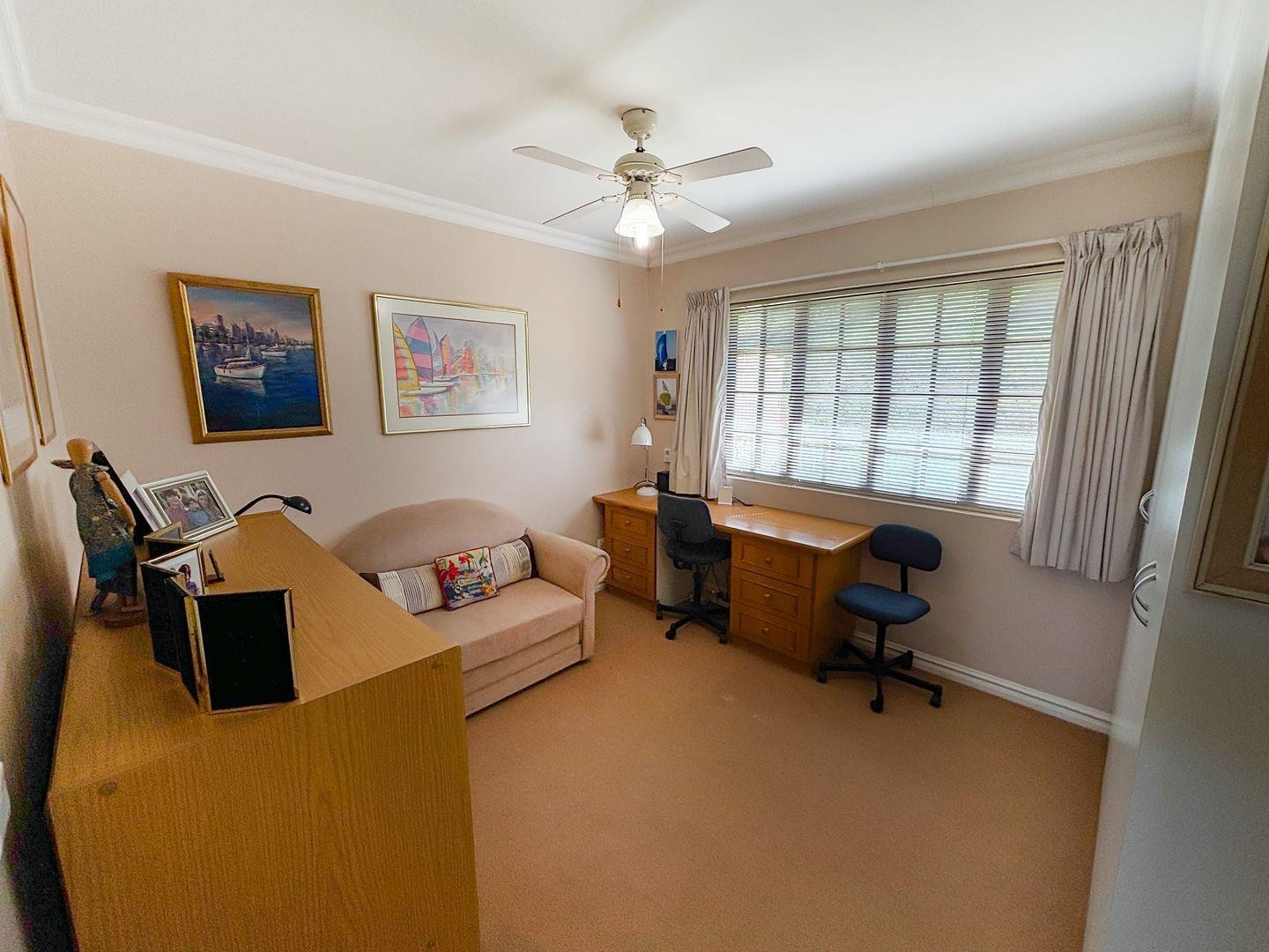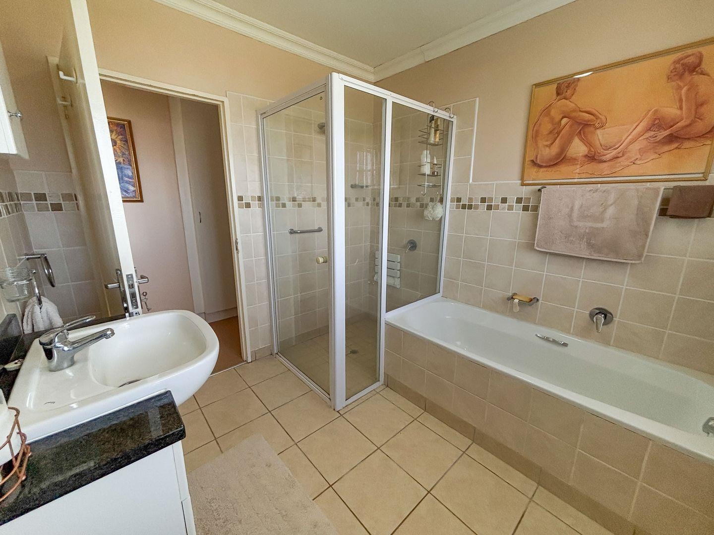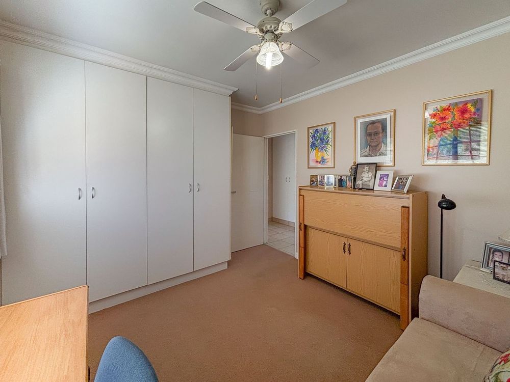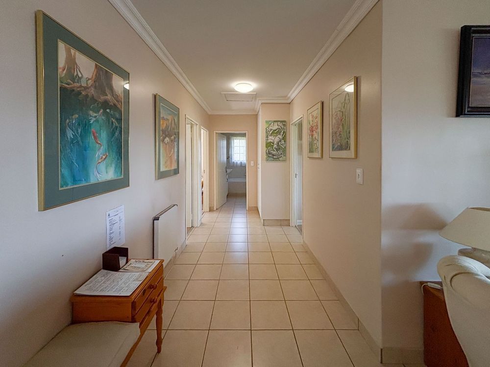 A passageway from the living area leads to the 3 large bedrooms, all with built-in cupboards. The main bedroom features a bay window and has an en-suite bathroom with bath, shower, basin and toilet. The other two bedrooms are served by a second bathroom which also has a bath, shower, basin and toilet. A bonus is a large linen cupboard in the passage.