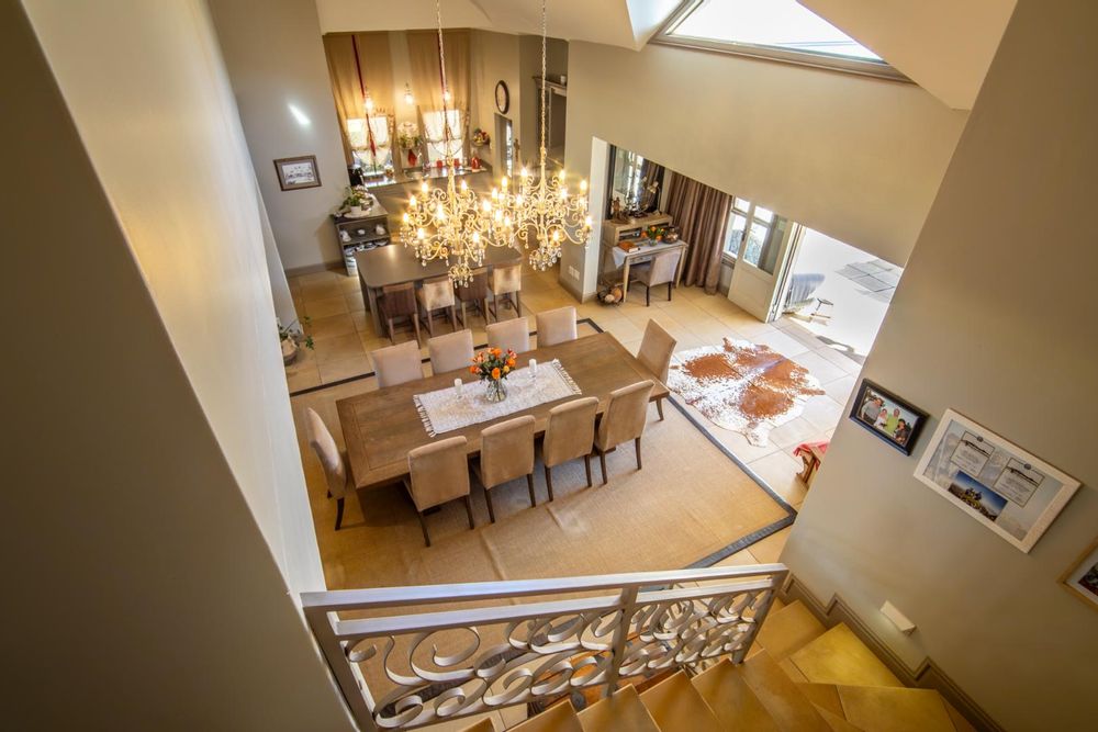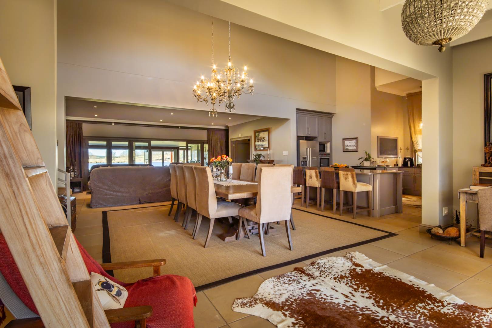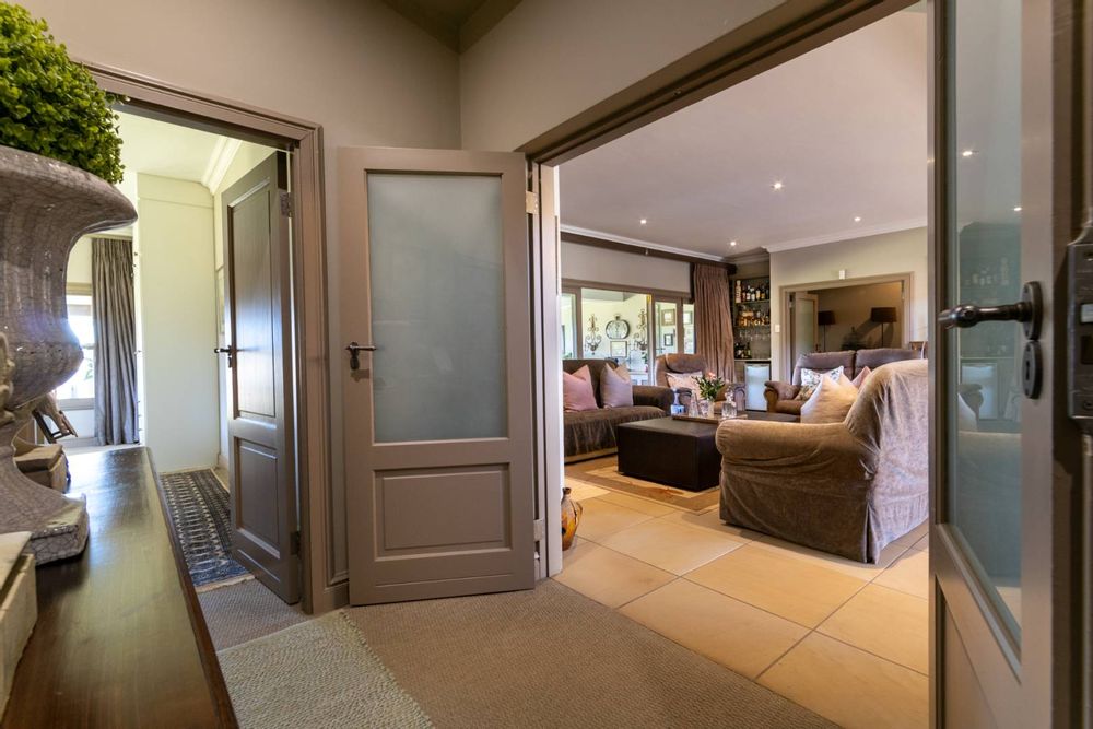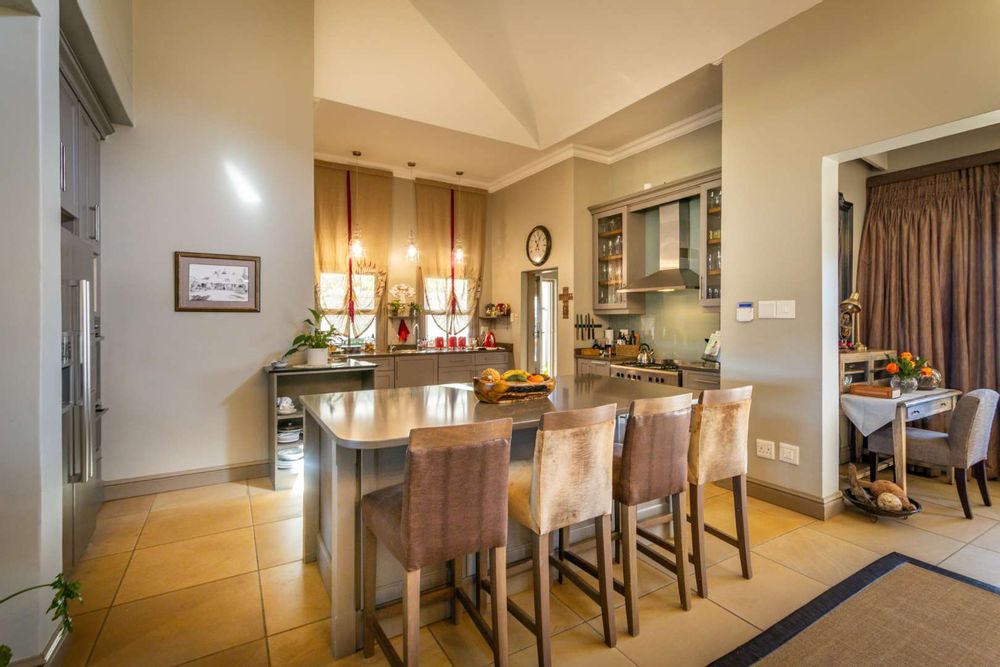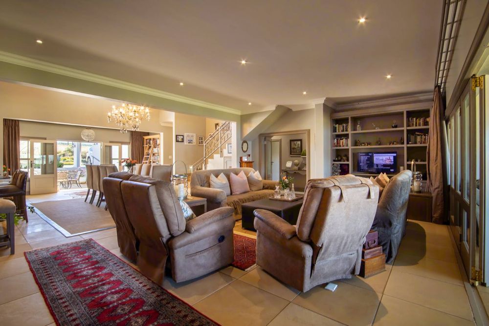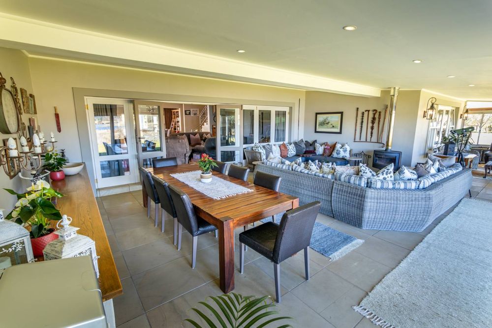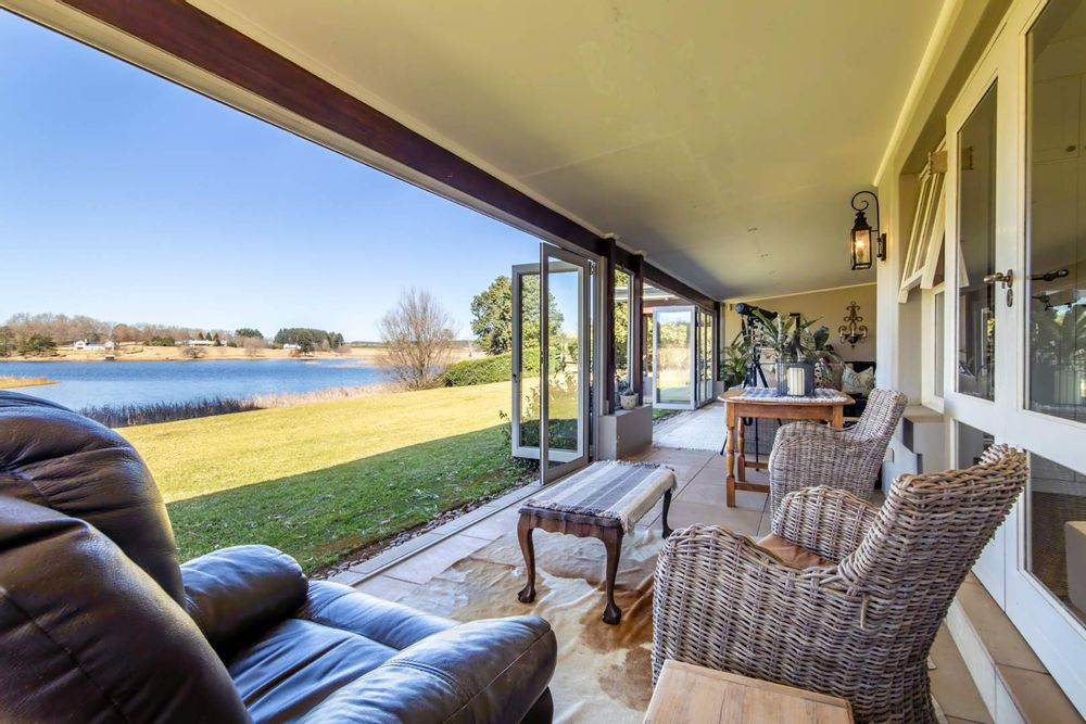 Step into expansive open-plan lounge and dining areas with soaring ceilings, flowing effortlessly to a glass-enclosed veranda with stacking doors. Enjoy indoor-outdoor living all year round with panoramic views of the dam and manicured lawns.