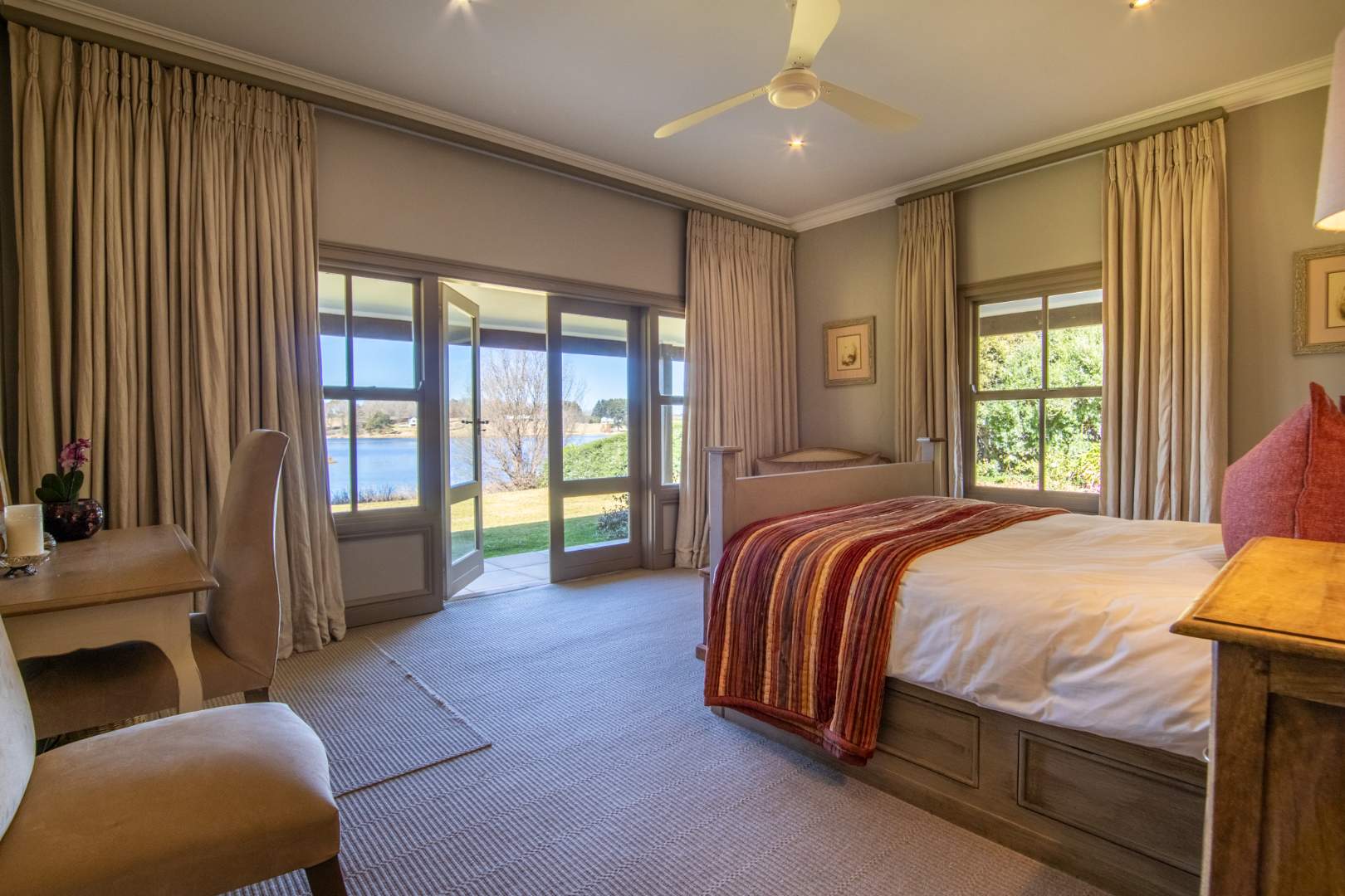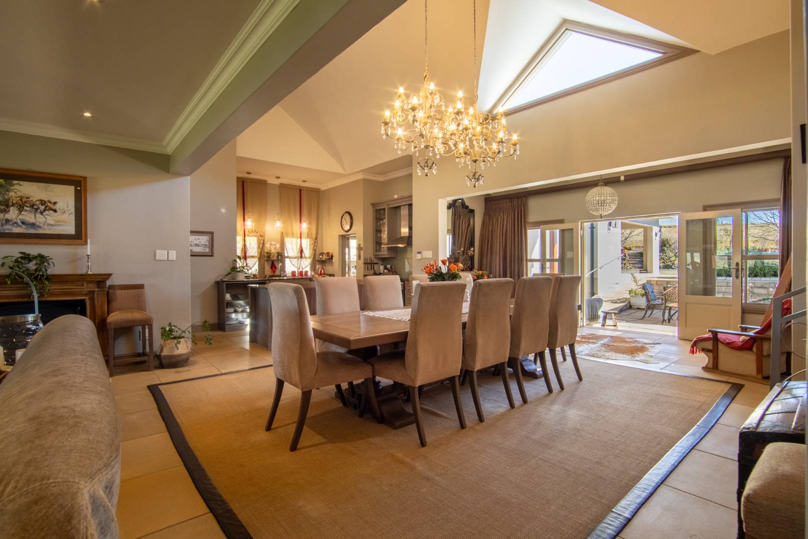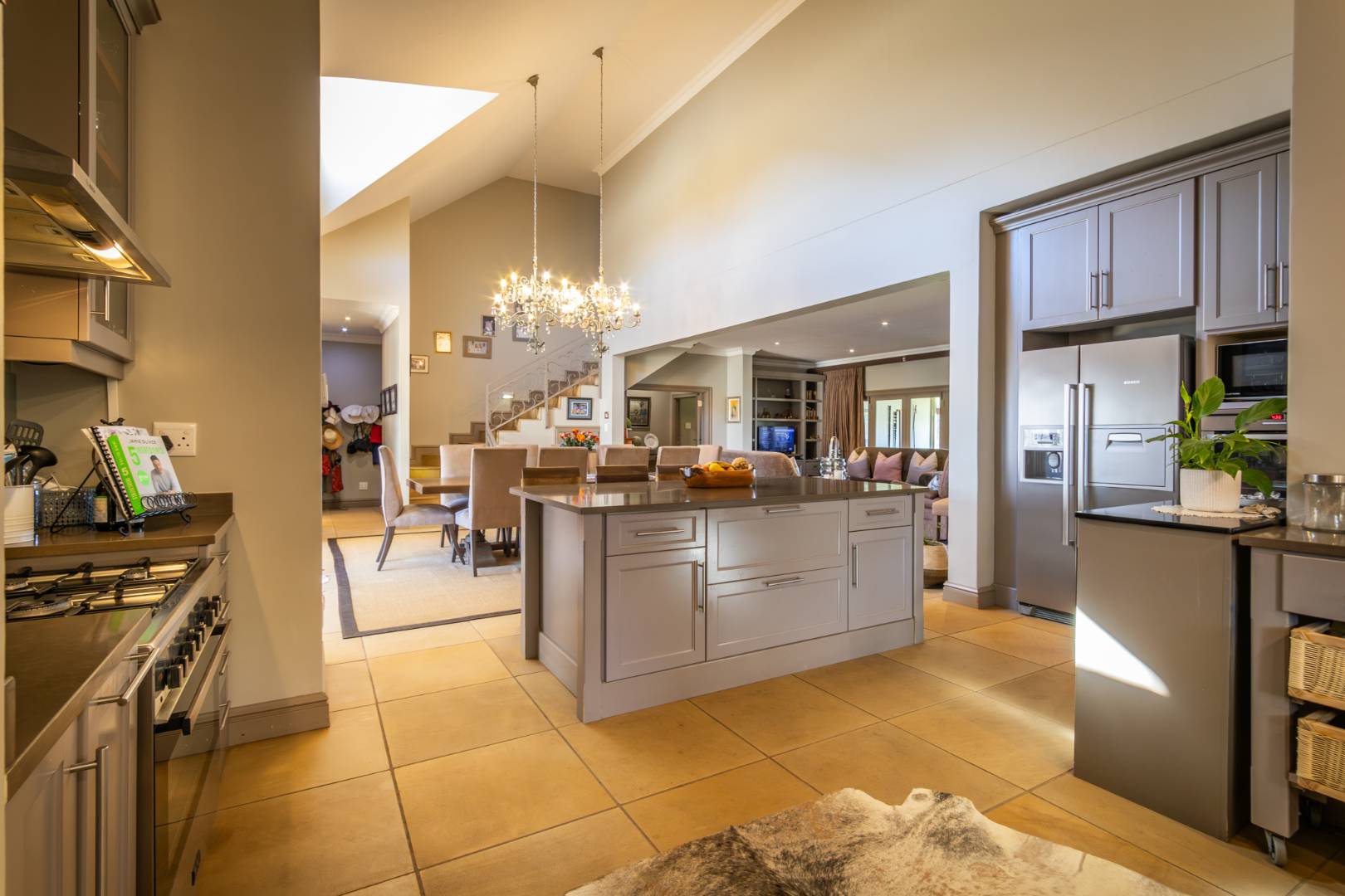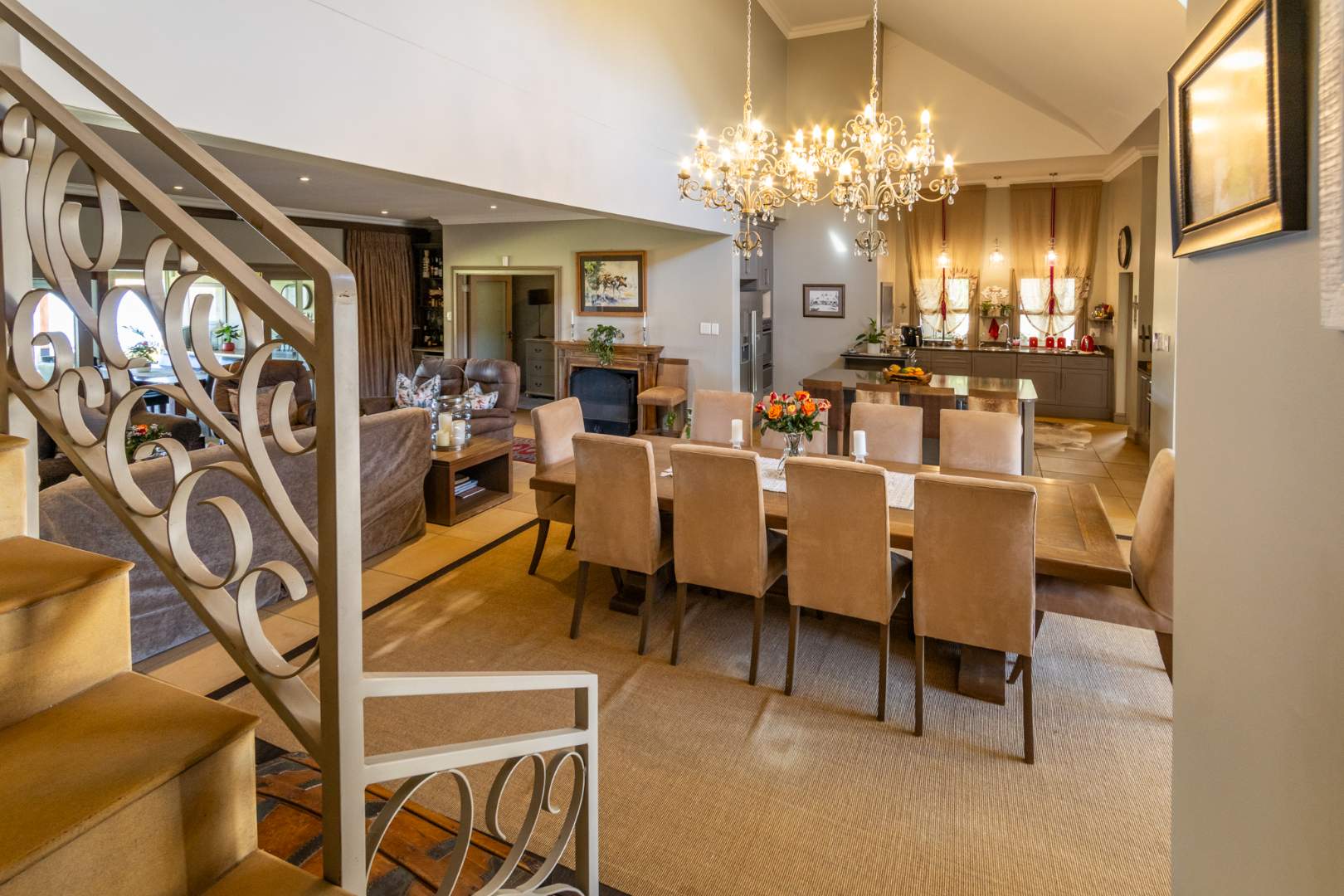 Step into expansive open-plan lounge and dining areas with soaring ceilings, flowing effortlessly to a glass-enclosed veranda with stacking doors. Enjoy indoor-outdoor living all year round with panoramic views of the dam and manicured lawns.