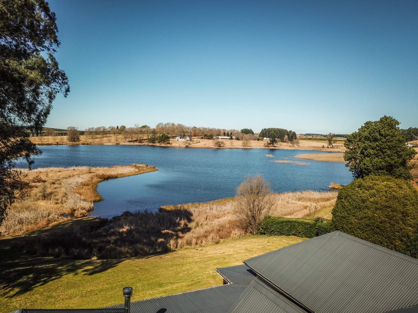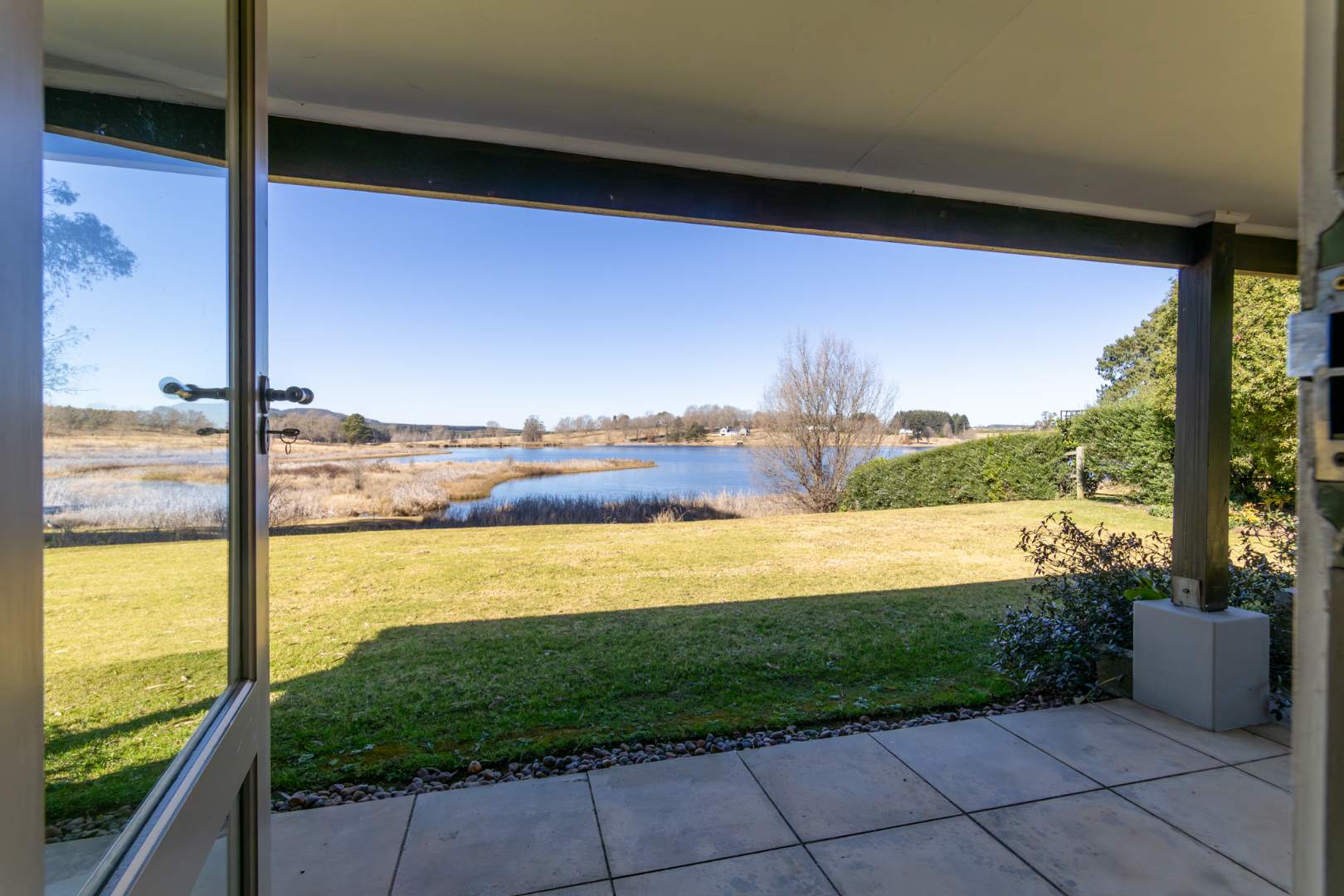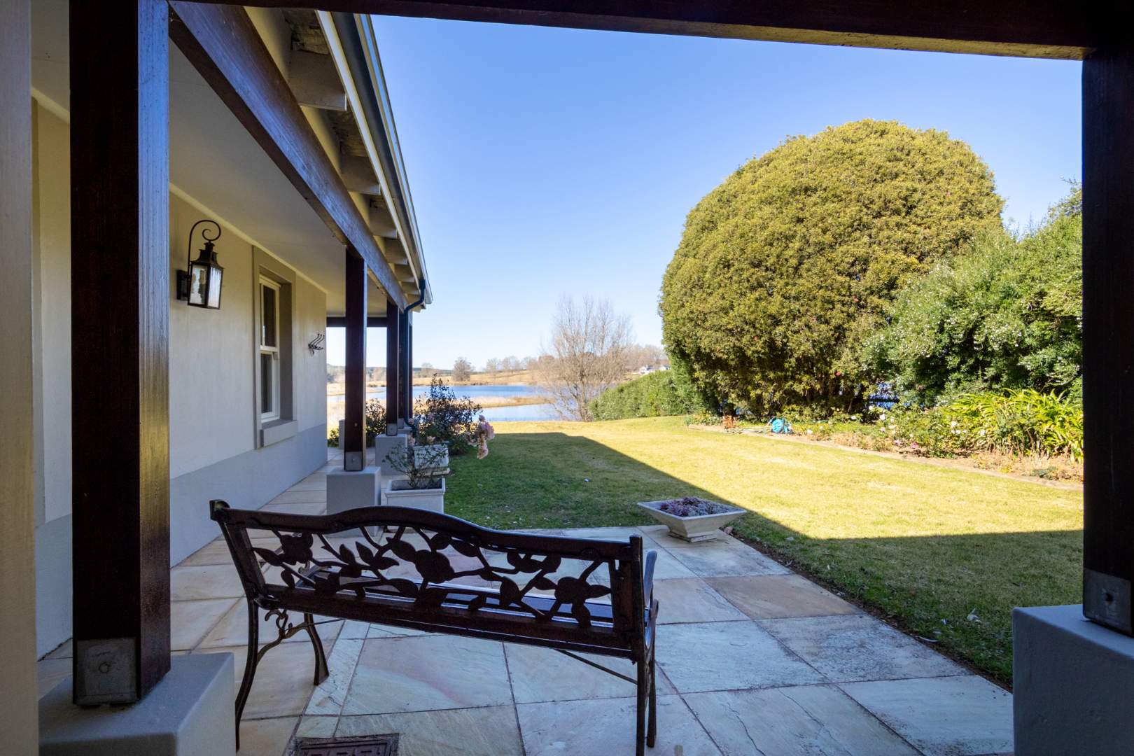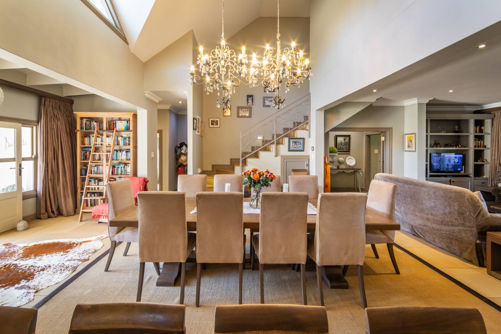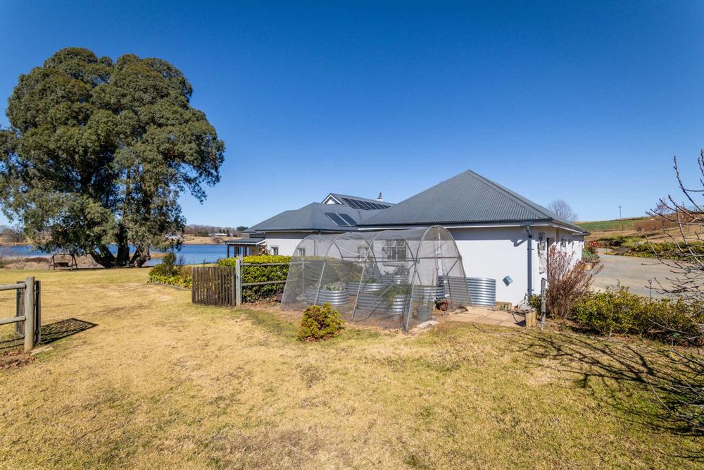 Step into expansive open-plan lounge and dining areas with soaring ceilings, flowing effortlessly to a glass-enclosed veranda with stacking doors. Enjoy indoor-outdoor living all year round with panoramic views of the dam and manicured lawns.