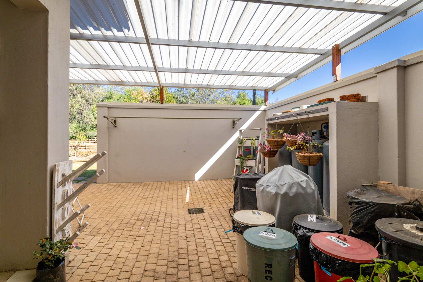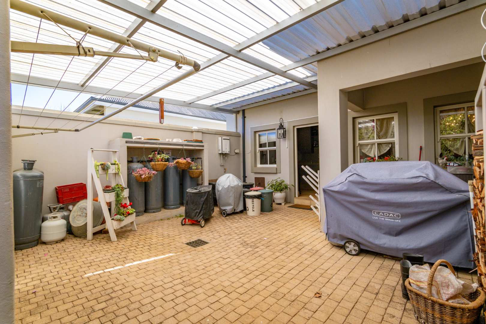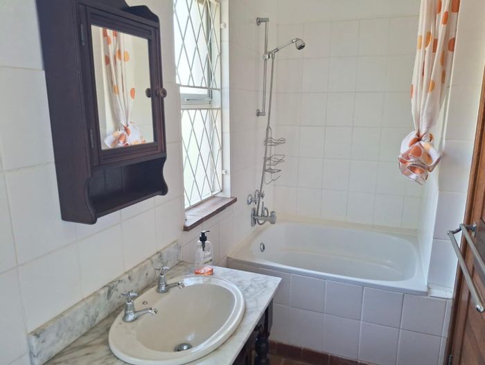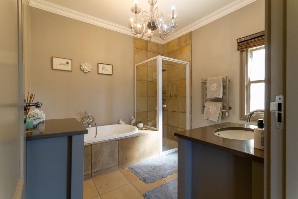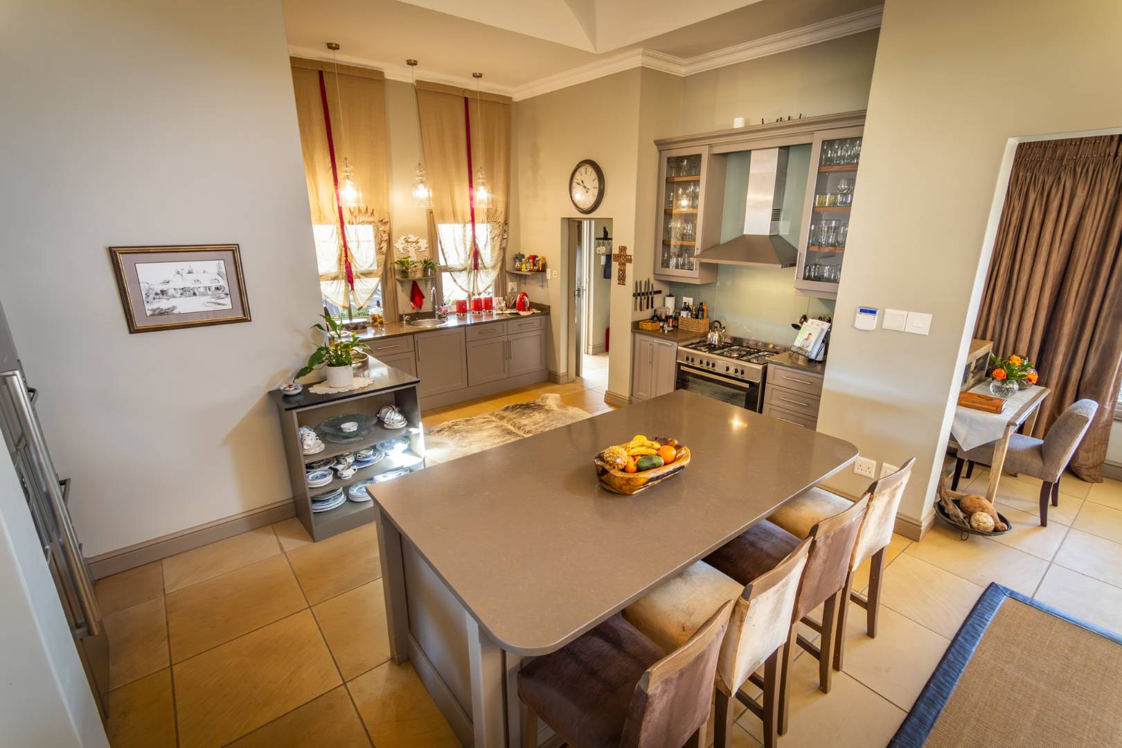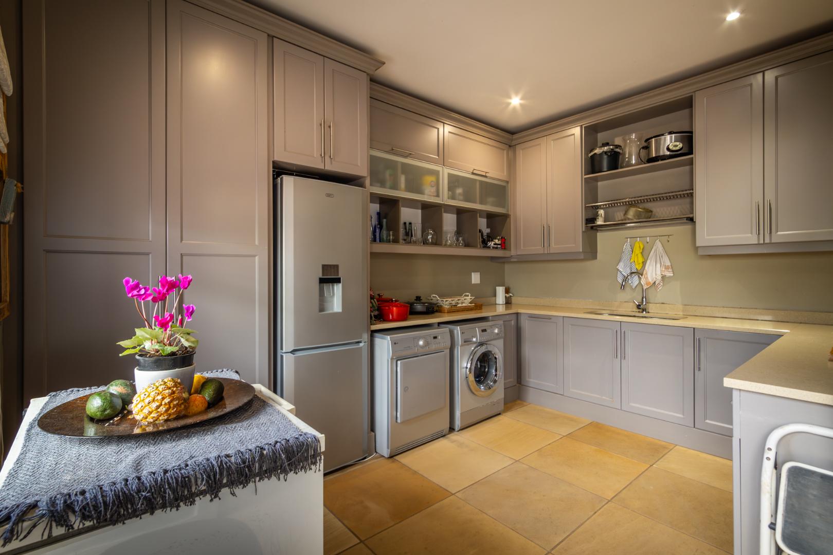 A gourmet kitchen awaits, complete with Caesarstone countertops, a freestanding gas/electric stove, eye-level oven, central hob, and ample storage. A separate scullery/laundry area opens to a private courtyard equipped with a wash line, double trough, and utility area. The home also includes a 12kW inverter system for seamless power backup.