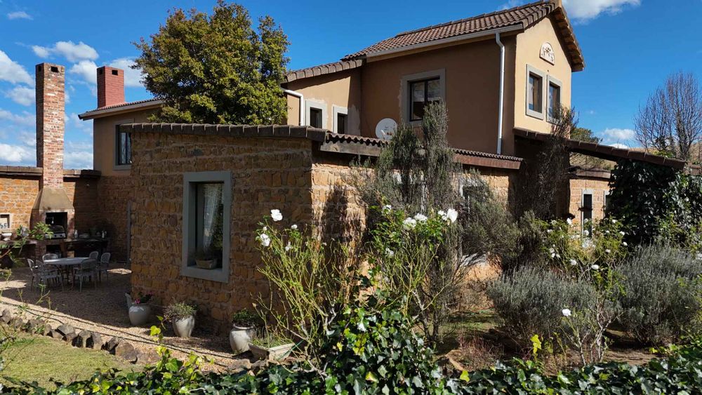 Accommodation includes the main house (sleeping 12) and two charming cottages, with additional lodging available nearby for larger events. Two scenic dams and solar-powered boreholes enhance the property’s self-sufficiency and eco-conscious appeal.