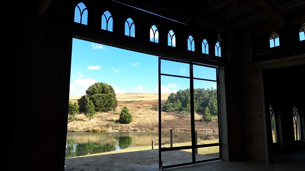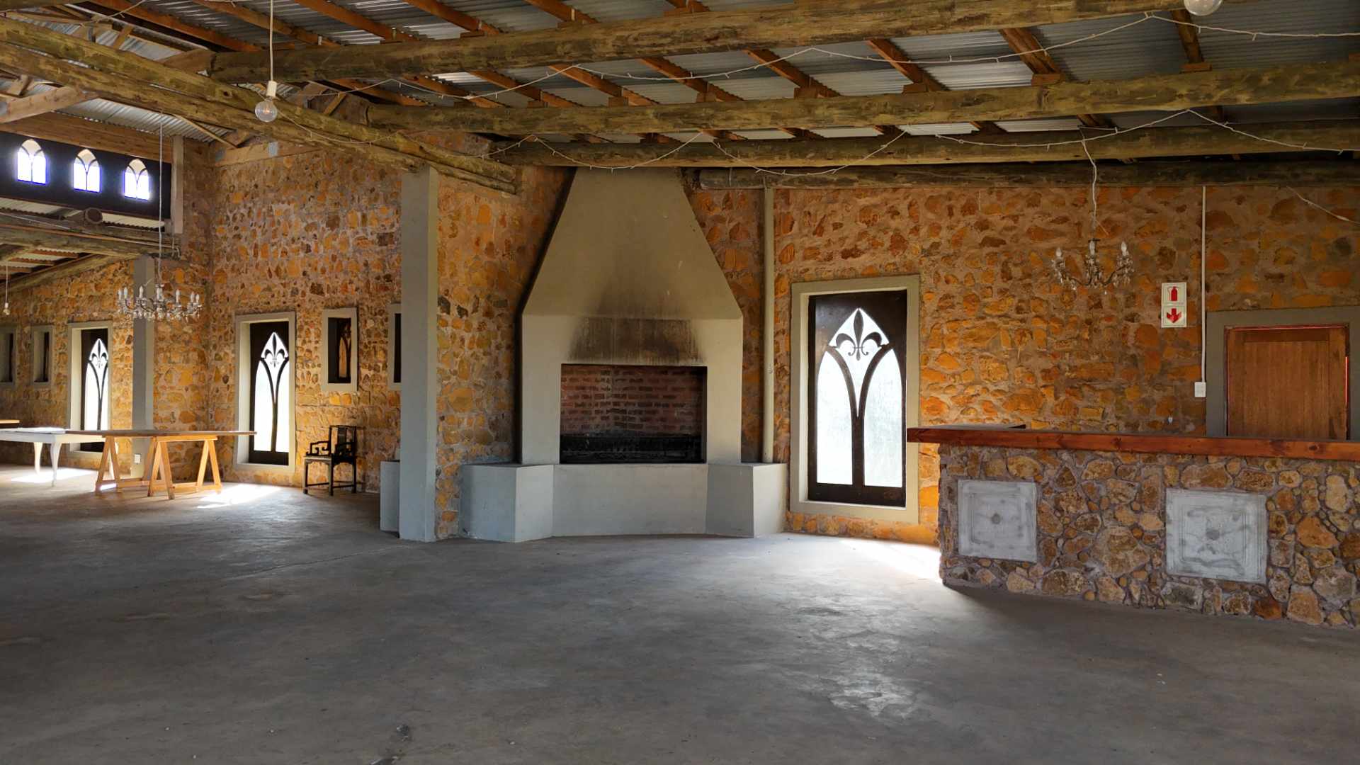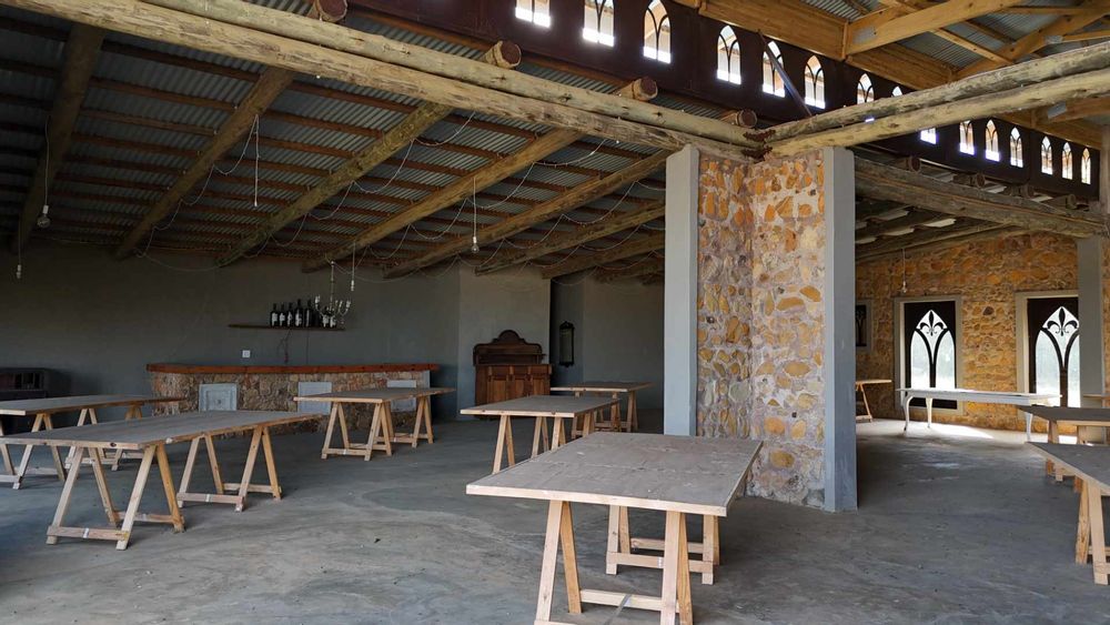 At the heart of the estate is a striking stone chapel with stained glass windows and exposed wooden trusses, comfortably seating up to 130 guests. The adjacent main reception venue, which seats 180, overlooks a tranquil dam and features a dedicated canape area, large entry doors, roaring fireplaces, a full bar, a catering kitchen, and rustic trestle tables - perfect for weddings, special occasions, and corporate retreats.