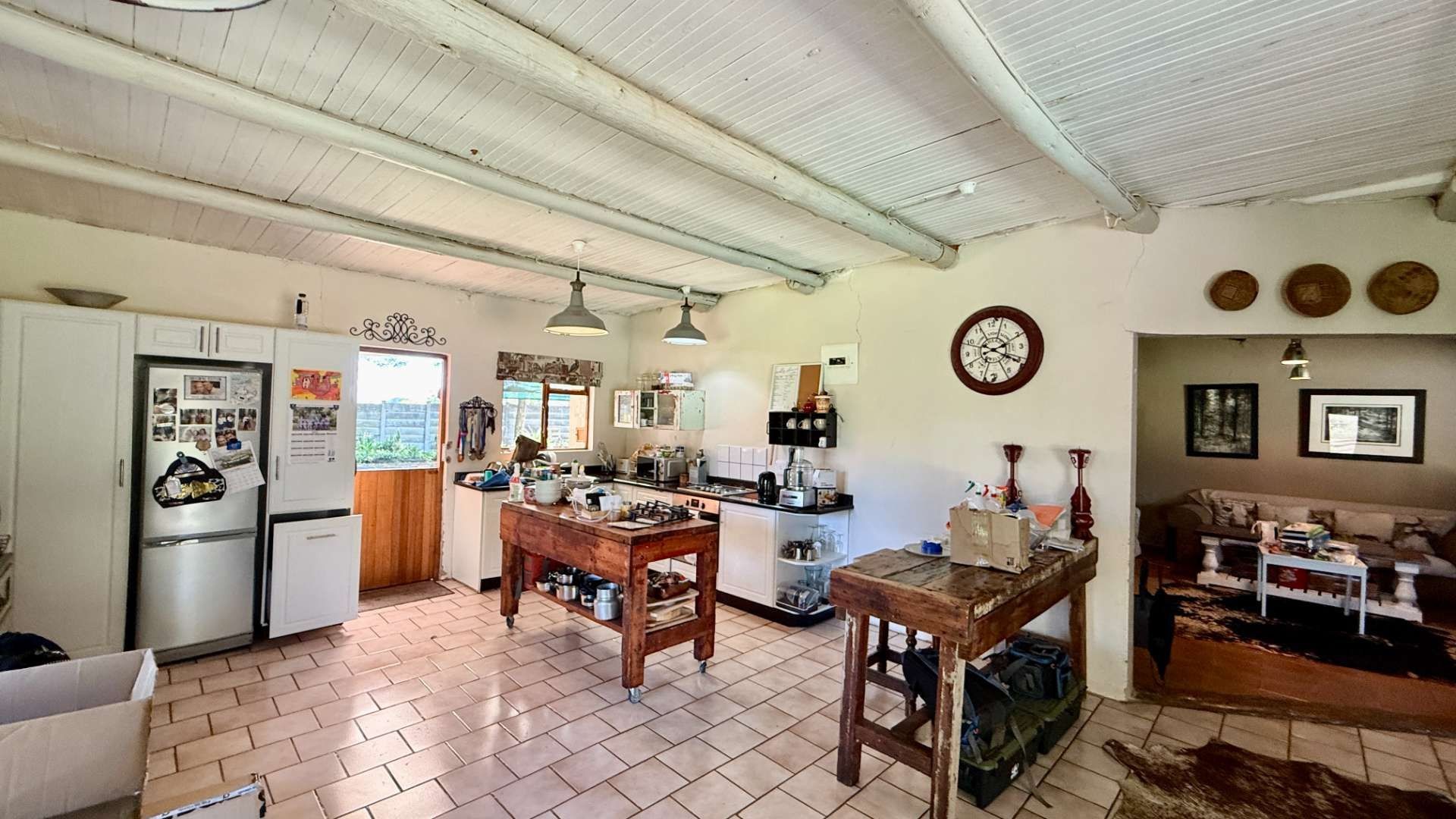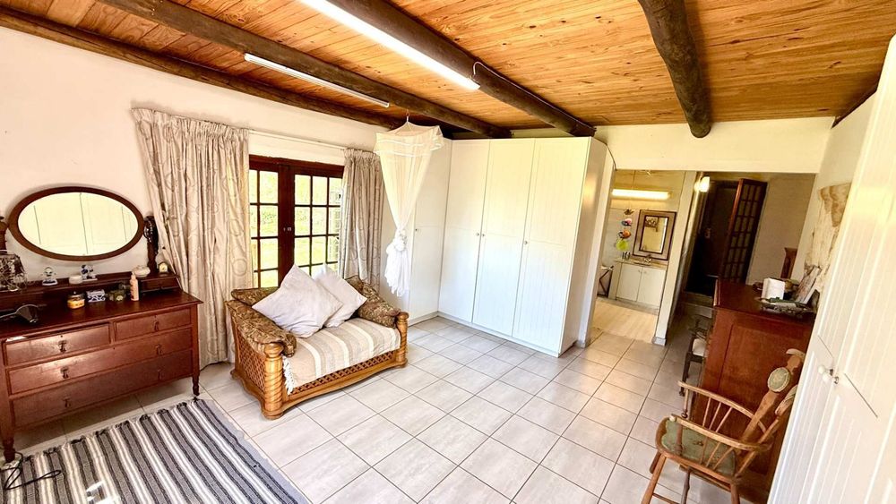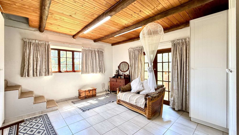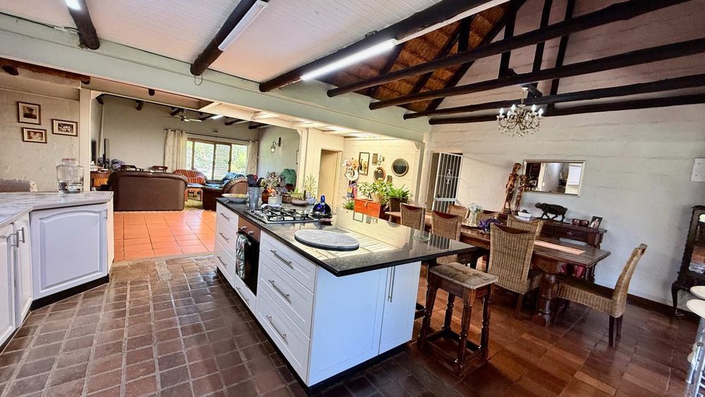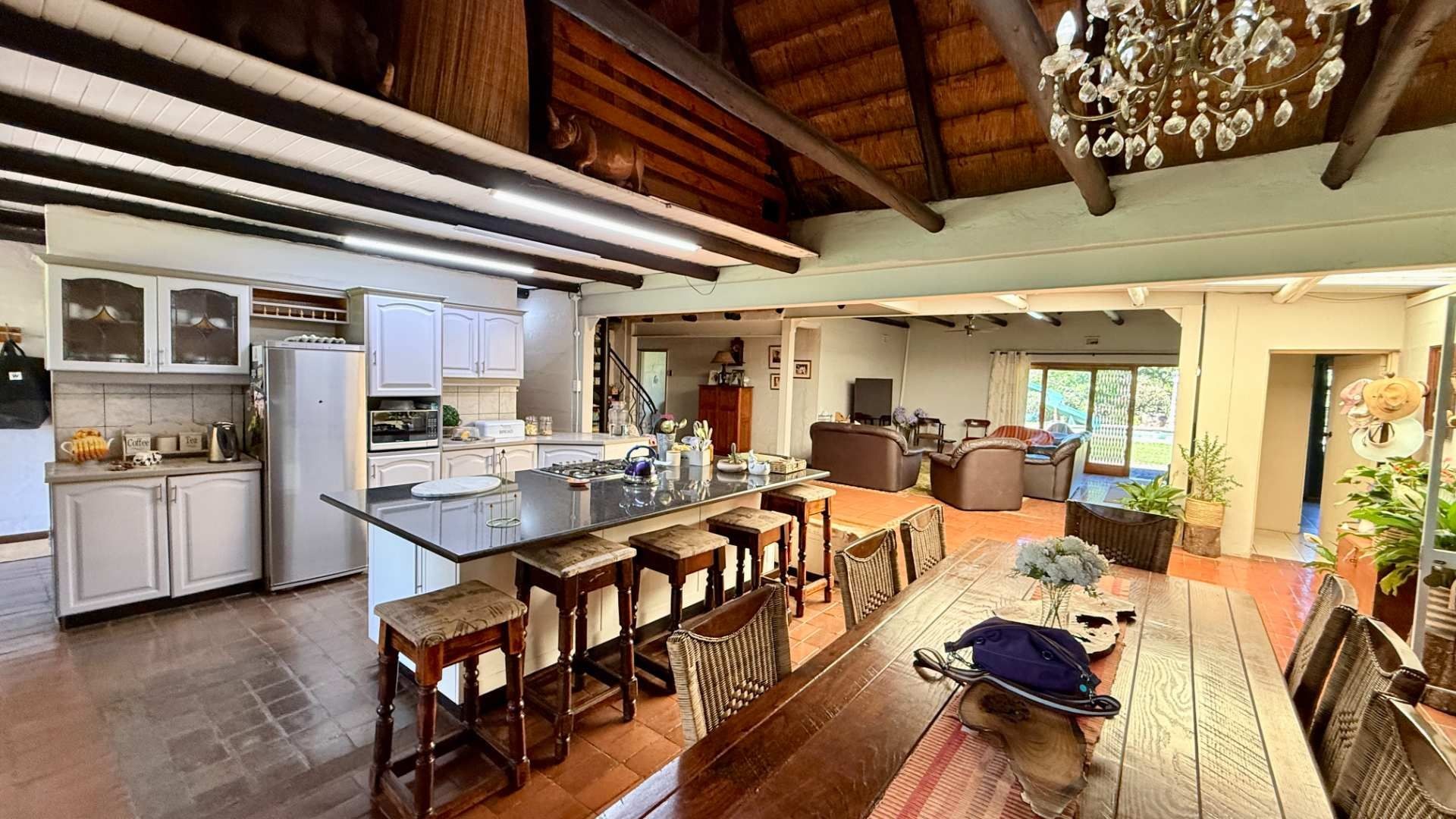 The main house is a spacious double-storey thatched home featuring four bedrooms, a large open-plan living and dining area with high ceilings, and a loft that can serve as a study, games room, or additional bedroom.