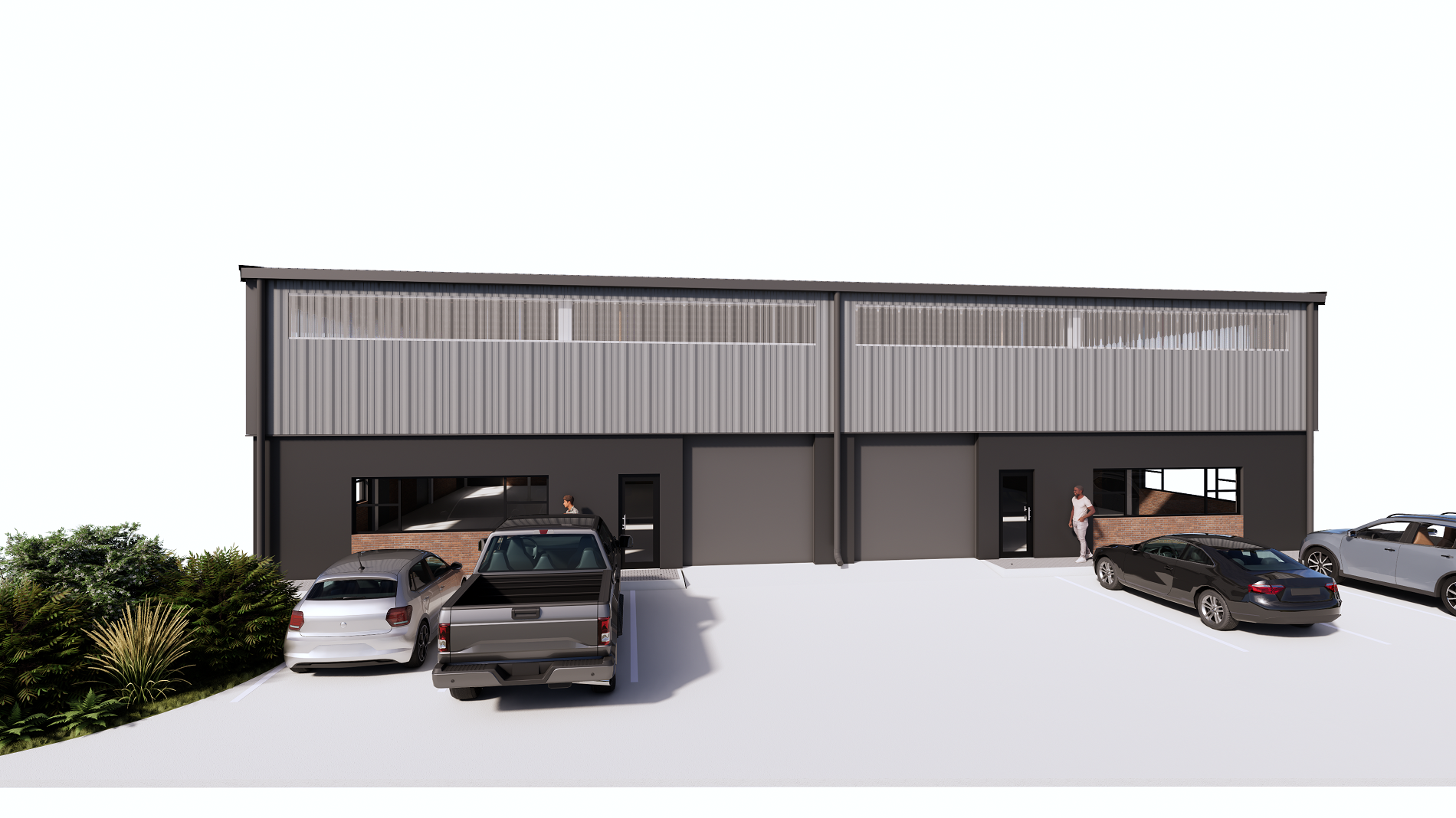 The development includes high-clearance roller doors, secure perimeter fencing, and space for vehicle access, loading, or outdoor storage. The wide street frontage allows for good visibility and future signage opportunities.