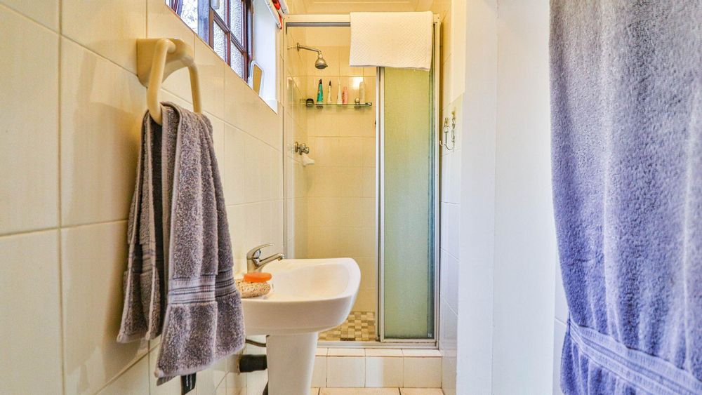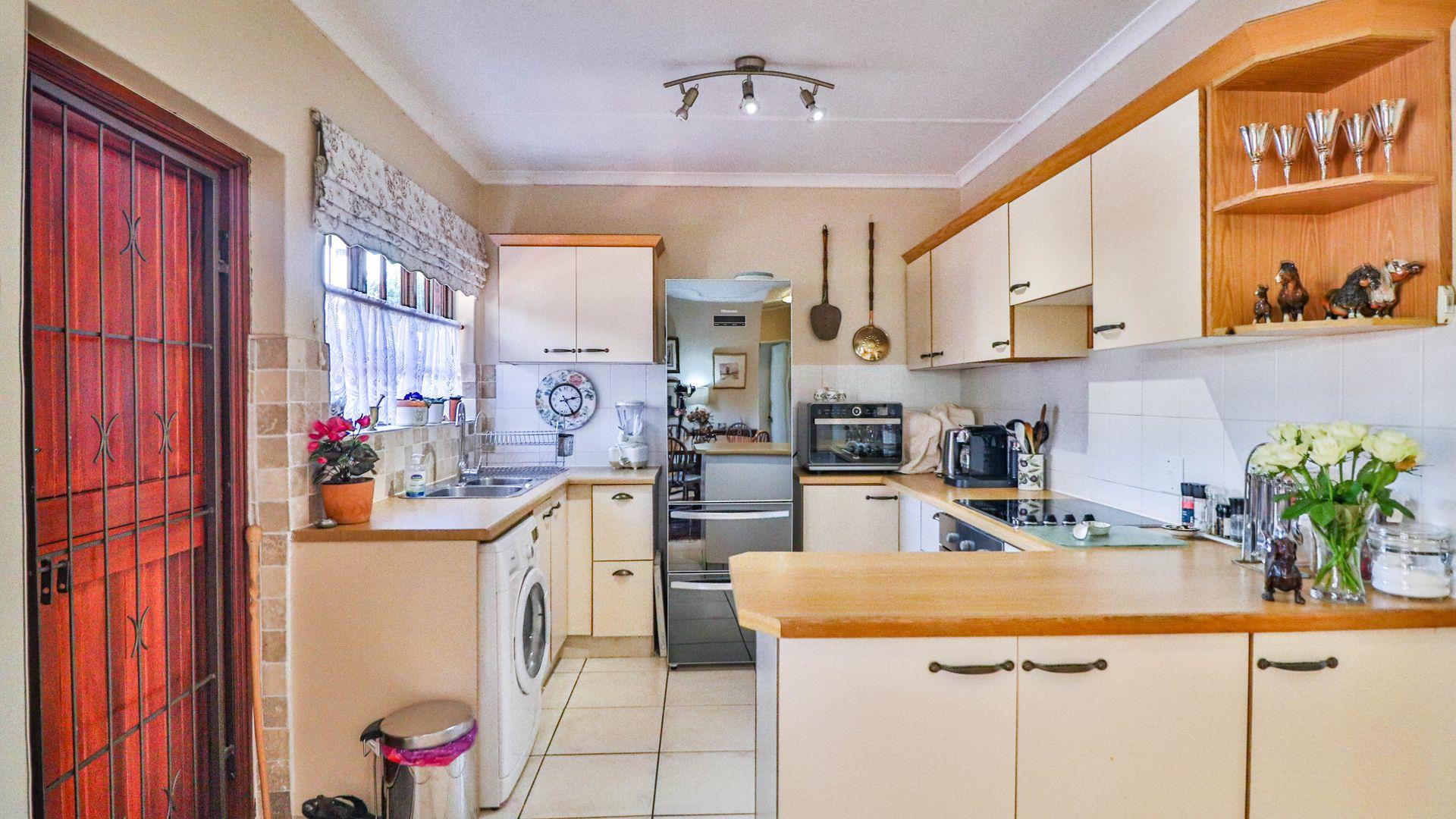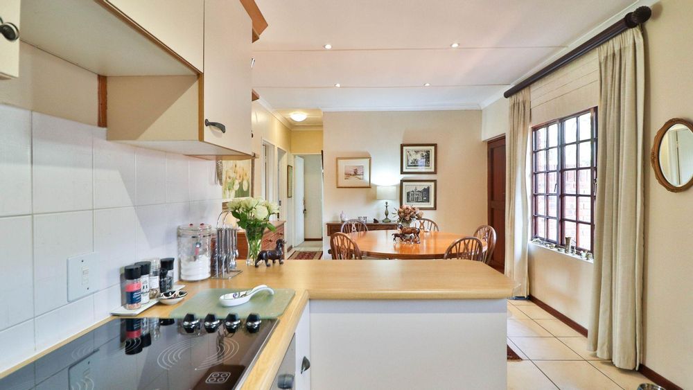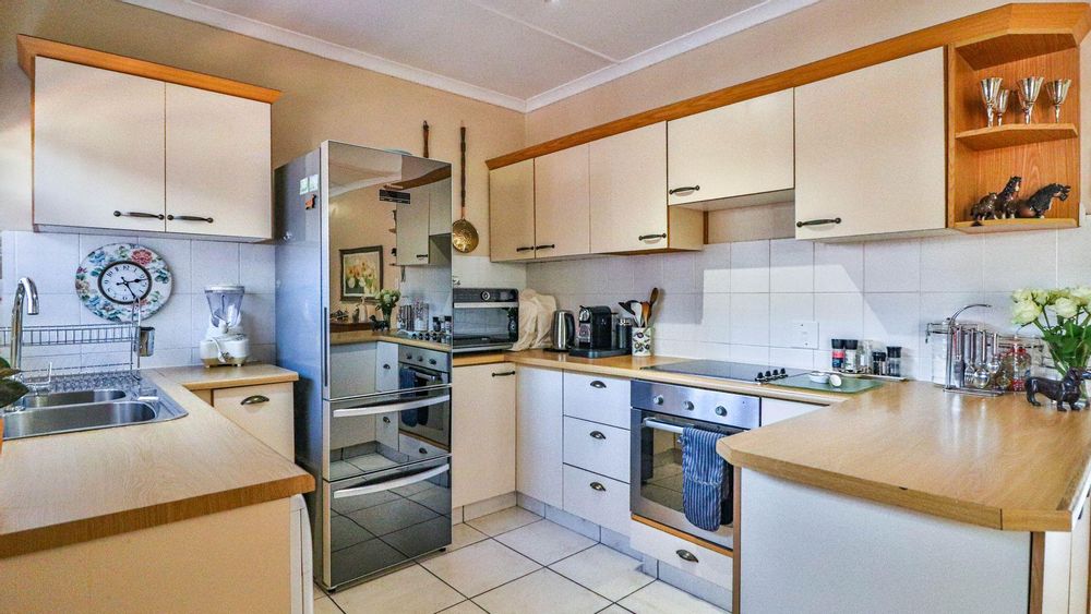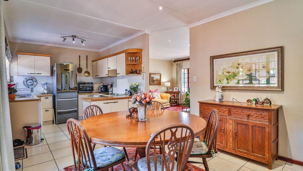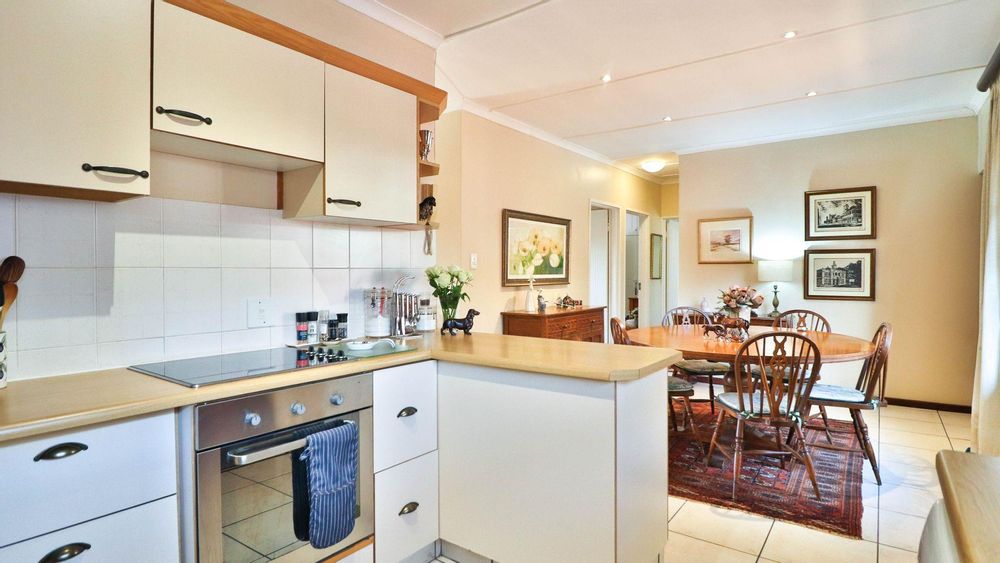 Set in a small complex of only five facebrick units, it’s wonderfully private and peaceful. The tarred driveway takes you to the single garage and front door, where you step into a bright, open-plan living space. The kitchen and dining area flow together easily, making it simple to cook, chat, and entertain all at once. The kitchen includes a breakfast counter, built-in oven and hob, a double sink, and plenty of cupboard space, with room for your undercounter appliance.