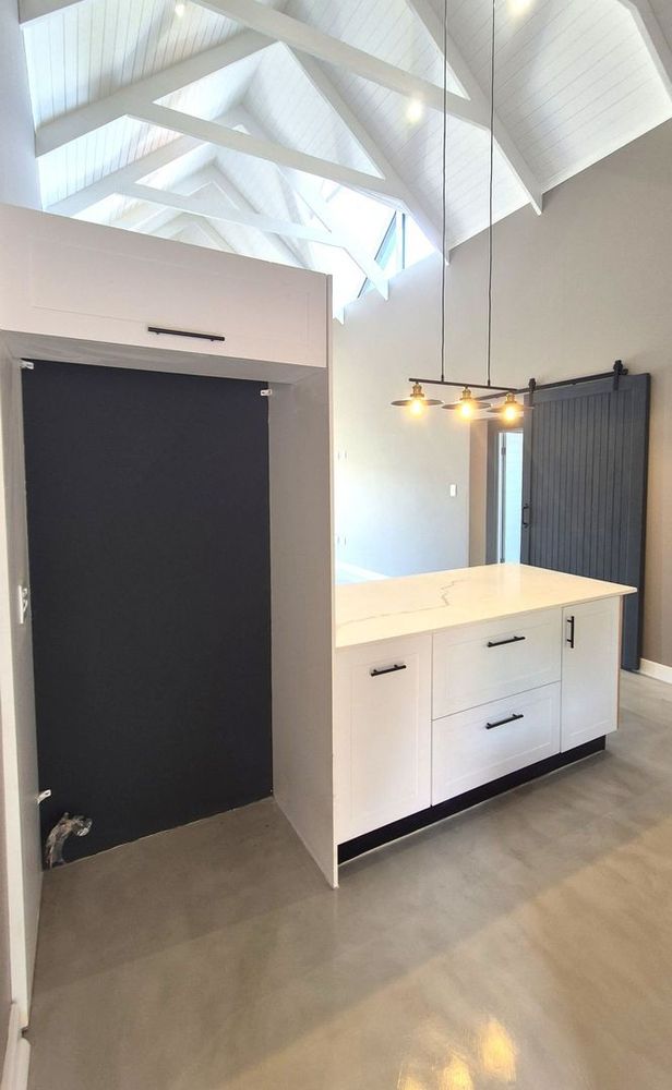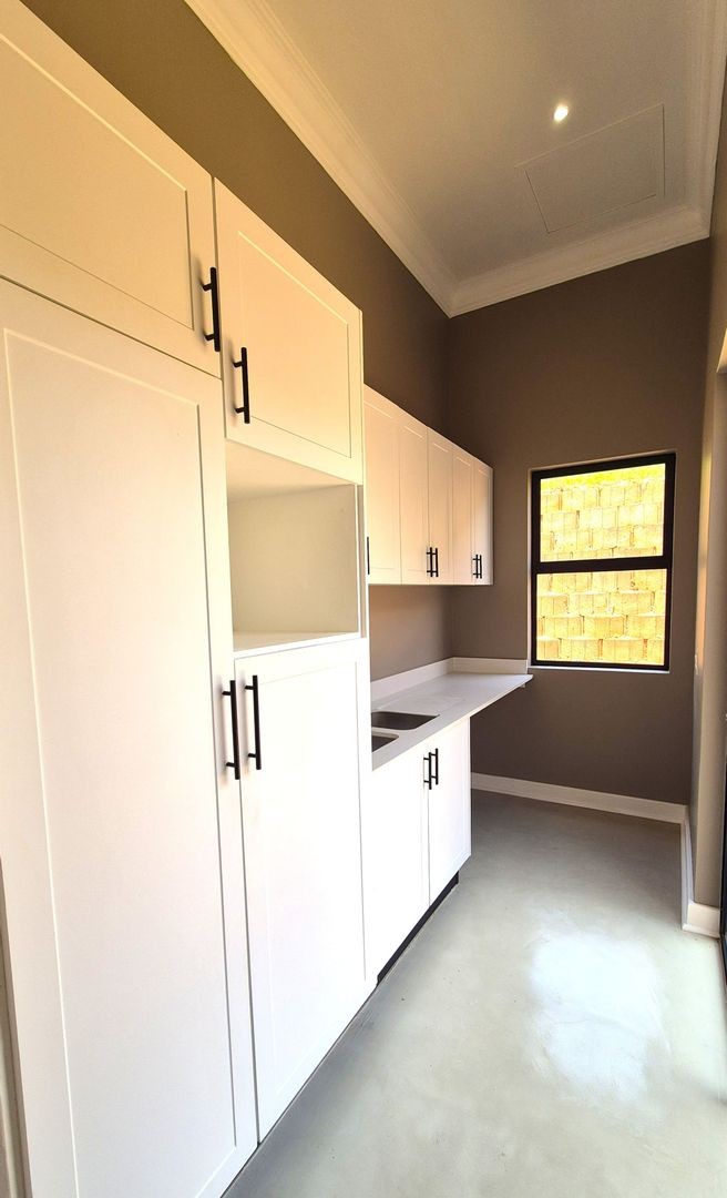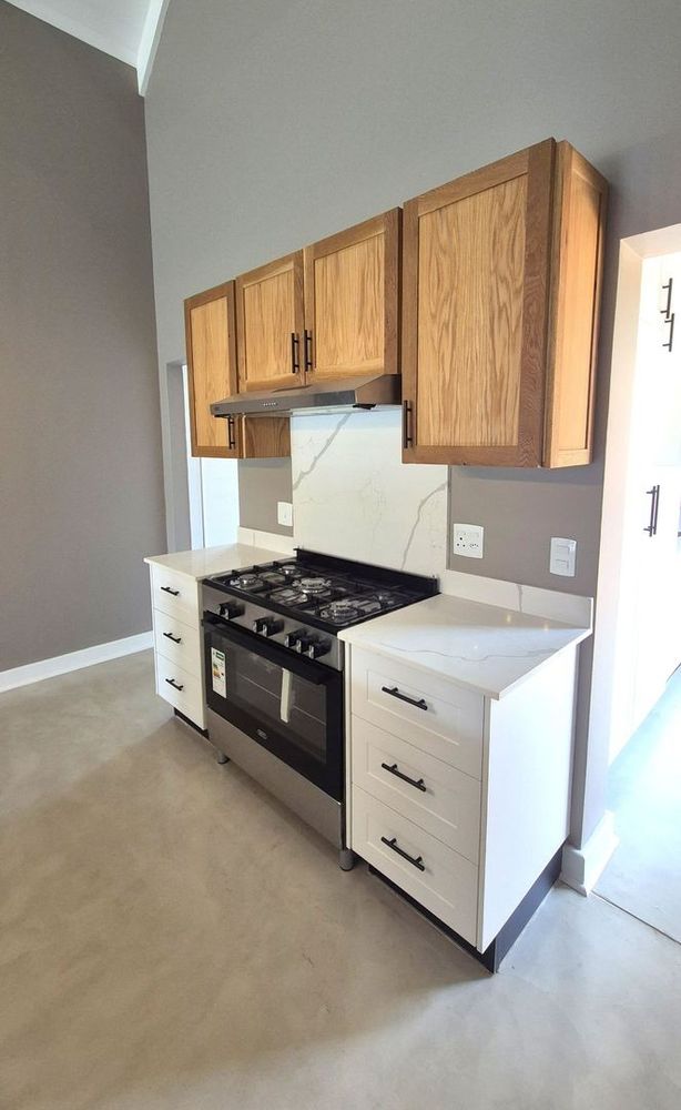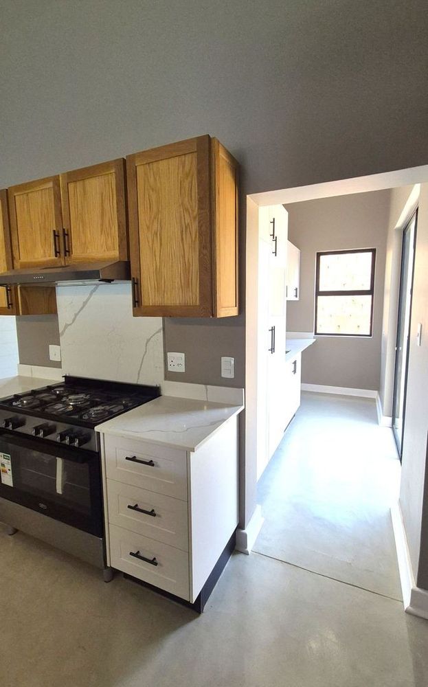 The kitchen is practical and modern, finished with Caesarstone countertops and fitted with a five-plate gas hob, oven and extractor fan. A gas geyser services the home. There is a separate scullery that leads out to a private courtyard, ideal for laundry and day-to-day utility use. A retaining wall at the back of the property creates an opportunity for a living wall or additional planting.
