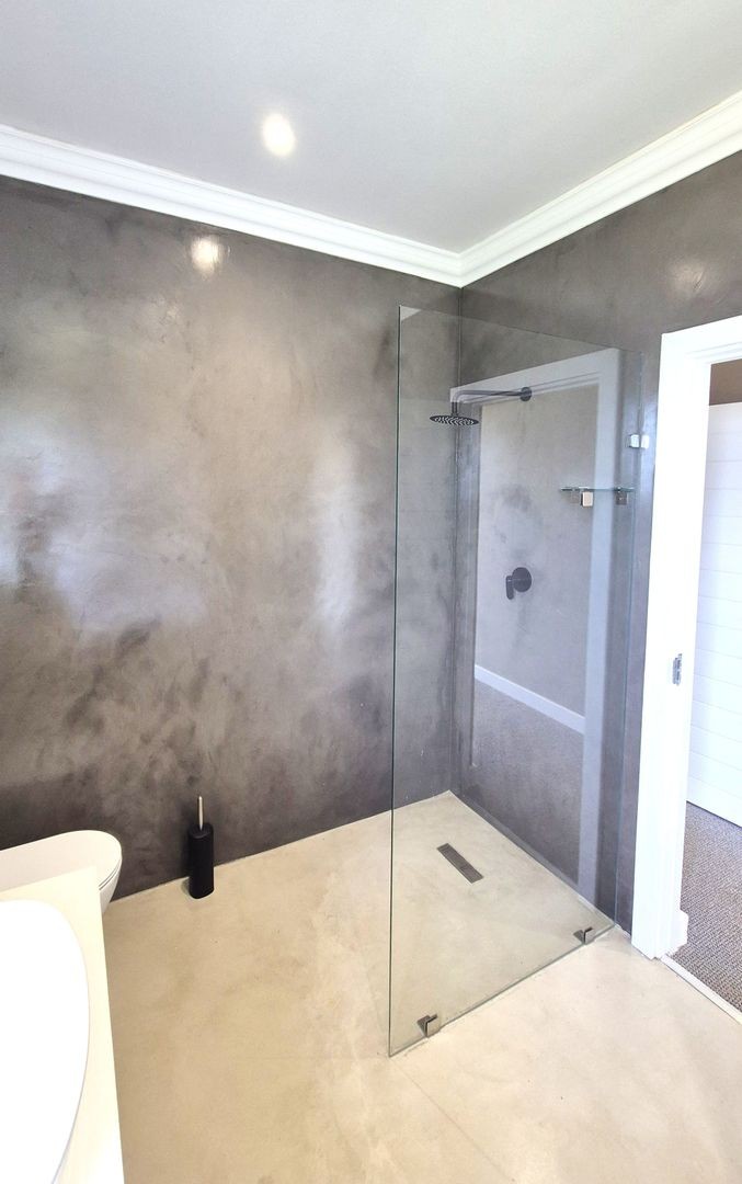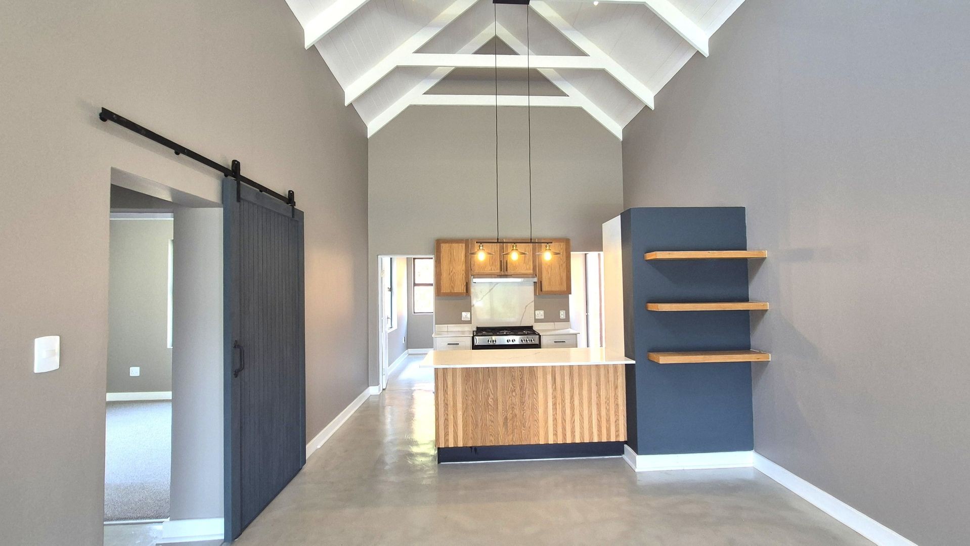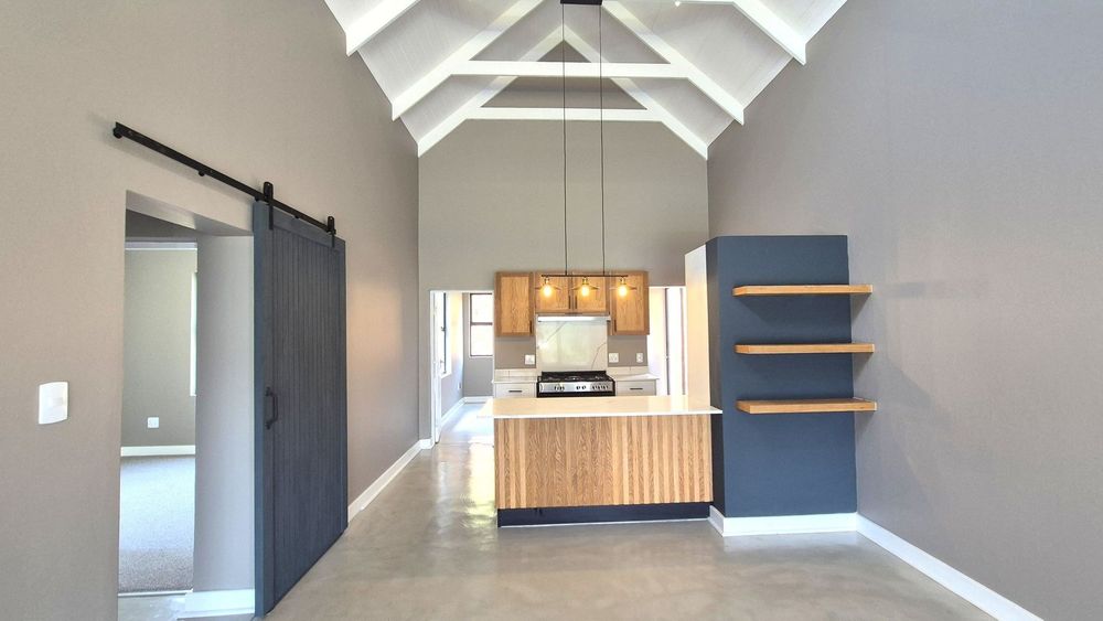 The lounge and dining area are open plan, with high ceilings and exposed beams, giving the space a sense of light and volume. Screeded floors run through the living areas, keeping the look clean and low maintenance. A sliding door opens onto a covered patio, which could be enclosed if more living space is needed in the future. The garden is neat and established, creating a pleasant outlook from the home.
