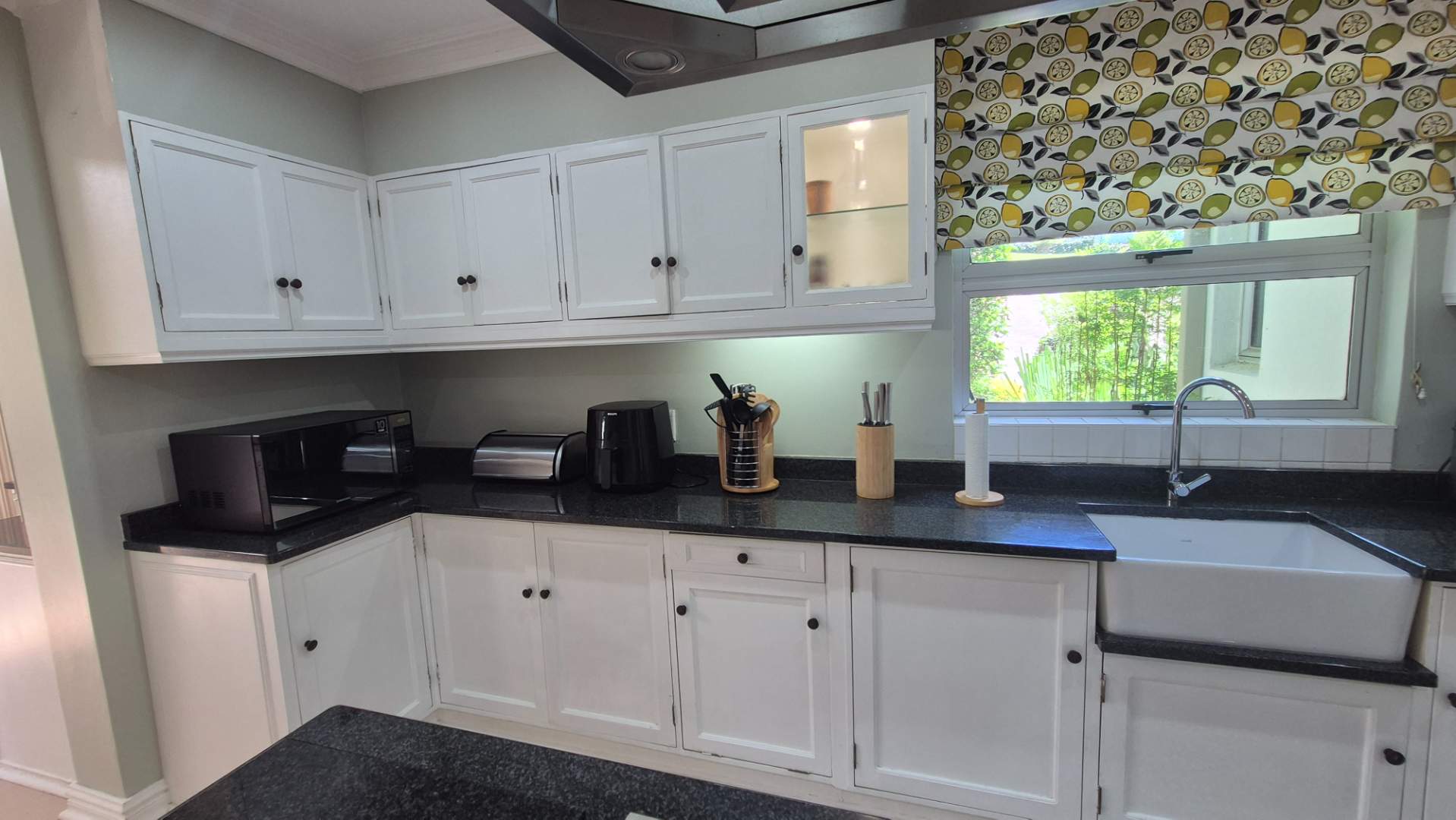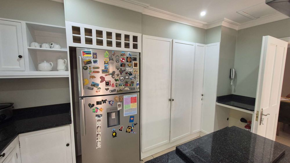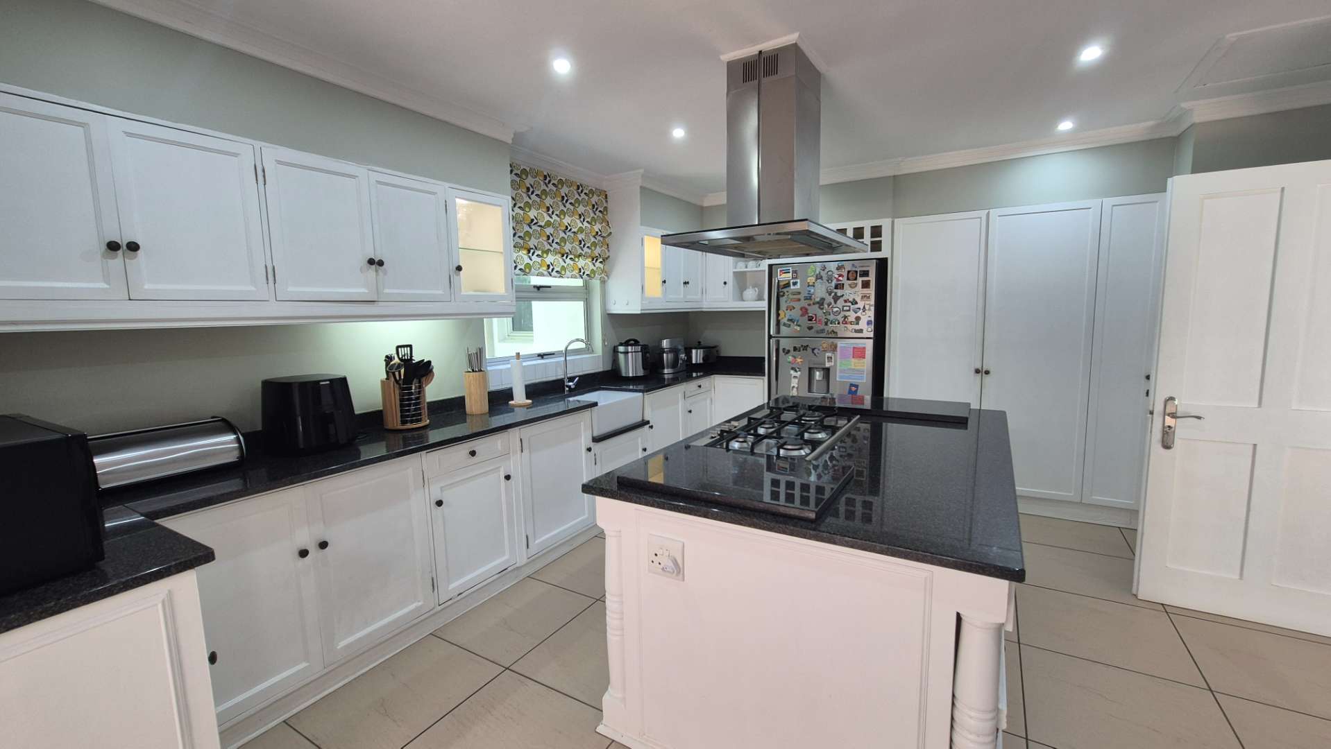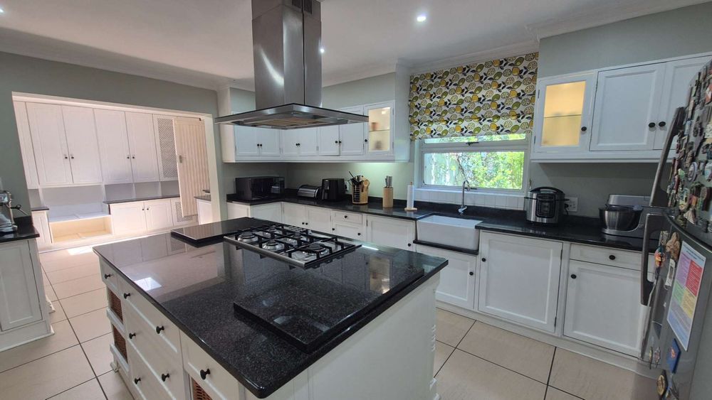 The heart of the home is the expansive modern kitchen with marble counter tops, a centre island fitted with a gas hob, electric oven and an extractor fan. On the other side of the island are drawers for storage. There is ample cupboard and counter space, with a butler sink and space for a wide single door fridge. A separate part of the kitchen has two corner cupboards, one that can house two appliances, more cupboard space and a double sink.