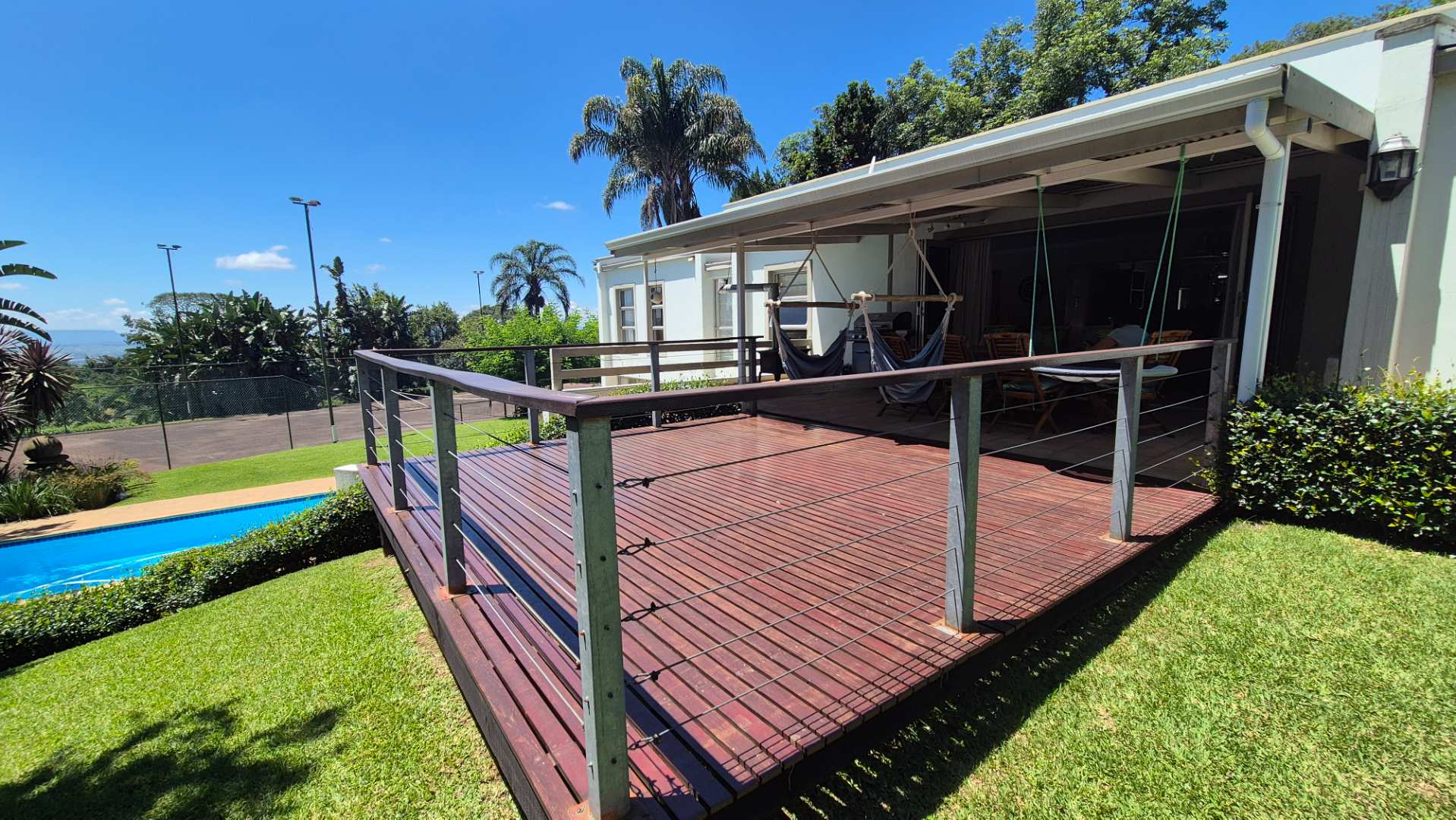 This leads to an enormous open-plan living area, designed for both relaxation and entertaining. Floor-to-ceiling stack doors open onto a covered verandah and wooden deck, offering seamless indoor-outdoor flow and breathtaking views of the garden and sparkling swimming pool below. A staircase leads directly down to the pool area for easy access. This living space is further enhanced by wall-to-wall cupboards, a central TV nook, and a cleverly designed study nook with a built-in desk and additional storage around the corner.