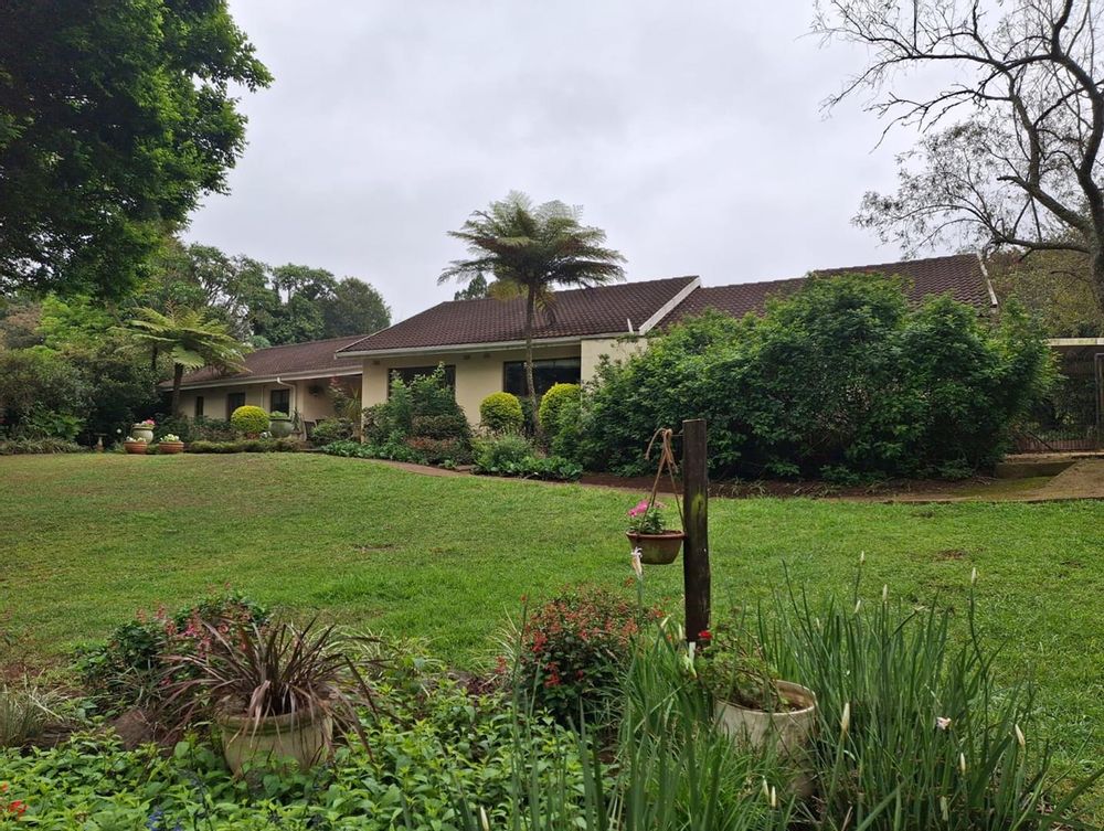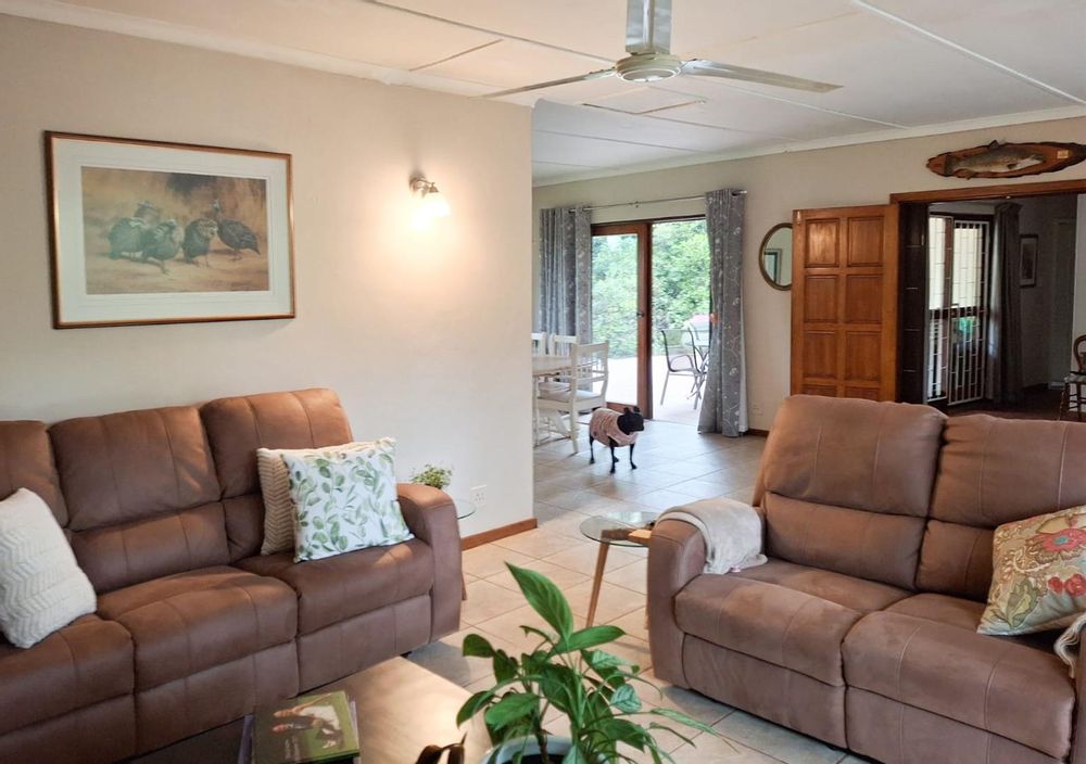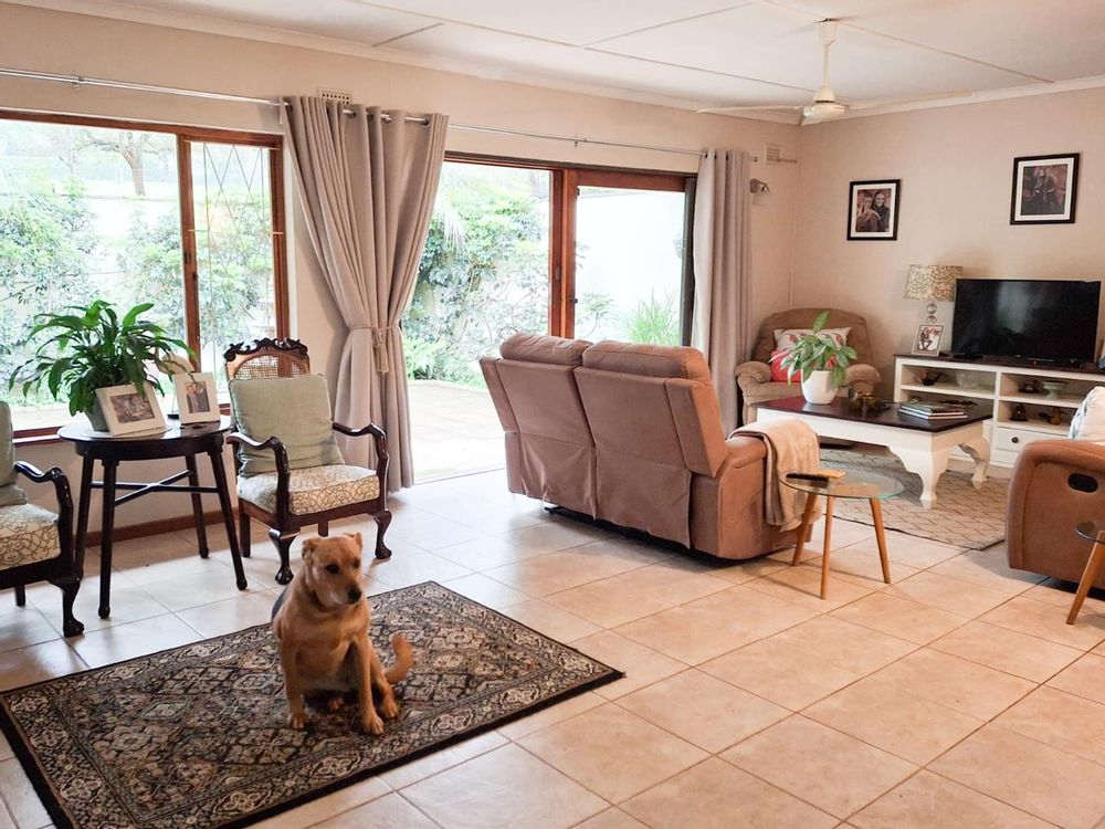 The kitchen is spacious with plenty of counter space. There is a built-in oven with separate hob, perfect for cooking wonderful family meals. The kitchen leads into a bright dining-room and then into an expansive lounge. Double doors flow out from the lounge into a private court-yard with fountain and provides a sunny area and a beautiful space to relax. The dining-room also has doors out to a paved patio overlooking slightly sloping green lawns with beautiful gardens – including a feature pond and hidden pathways.