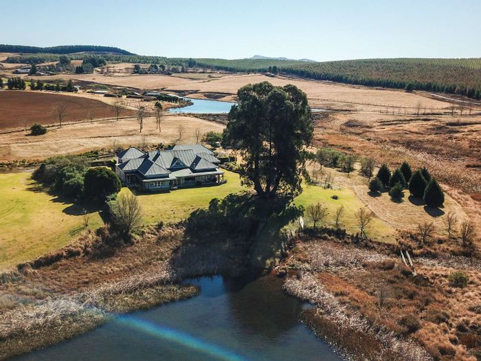 The home itself is thoughtfully designed with a practical, flowing layout. One wing features three spacious bedrooms and three modern bathrooms. The kitchen is well-appointed with a built-in oven and hob, plus a separate utility area. Stairs off the kitchen lead down to a private wine cellar. There is generous dining room, plus a spacious lounge that leads through to the sun-room. Openings lead out onto a lovely paved entertainment area overlooking a tranquil pond and stunning views. Fireplaces in the lounge, dining-room and kitchen ensure that you keep warm during winter.